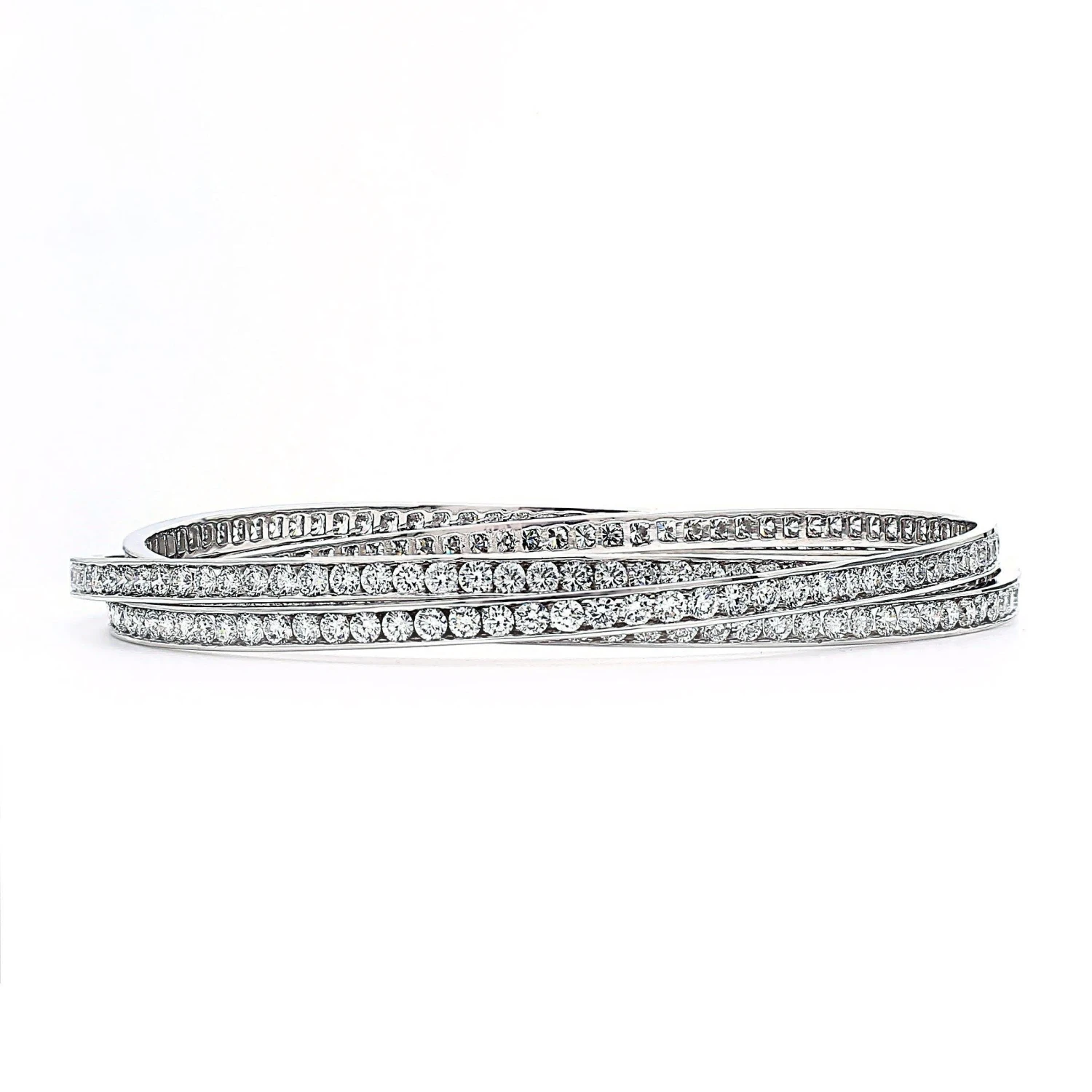 Each bangle is channeled with a row of round lab created diamonds with a color ranking of F-G and VS-SI clarity for a total weight of 14.0 carats. A mix of glamour and elegance, this bangle is approximately 2.5 in diameter for a slender slip-on design.