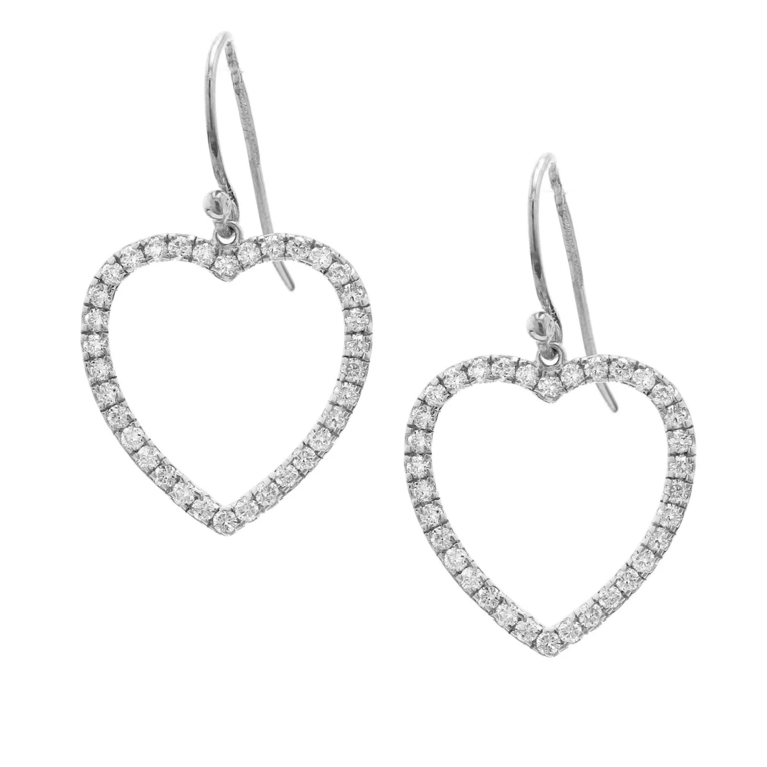 These darling lab grown diamond heart earrings are a certain favorite. Created in 14K yellow gold, the eye is drawn to the open heart shaped diamond lined drops. The 1.00 carat total weight of brilliant round cut lab created diamonds have an F-G coloring and VS-SI clarity rank. A delightful look she is certain to adore, these earrings are polished to a brilliant shine and suspend freely from French wire backs.
