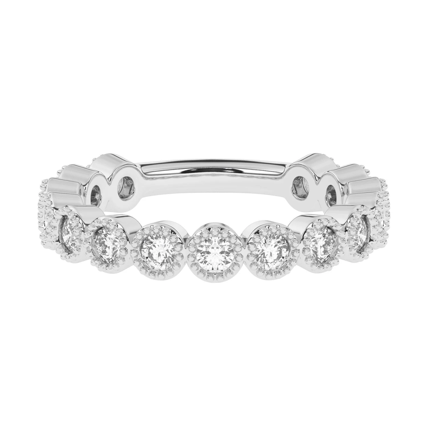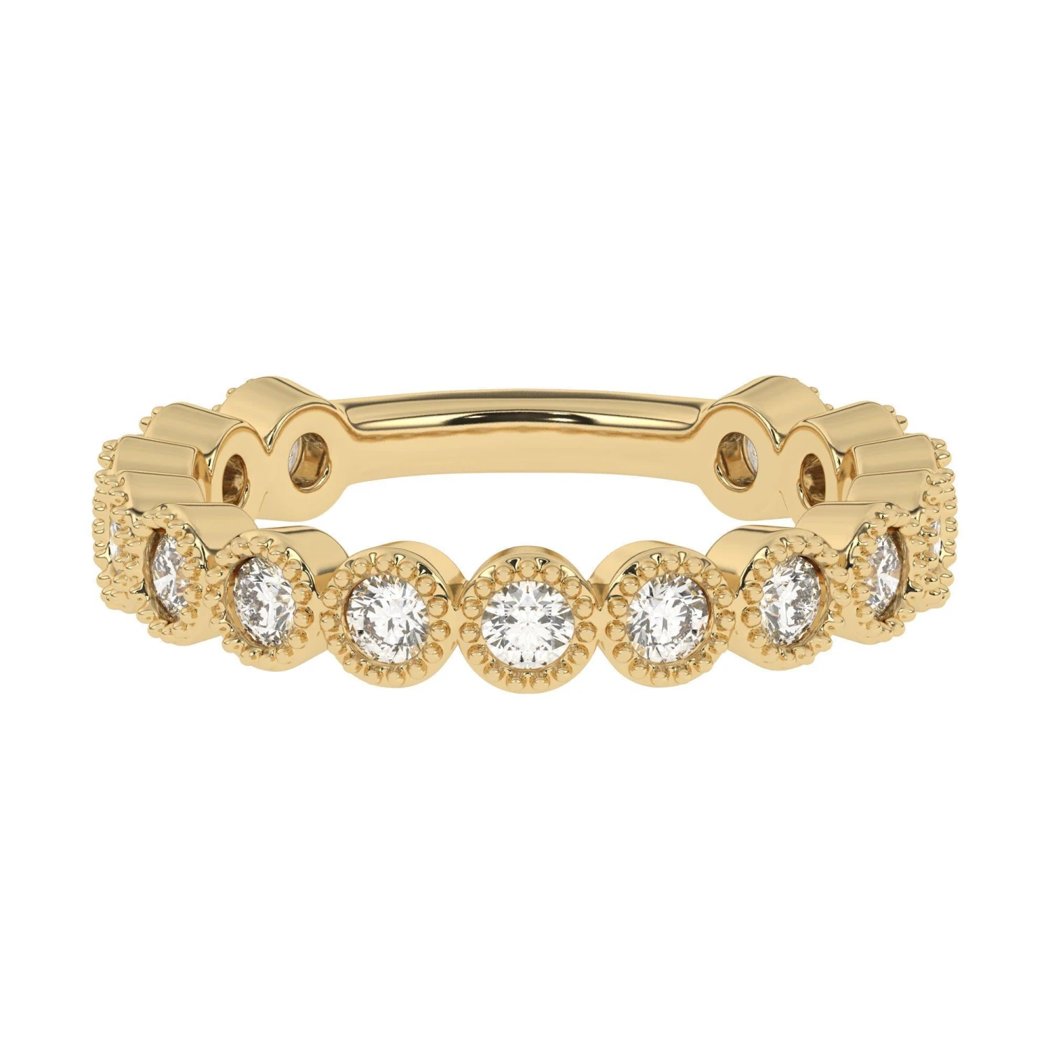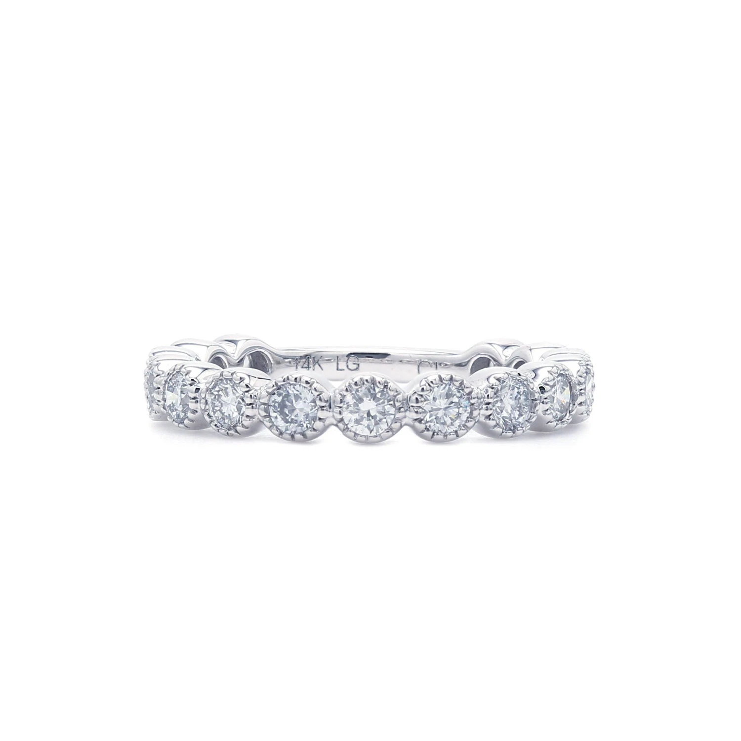 Stunning in 14K white, yellow or rose gold, glittering round lab grown diamonds totaling 1.00 carat are bezel set along the band. Intricate milgrain detailing borders each round F-G, VS-SI lab diamond. Polished to a brilliant shine and a bit of vintage flare, this ring is destined to become one of her most treasured pieces.