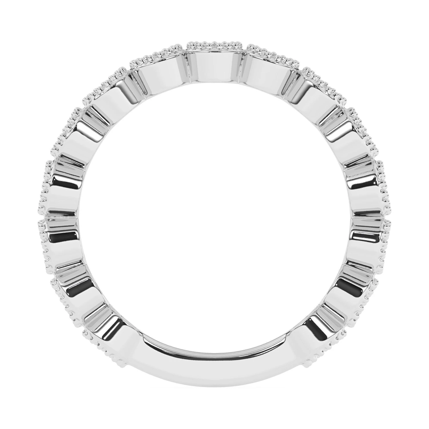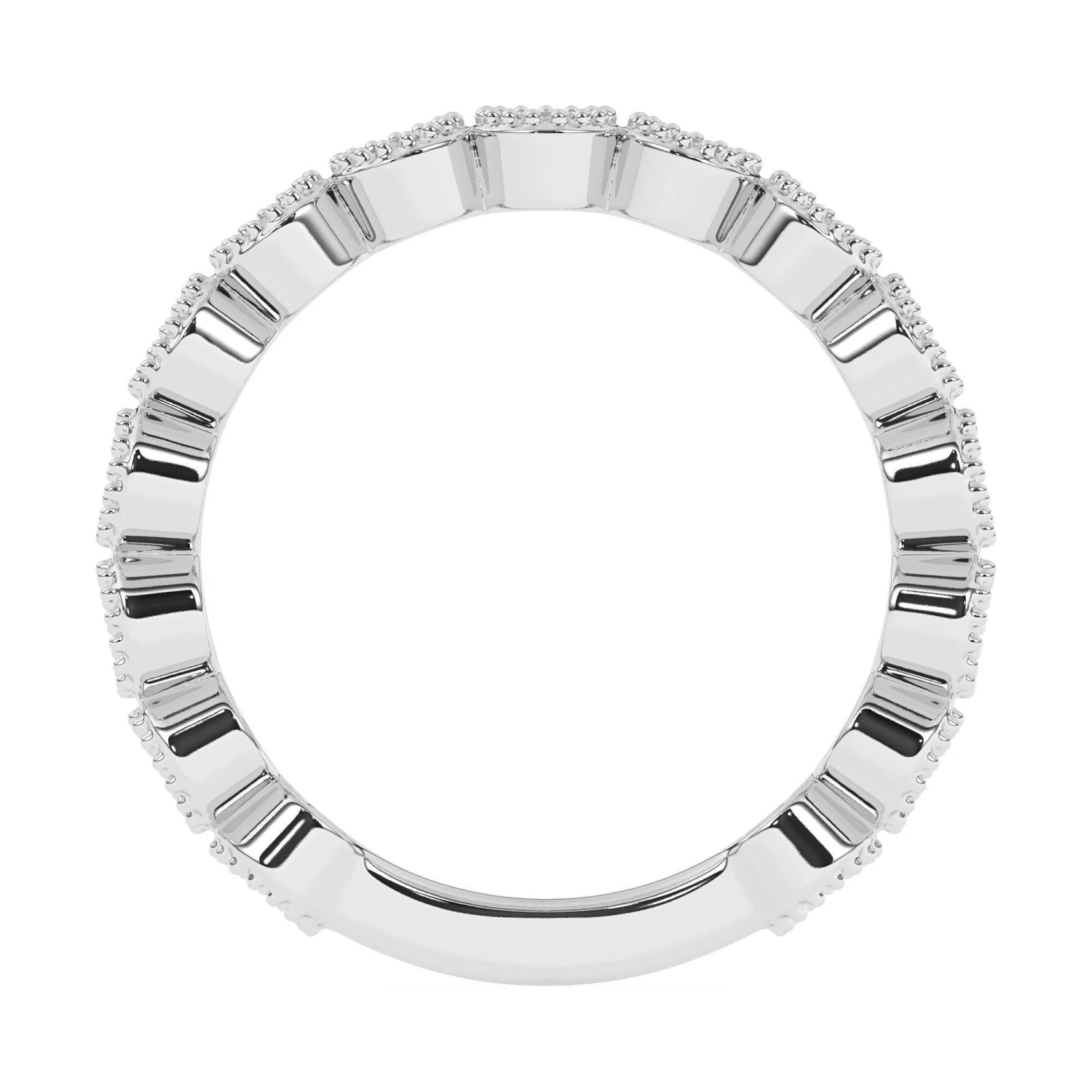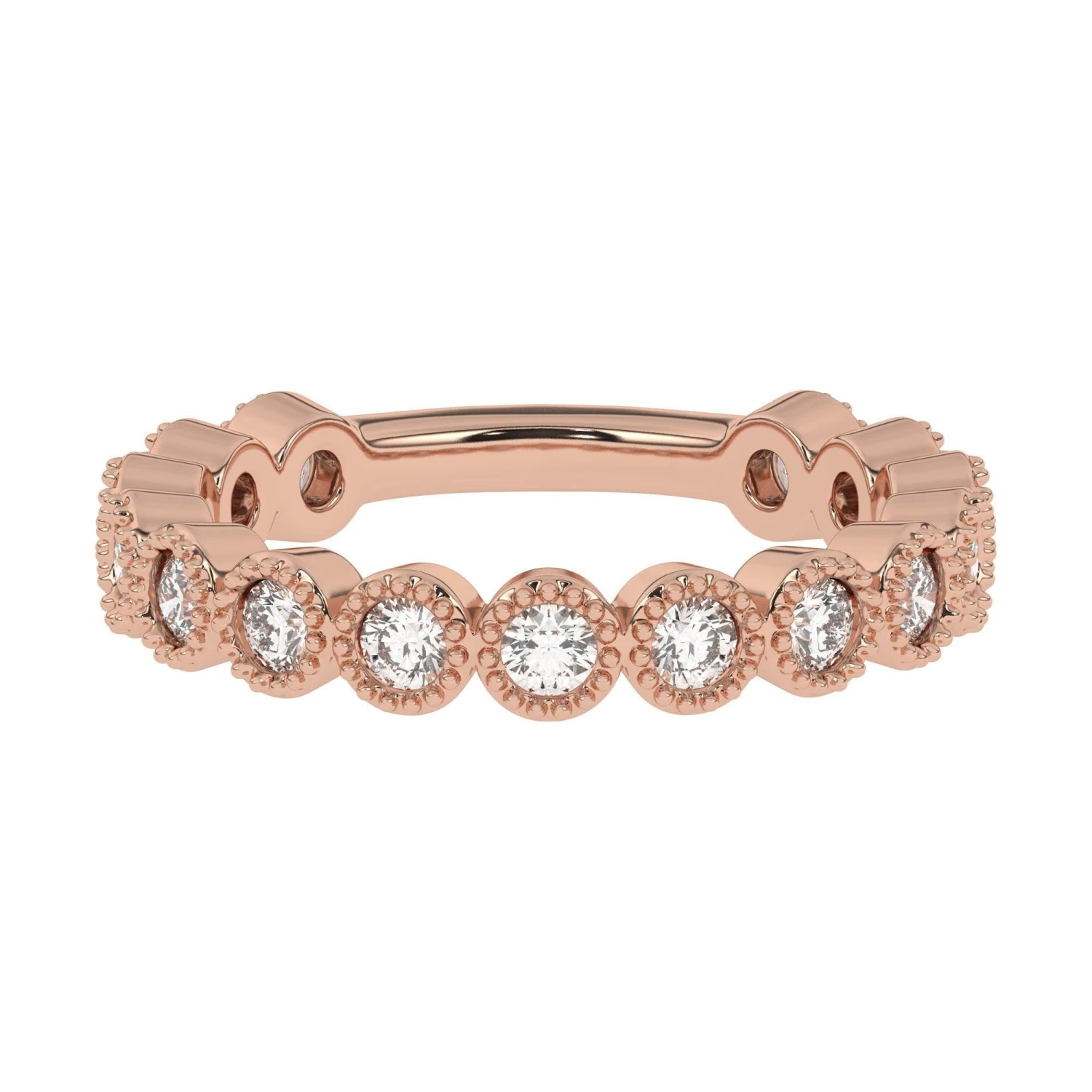 Stunning in 14K white, yellow or rose gold, glittering round lab grown diamonds totaling 1.00 carat are bezel set along the band. Intricate milgrain detailing borders each round F-G, VS-SI lab diamond. Polished to a brilliant shine and a bit of vintage flare, this ring is destined to become one of her most treasured pieces.
