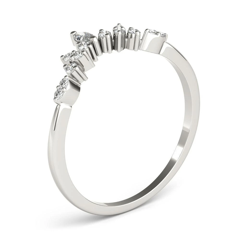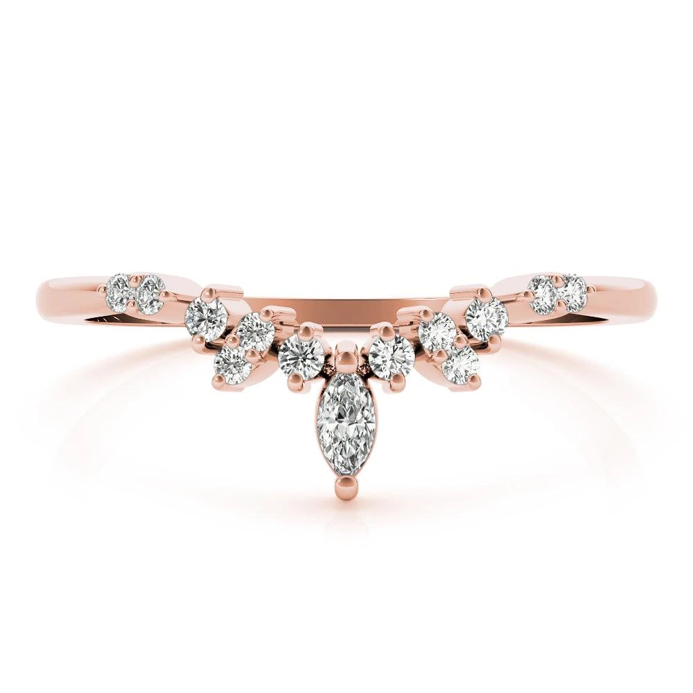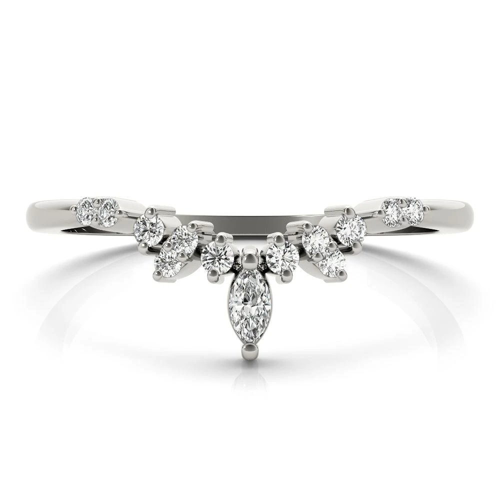 Add some flair to your everyday look with the Astrid Chevron Band. The 4×2 marquise center lab diamond and round lab diamonds in a bezel setting add sparkle and sophistication, totaling 1/5 carats. Elevate your style with this unique and elegant chevron band.