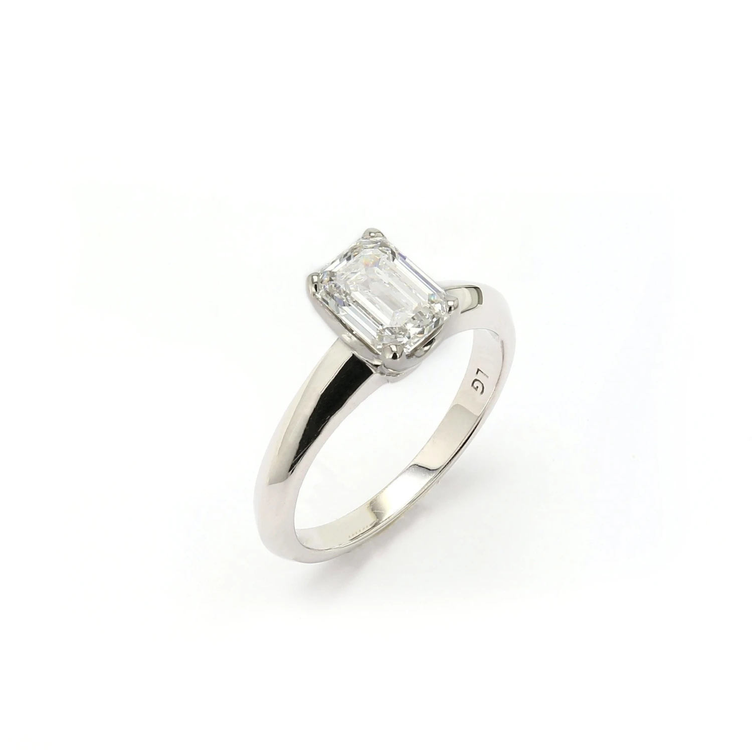 This classic solitaire setting features an impressive four prong mounting in a band of platinum or gold with high polish finish.