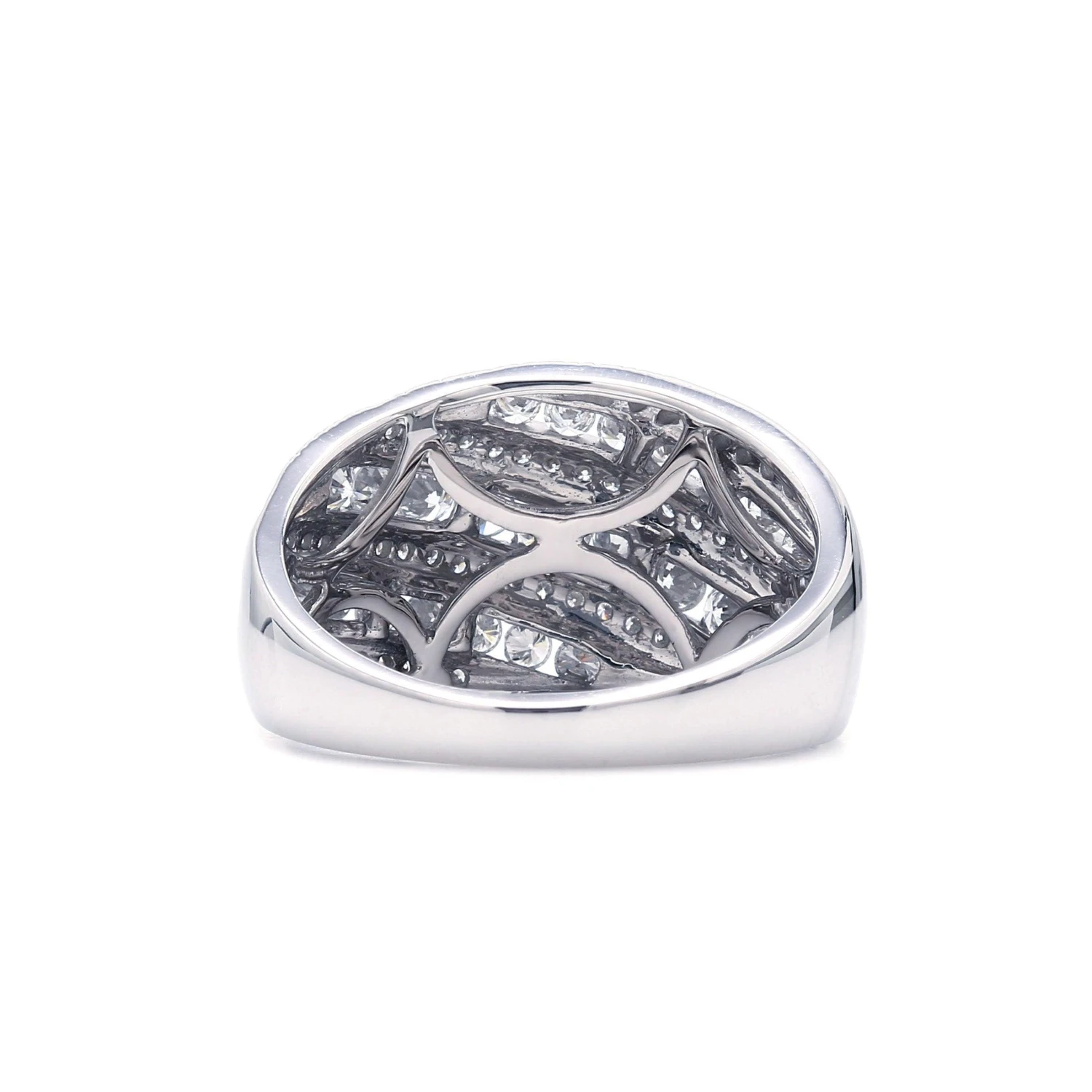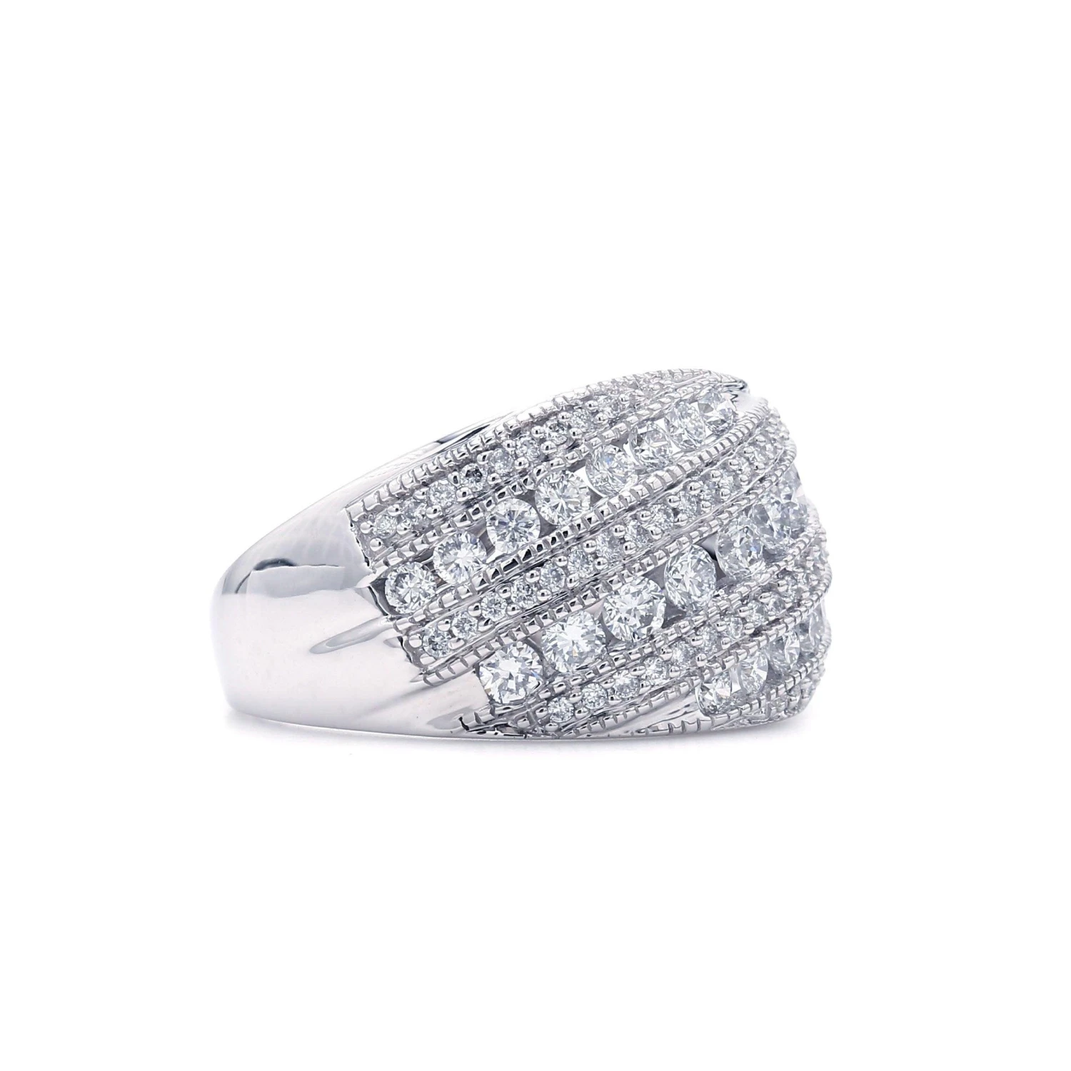A striking band style. This 1.00 carat total weight band features alternating rows of wide and slender lab grown diamonds in a wide band fashion. The lab grown diamonds have a sparkling F-G coloring and VS-SI ranking. This fashionable 14K gold ring is a great look any time.