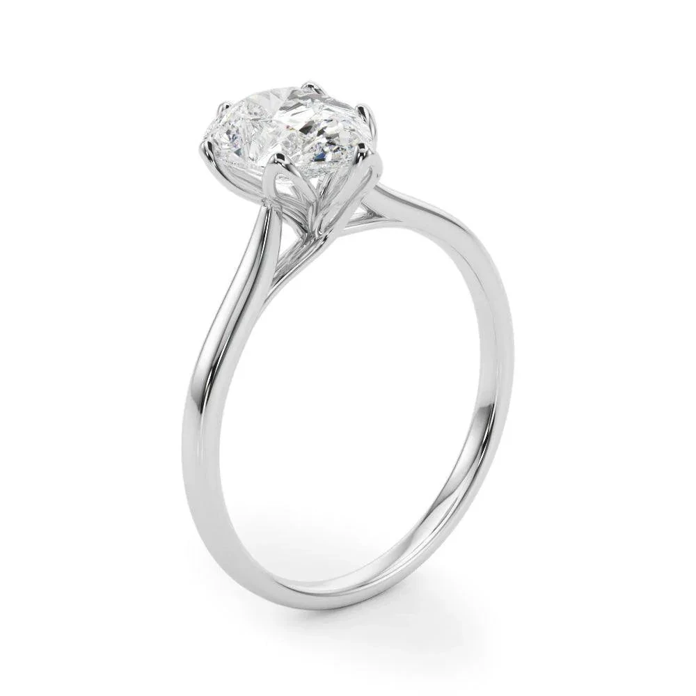 The Carly Solitaire pear shaped G VS center lab grown diamond is a sparkling precious option for flower-lovers looking for an engagement ring. Its petal prong design offers subtlety and elegance, perfect for those who want to make a subtle statement.