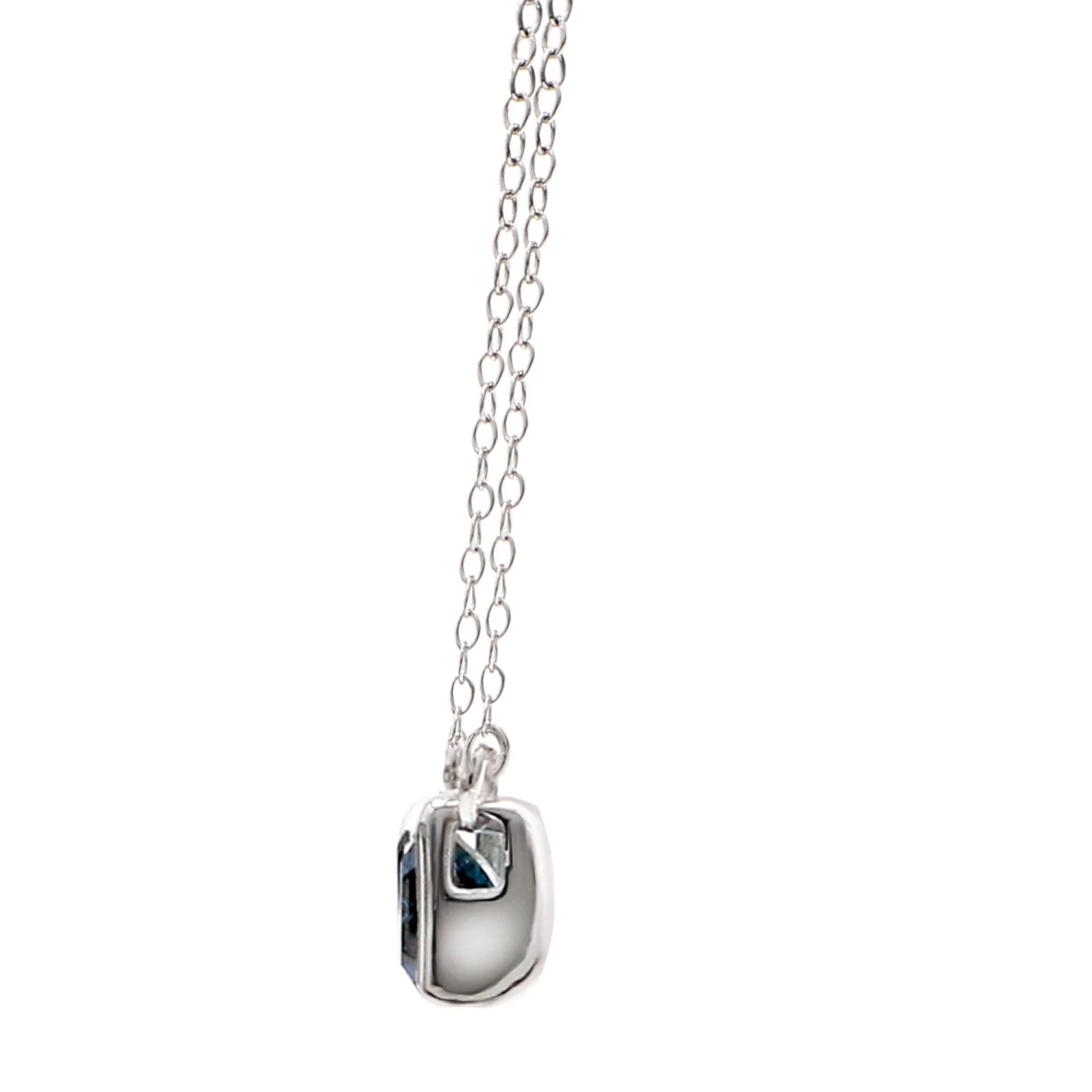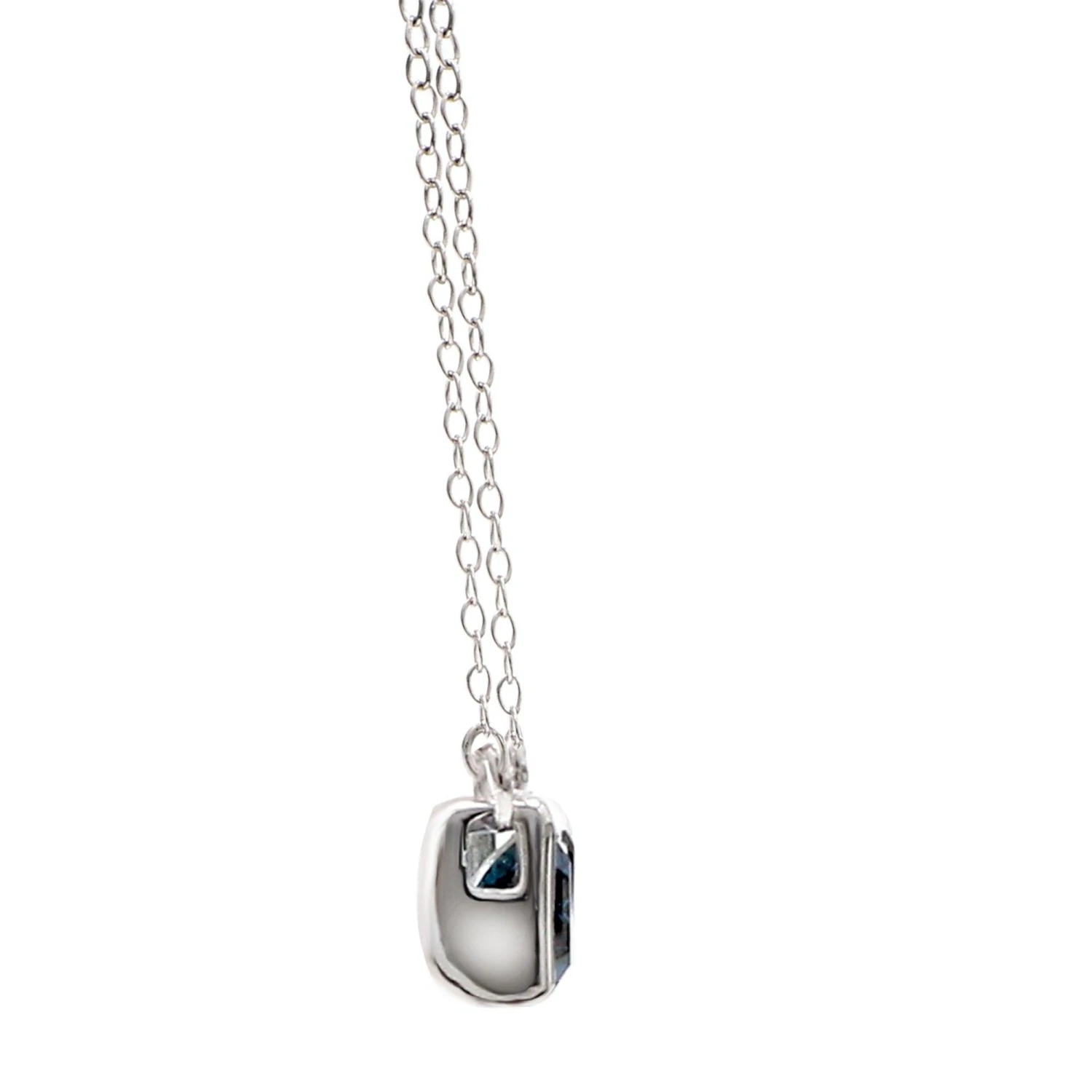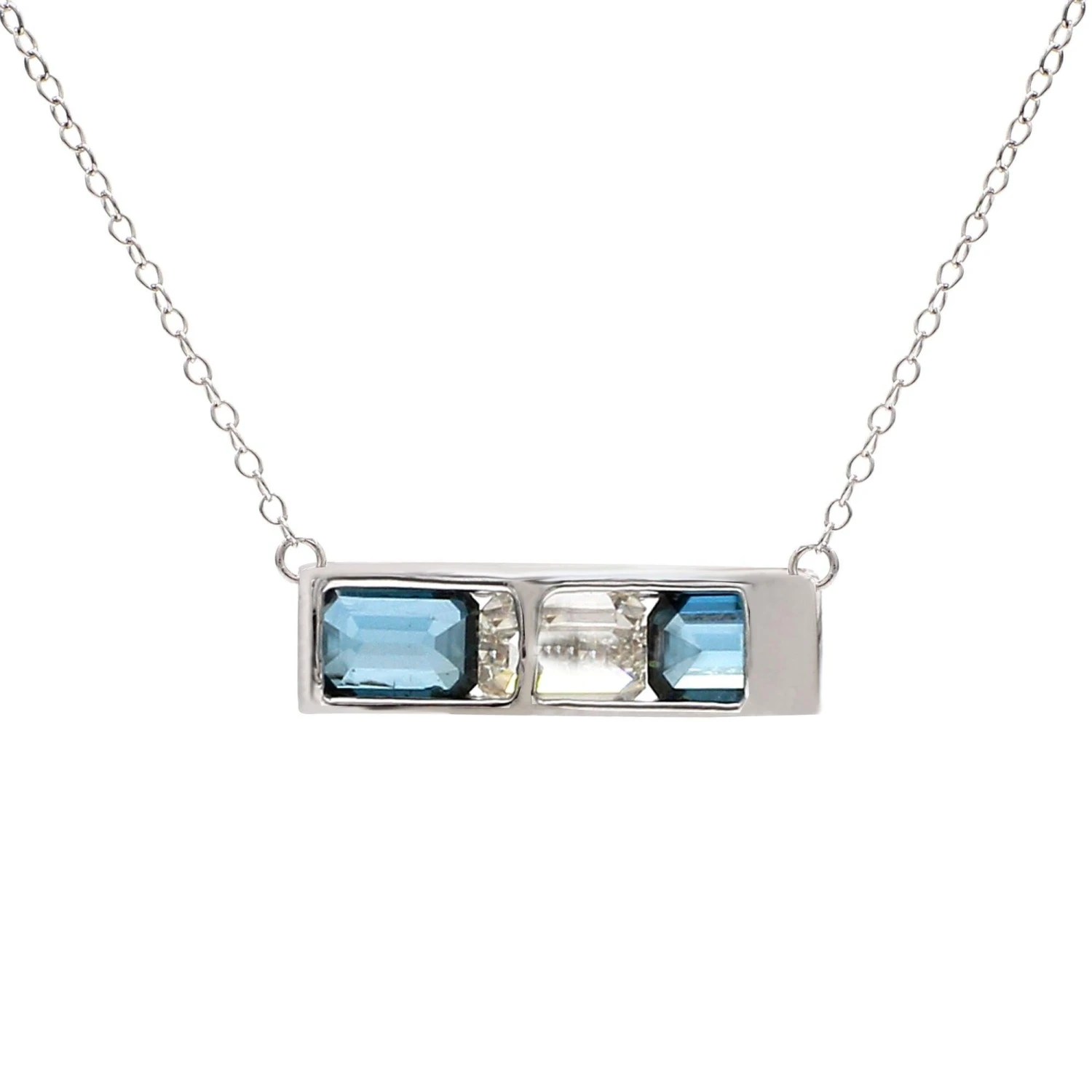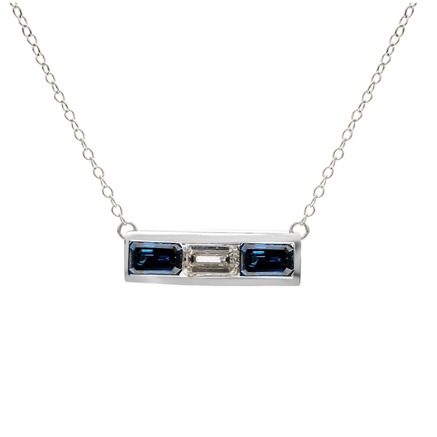 Fashionable sweet bezel look in a 1/2 carat total weight lab grown diamond necklace. Fashioned in precious 14K gold, this lovely design features an 2 blue lab diamonds, one on each side of the white diamond. Captivating bar design and a brilliant buffed luster, this pendant suspends along an 16 inch chain with a 2 inch extension that secures with a lobster clasp.