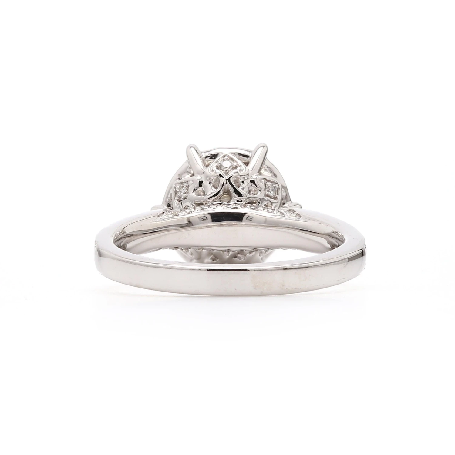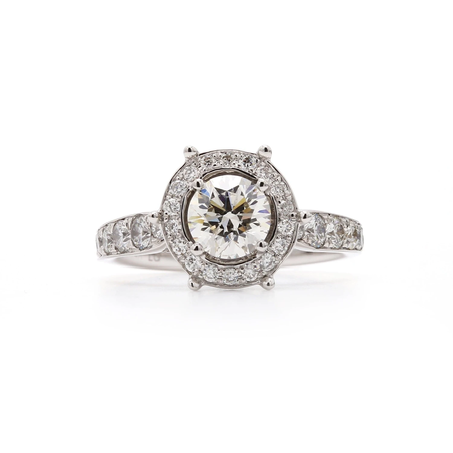 Proclaim your love with this vintage circle inspired diamond engagement ring. 14K white gold design features a 1.00 carat I SI1 lab grown diamond in a lab grown diamond lined halo setting. Additional lab created diamonds line the shank completing this 1 3/4 carat total weight certified engagement ring.