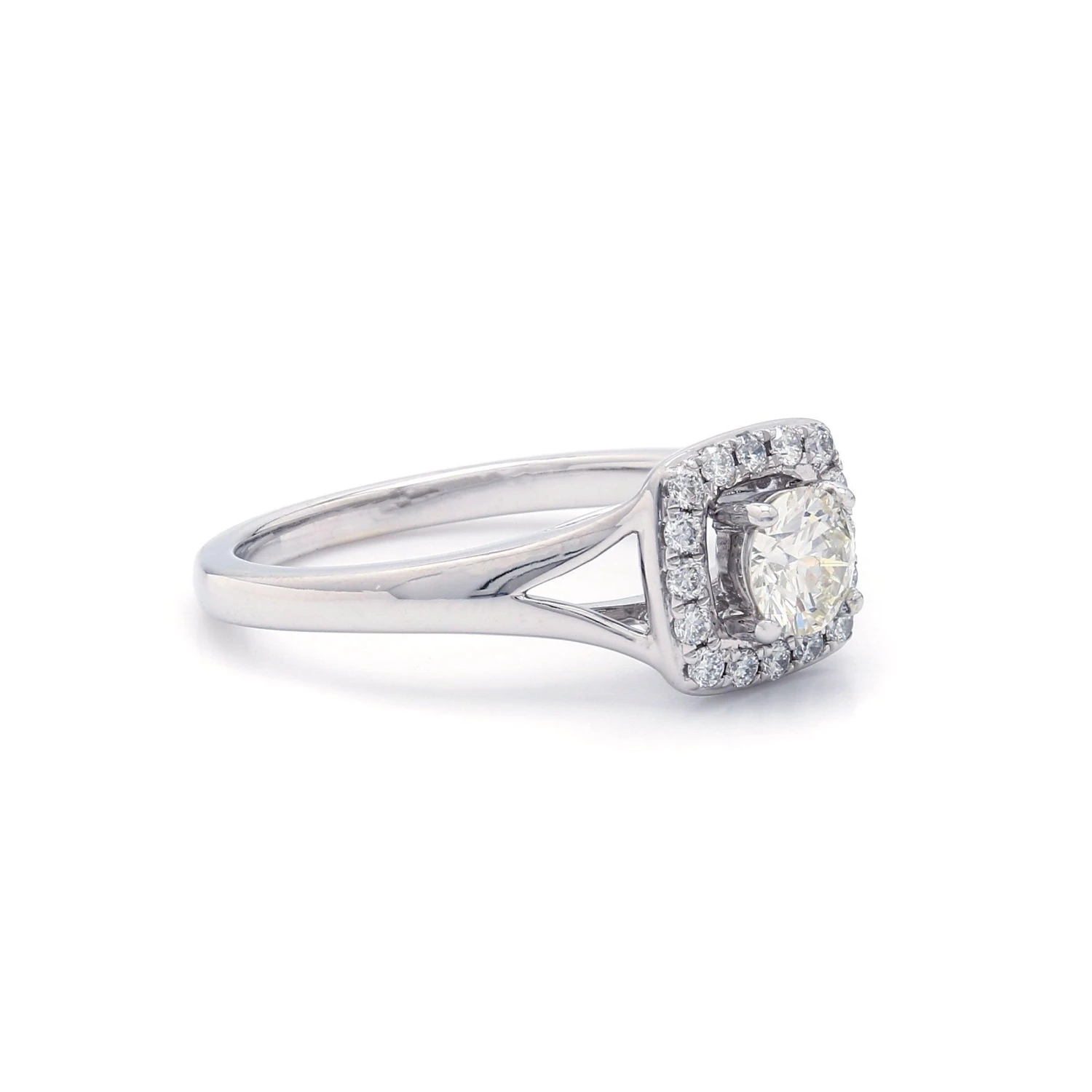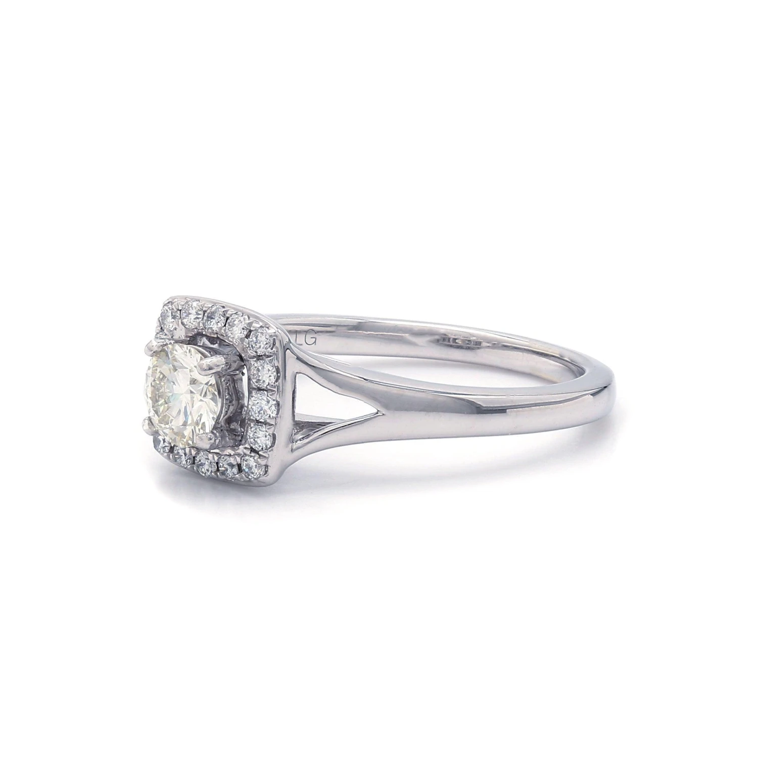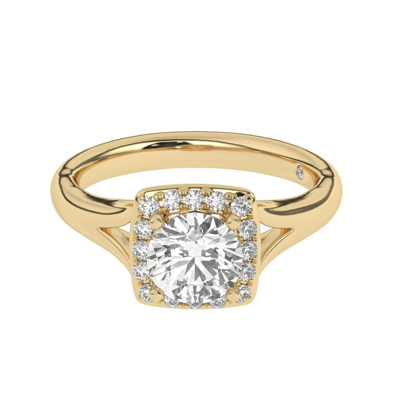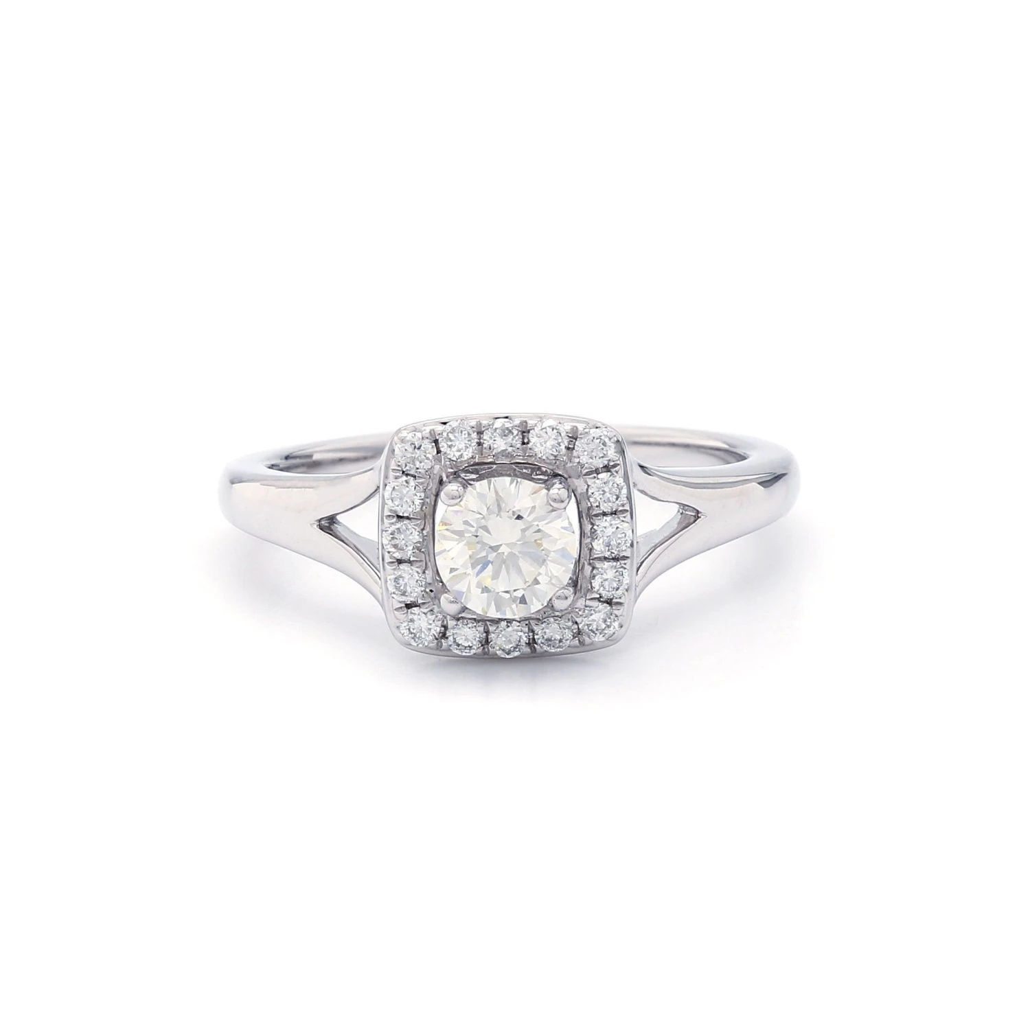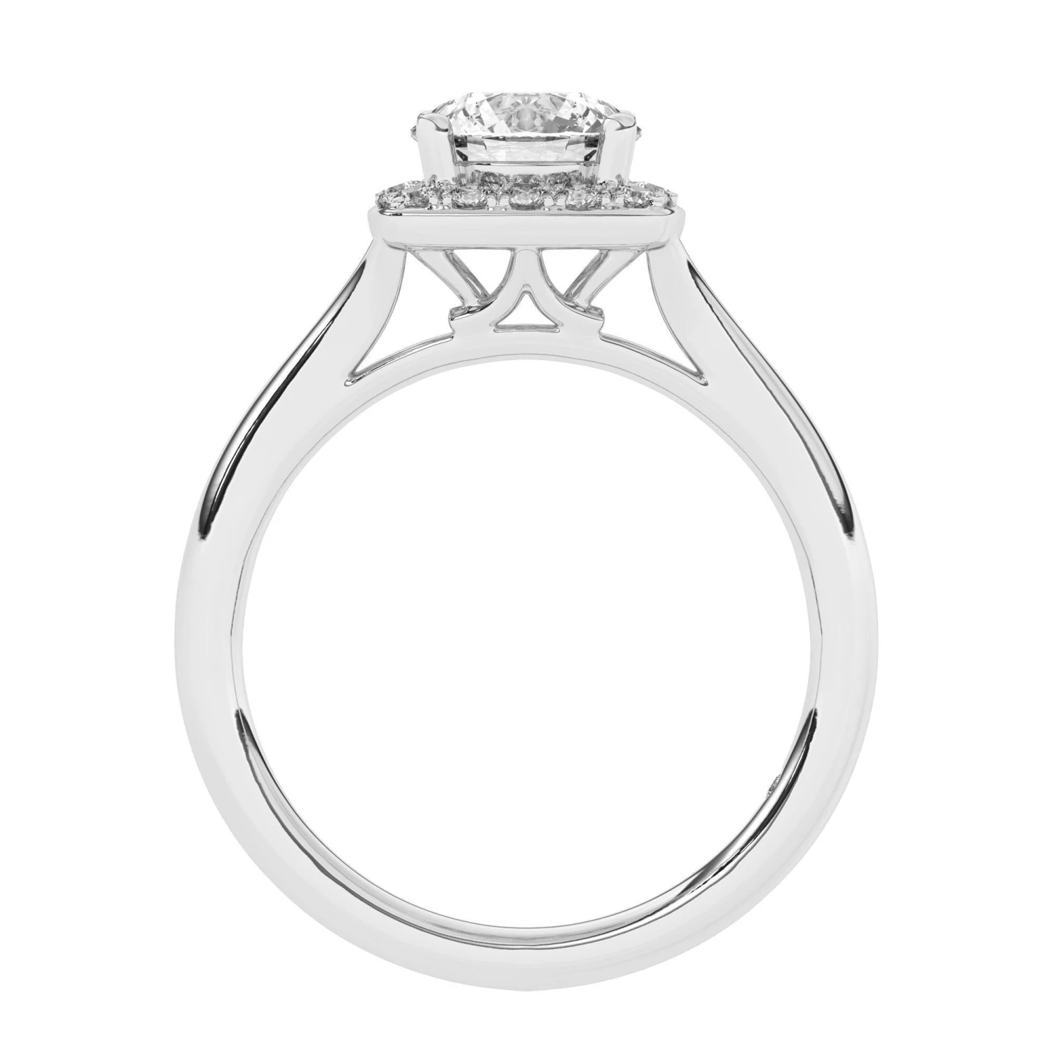Simple yet spectacular engagement setting. Once you’ve chosen the perfect lab grown diamond, this squared halo frame set with round accent lab created diamonds totaling 1/5 carats, will trace the center stone and a split high polished shank adds just the right touch.