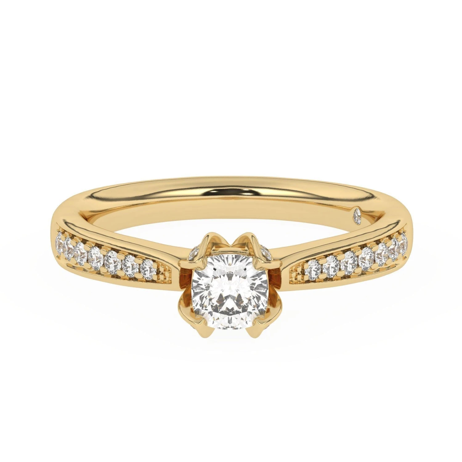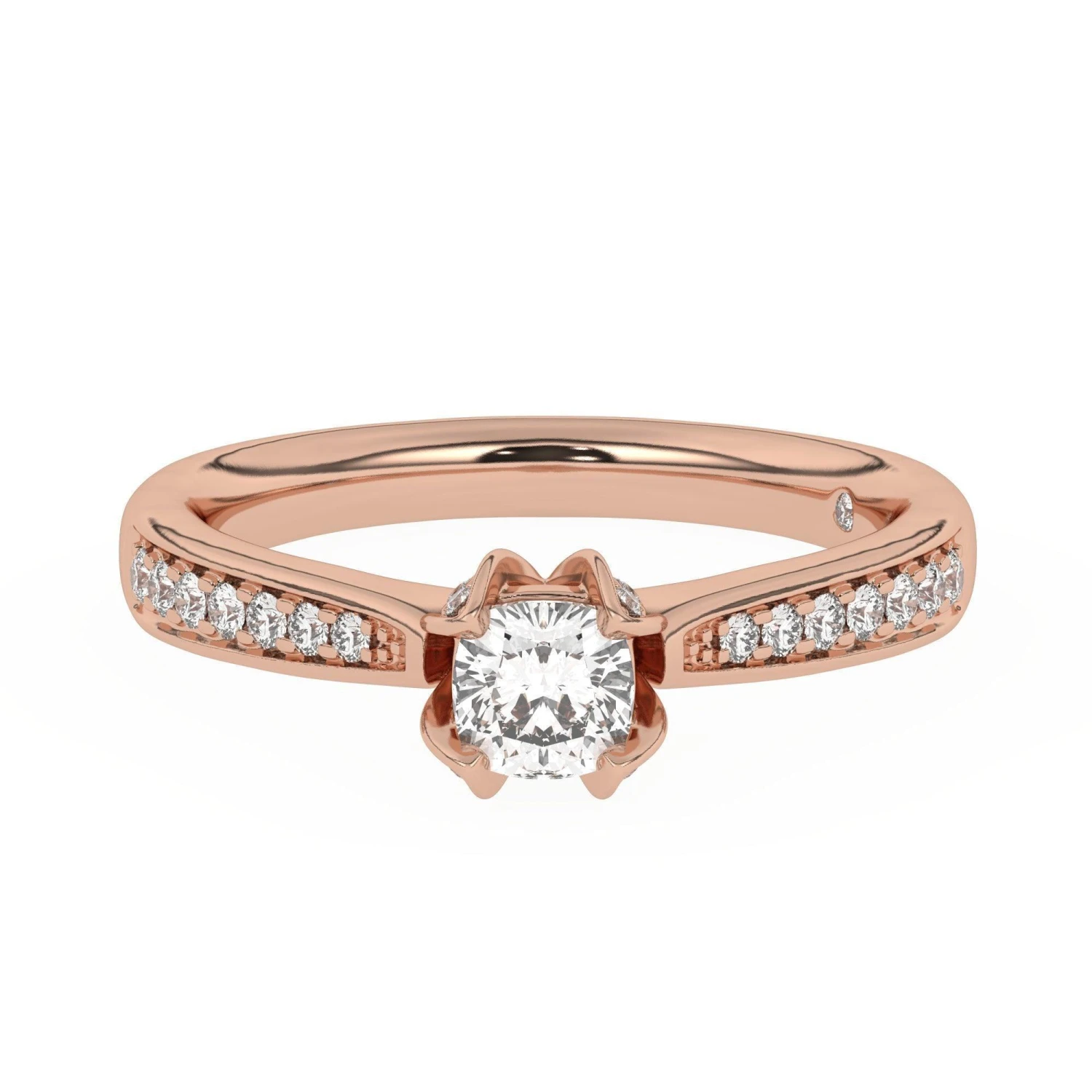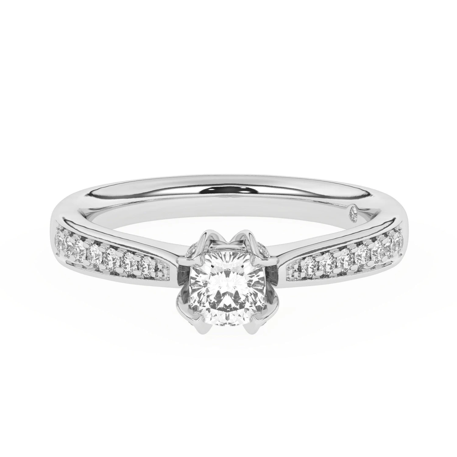 Fashioned in precious gold or platinum, this impressive setting highlights the diamond you personally choose for this moment, nestled in a lovely diamond accented setting. Petite diamond accents line the ring’s slender tapered shank, creating a look beyond all compare. This engagement ring is destined to delight with 1/4 carat total weight of lab created diamonds and perfect for coordinating with different band style rings for a creative look.