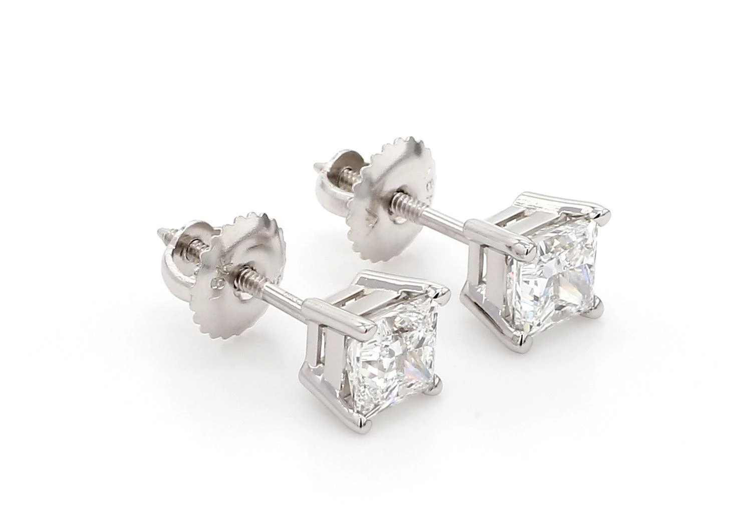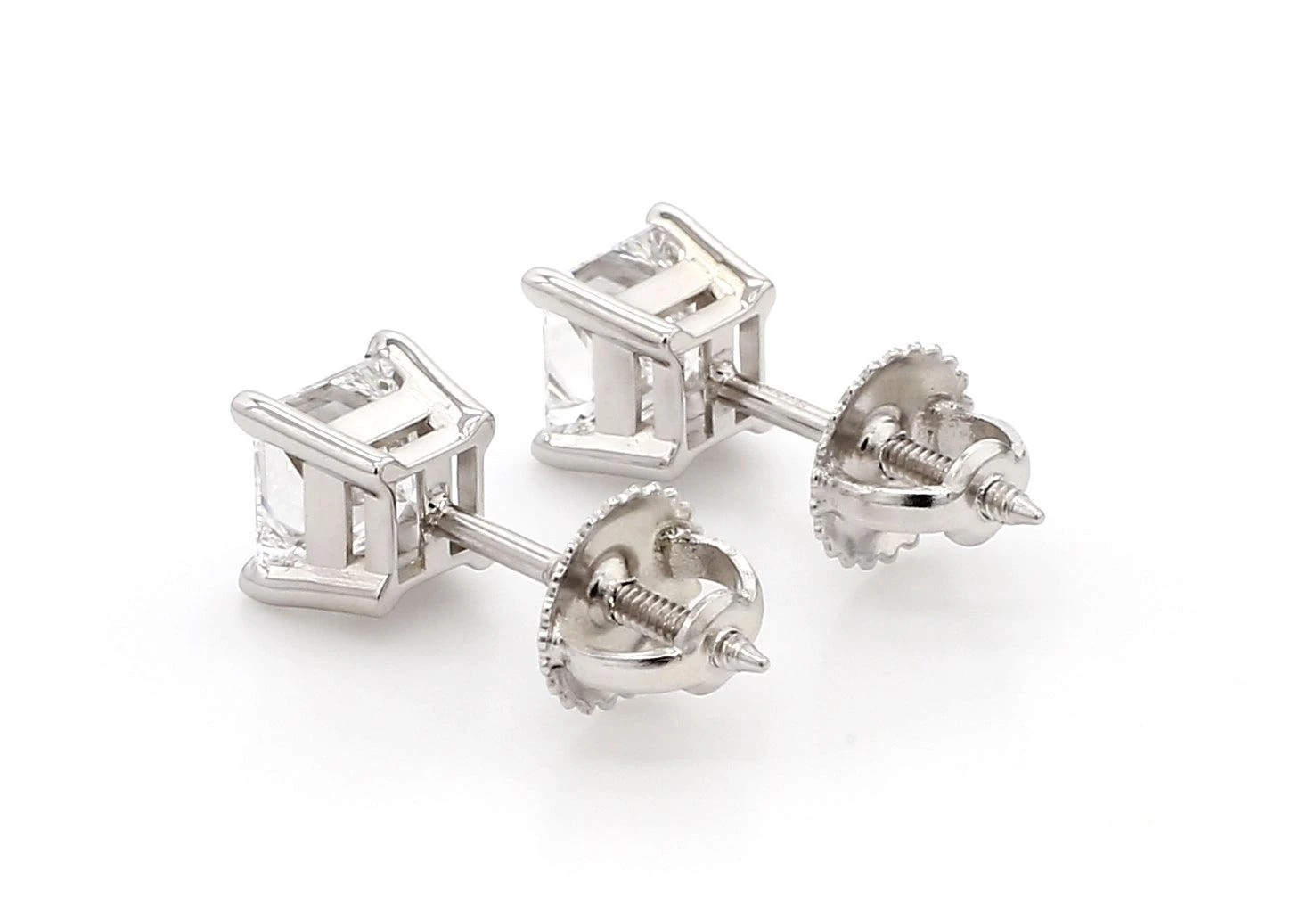 TraditionalĀ princess cutĀ lab grown diamond solitaire stud earrings. Perfect for everyday wear, the 1 1/2 carat total weight brilliant lab grown princess diamonds have a E-F color and VS1-VS2 clarity. The solitaires are set in a four-prong basket style 18K white or yellow gold setting with screw back closures. These beautiful earrings can stand alone or have an earring jacket to dress them up, extremely versatile and fit into any wardrobe and complement any occasion.