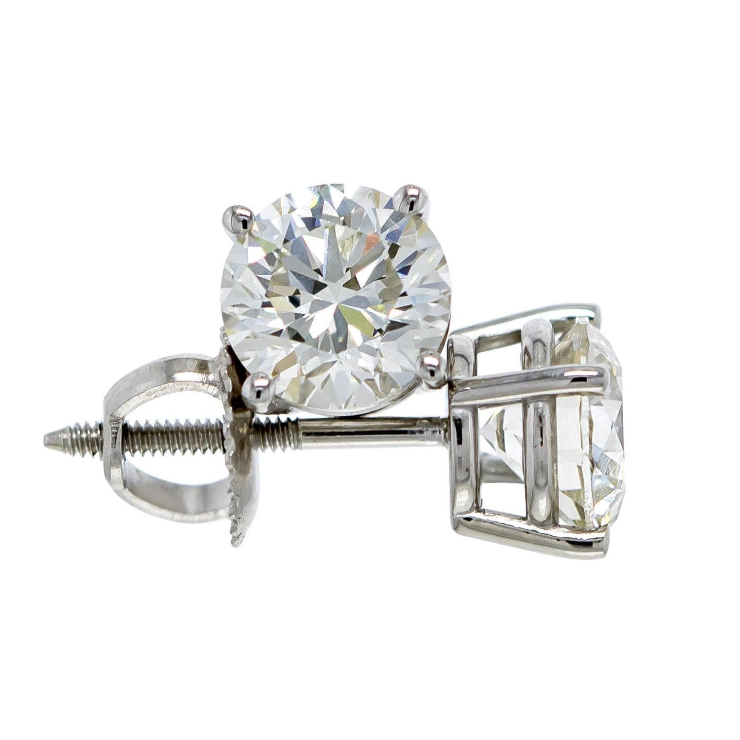 Simple and classic these lab grown diamond solitaire stud earrings, radiate. Perfect for everyday wear, the 2.0 carat total weight brilliant round lab grown diamonds have a E-F color and VS1-VS2 clarity. The solitaires are set in a four prong basket style 18K white or yellow gold setting with screw back closures. These beautiful earrings can stand alone or have an earring jacket to dress them up, extremely versatile and fit into any wardrobe and complement any occasion.