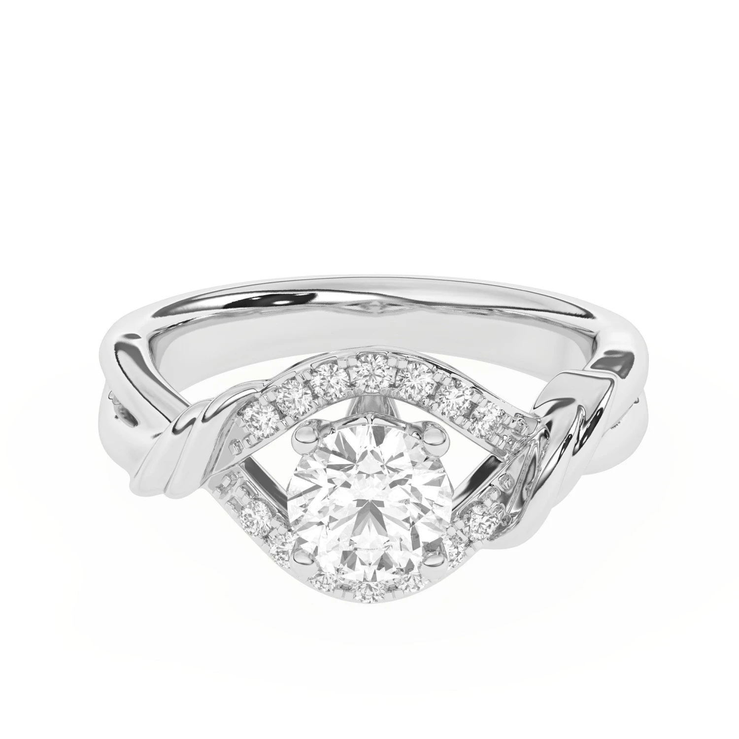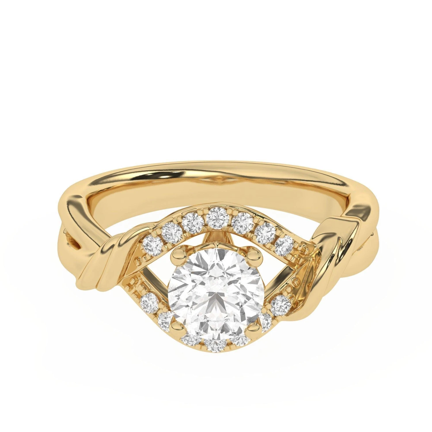 This simple yet elegant lab diamond engagement ring will delight her for years to come. The diamond of your choosing will be set amongst 1/7 total carats of lab grown diamonds. The band comes to a twist at the top for added style. The ring is crafted in fine gold or platinum.