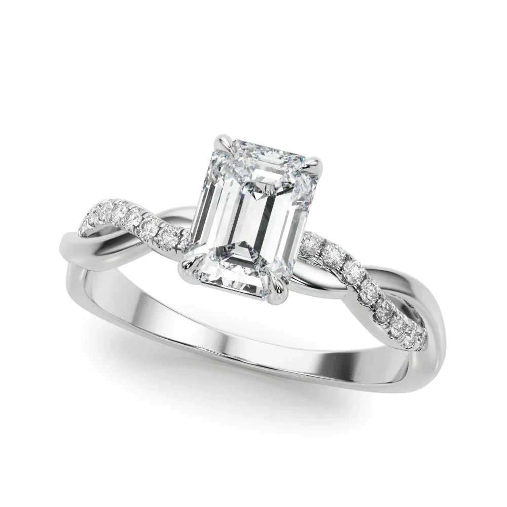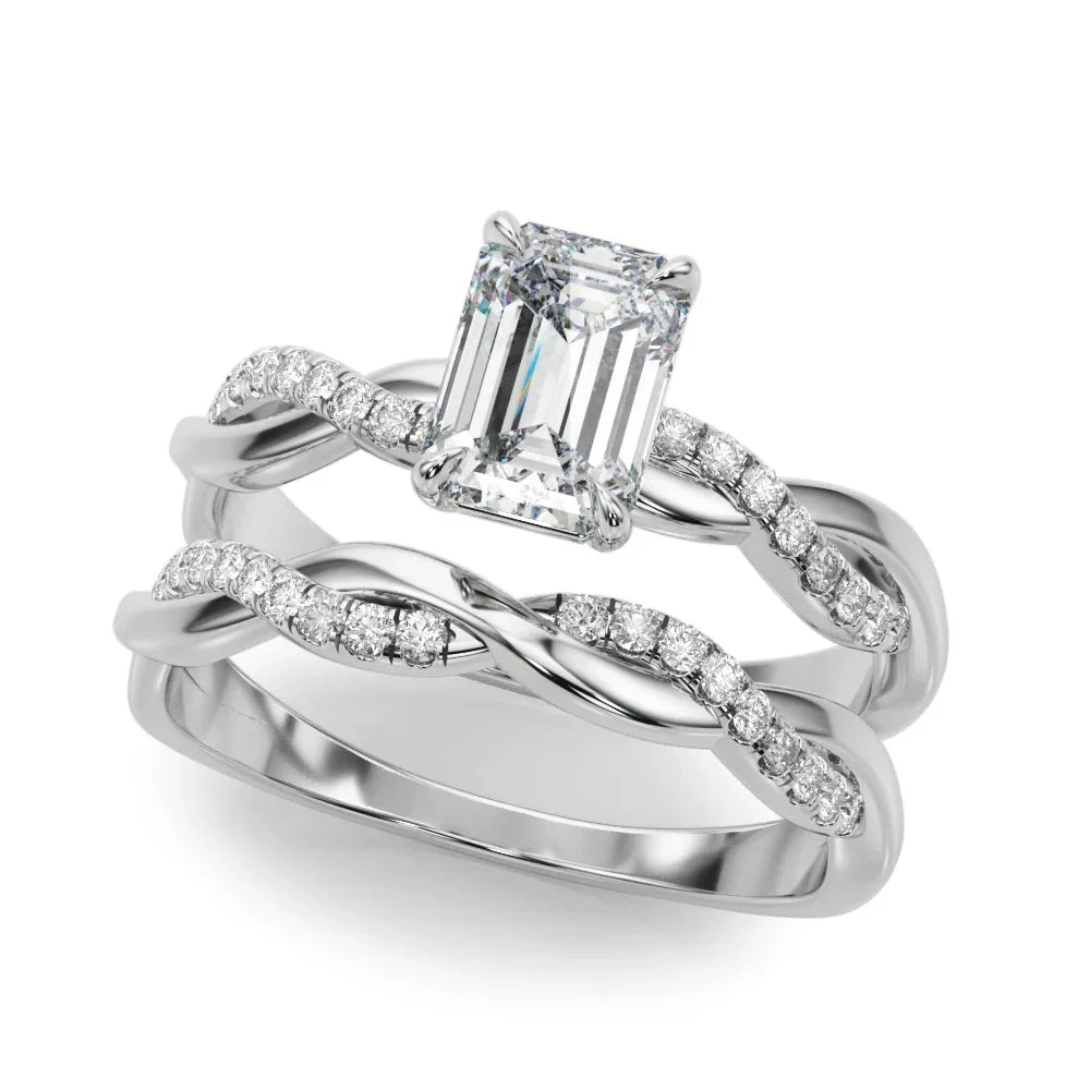 Look eternally beautiful with Dawn bridal set—an infinity-style ring with diamond accents equaling 1/5Ctw. A center emerald cut 2 1/4ct lab grown diamond creates a spectacular focal point of this amazing set.Â