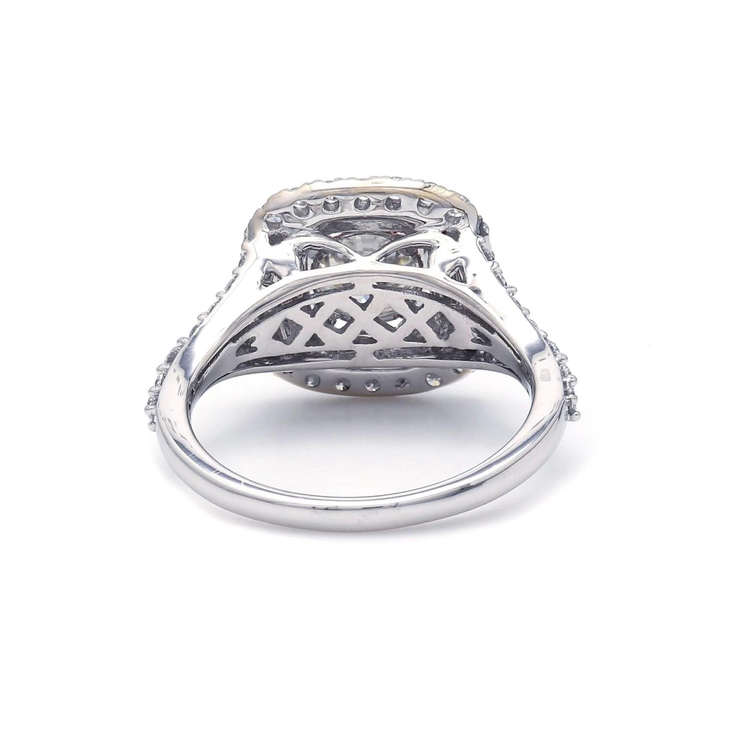 Make that special moment special with this double halo style lab grown diamond engagement ring. Expertly crafted in 14K white gold, this sparkling design showcases a 1.25 carat round I SI1 lab grown diamond center stone bordered with pink lab grown diamonds and a double halo with smaller round accents. Additional accent lab diamonds line the ring’s split shank. A total weight of 0.90 carats of pink colored and white (F-G, VS-SI) lab diamonds. Designed to sparkle this engagement ring captivates with 2.15 carats of lab grown diamonds and a bright polished shine.