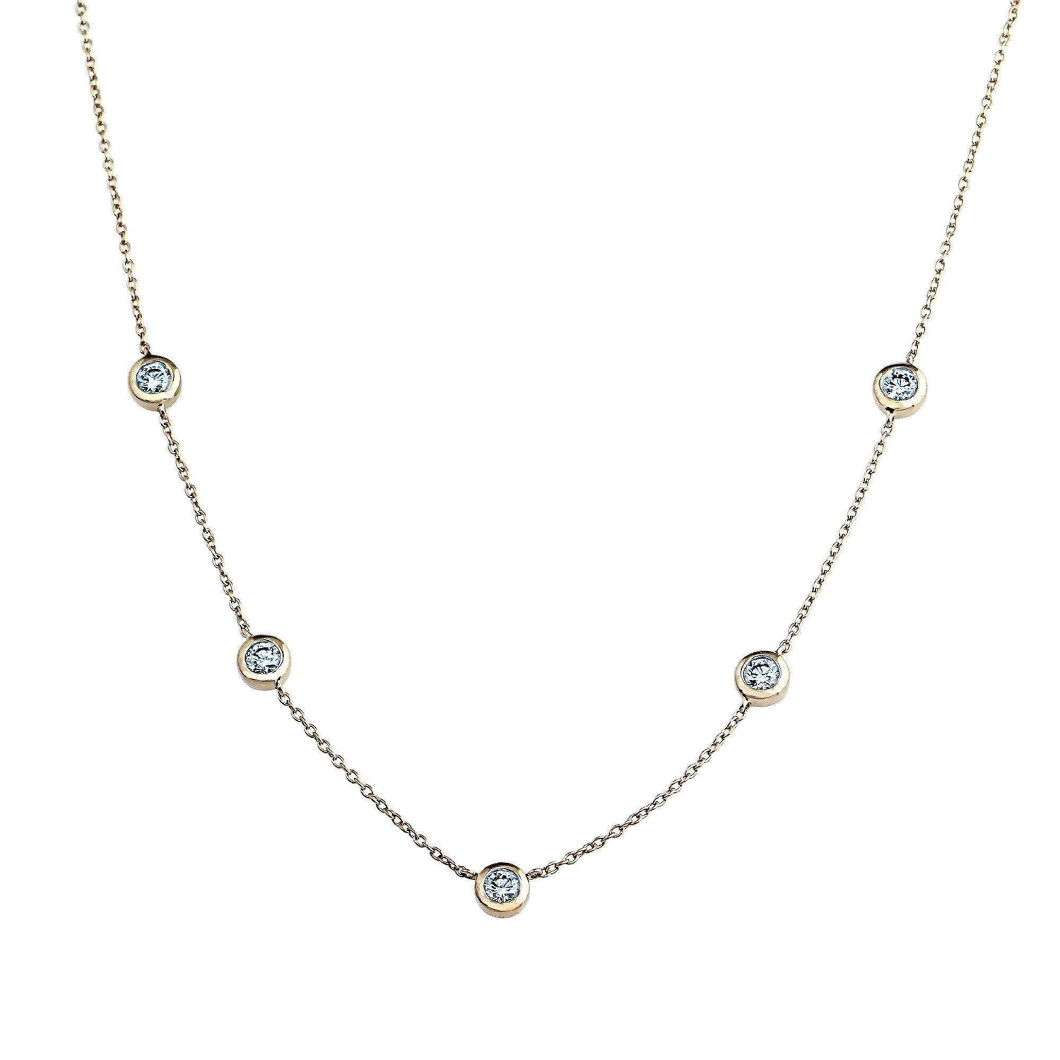 Expertly crafted with five stations of bezel-set lab grown diamonds, this necklace boasts a stunning 3/4Ctw. Your choice of sterling silver or gold over sterling silver in an 18-inch adjustable chain. The diamonds are graded G-H/VS-SI, ensuring the highest quality and brilliance. Elevate your look with this luxurious and environmentally friendly piece.