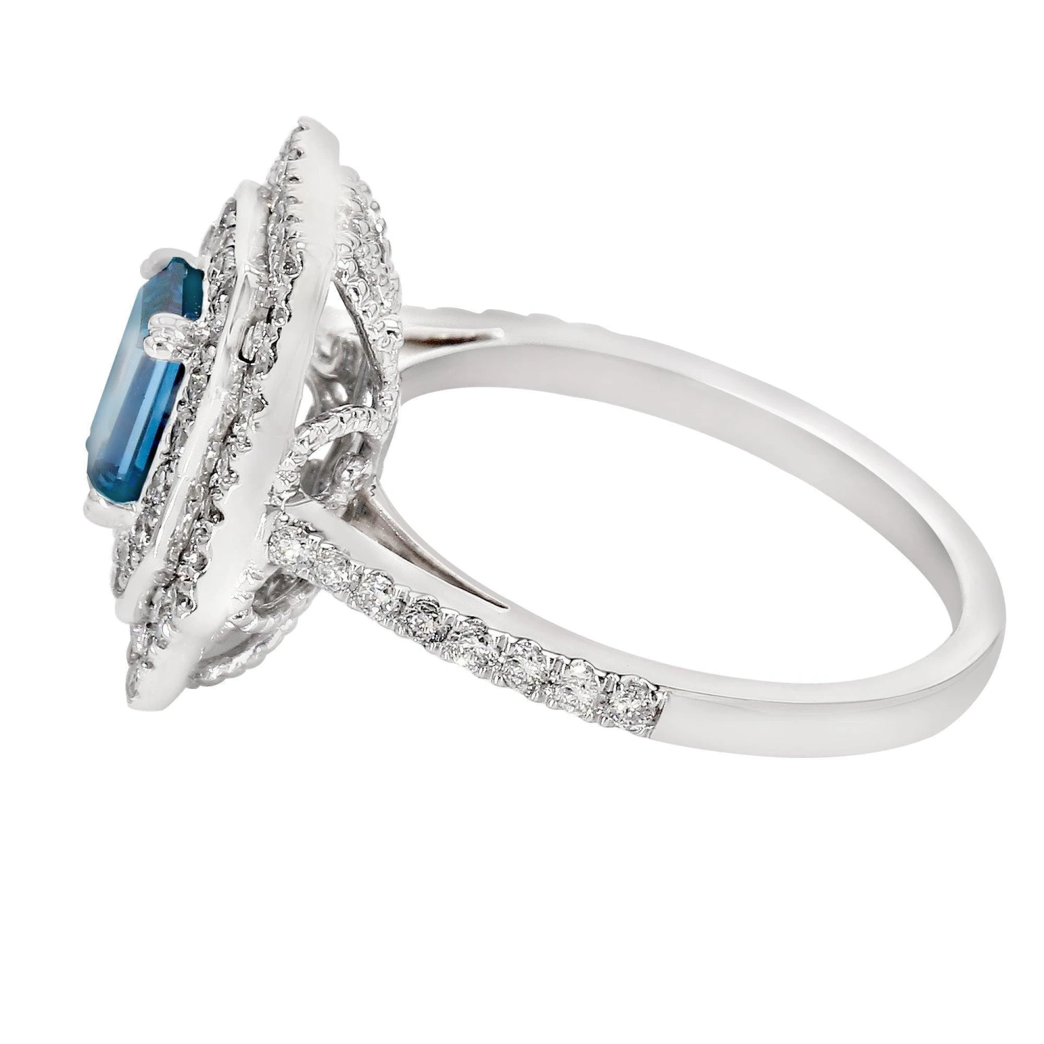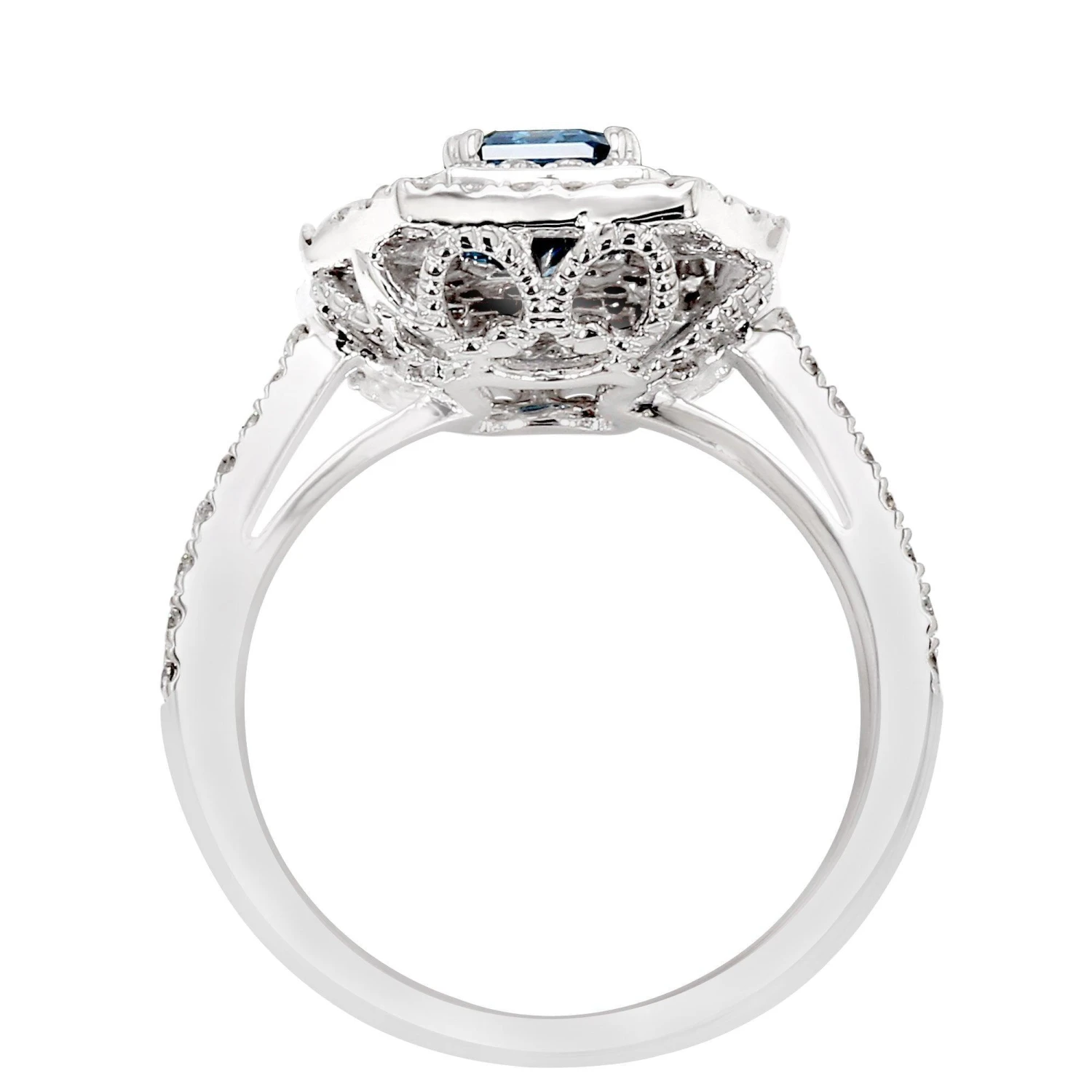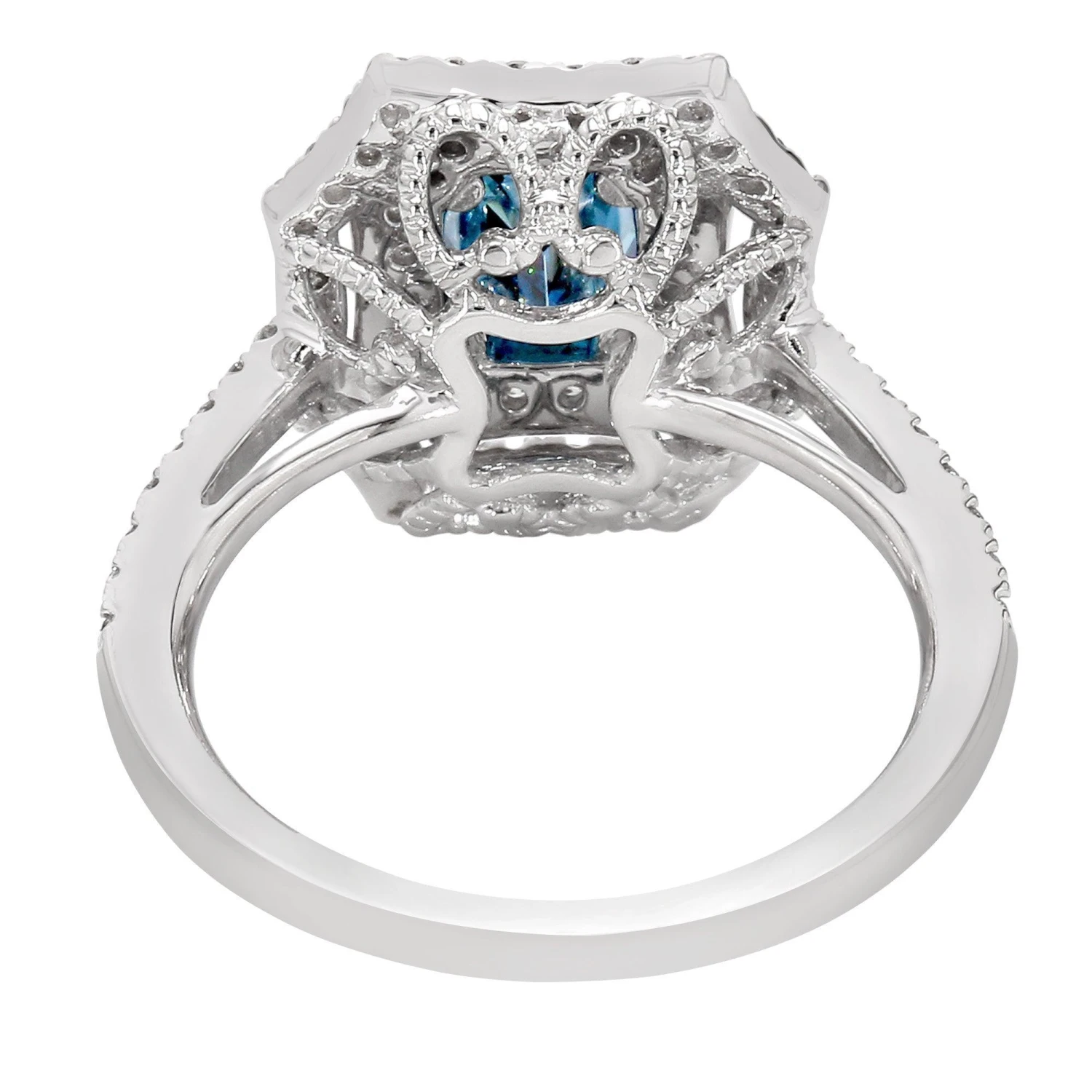 Vintage square halo meets a vibrant pop of color, what a beautiful design. Crafted in 14K white gold, this design has a 1.00 carat Blue lab created diamond set in a square halo centered of dazzling white lab grown diamonds. The white lab grown diamonds have a F-G color and VS-SI clarity for a total 0.75 carats set in white gold for a great look. A ring that can be worn as an engagement ring or stunning right hand fashion statement.Â