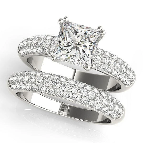 The Ella Bridal Set boasts 3 rows of sparkling diamond accents, with a 3/8ctw lab grown diamond band and a dazzling 2.0ctw princess center lab created diamond. The matching wedding band features 1/2ctw lab grown diamonds, completing the perfect bridal set. Say “I do” in style with this stunning and affordable option!