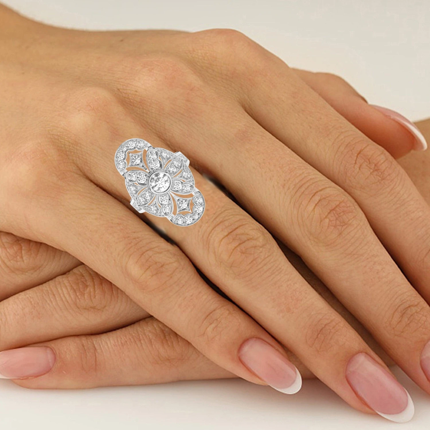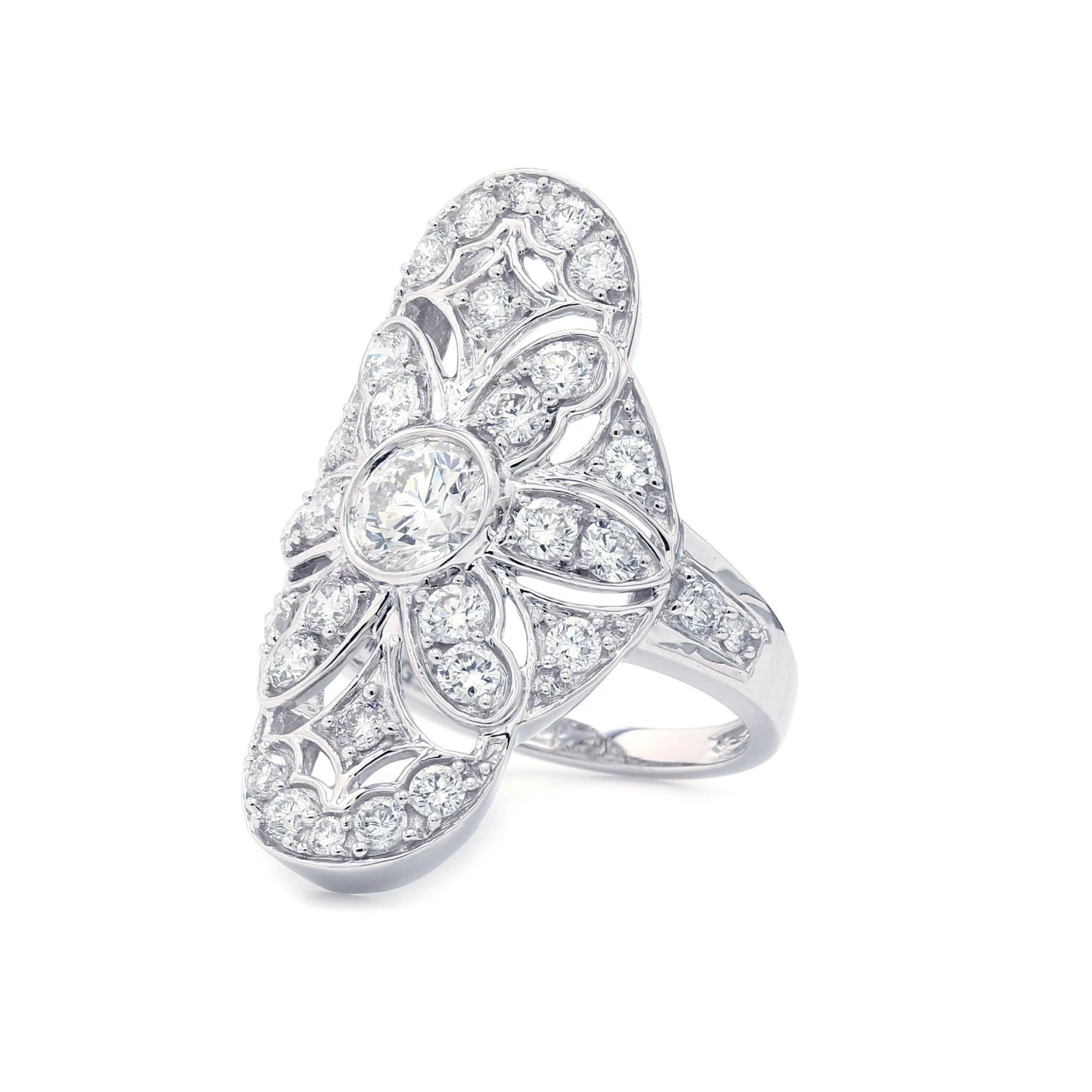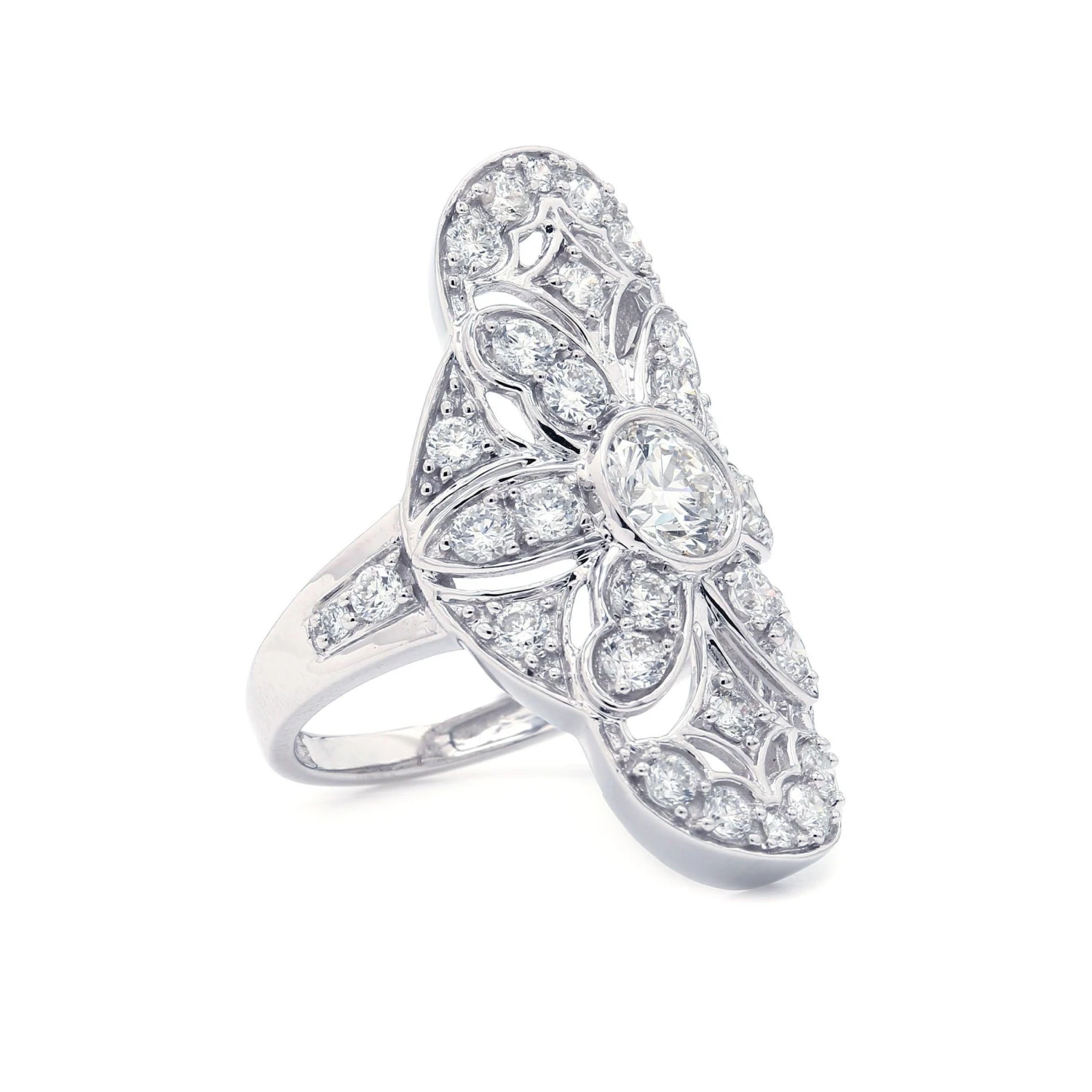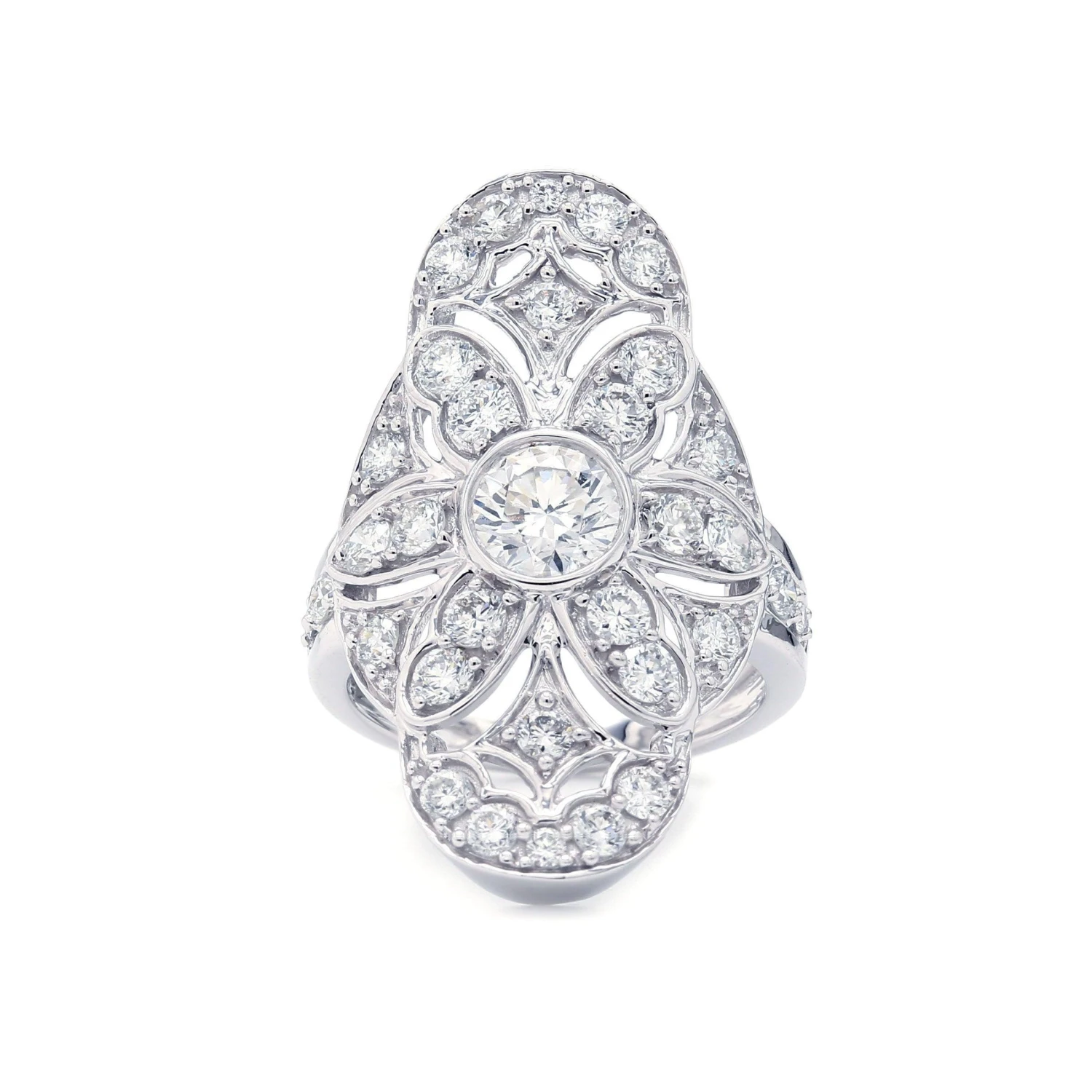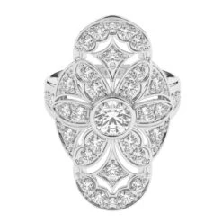 Make an unforgettable impression with this vintage inspired lab grown diamond ring. Crafted in 14K white gold, this large design shimmers with a bezel set 3/4 carat lab diamond at the center. Shimmering F-G, lab diamond lined ribbons that sweep and swirl into an eye catching lattice worked design. Certain to get noticed, this sentimental style sparkles with 2.40 of lab diamonds and a bright polished shine.