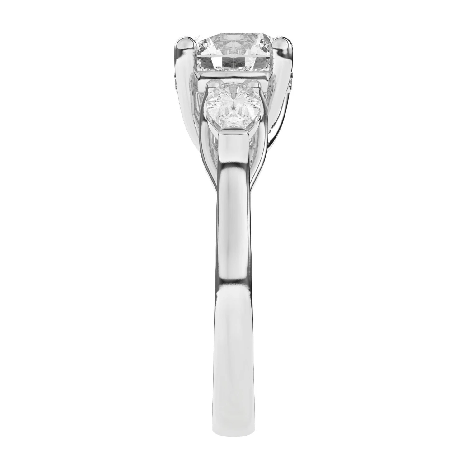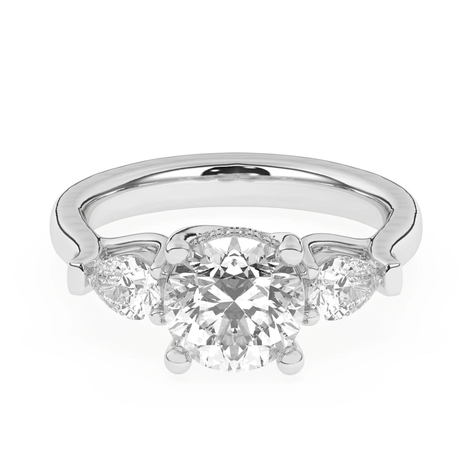 This perfect engagement ring features a gold band, two pear shaped diamonds all with side 2/3 carat total weight of lab grown diamonds in F-G color and VS-SI clarity. Please note these will change depending on the size and shape of your center stone. Classic 3 stone look for a certified lab grown diamond of your choice.