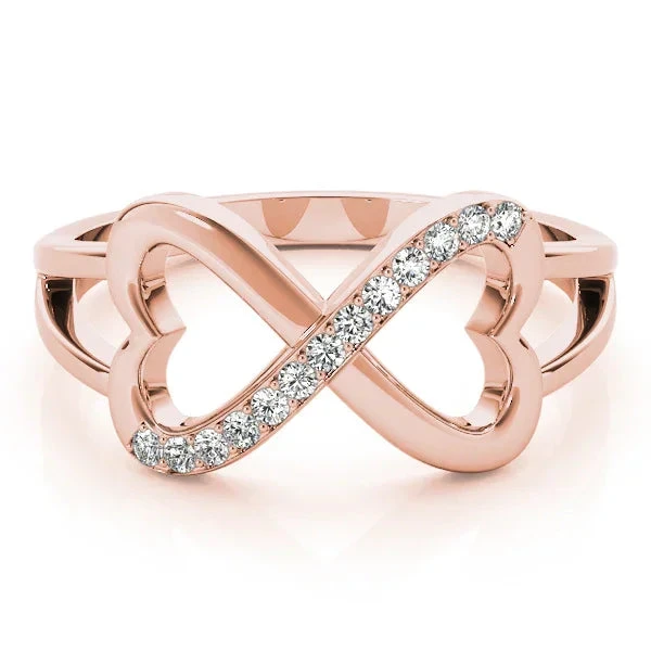 This infinity heart diamond ring boasts thirteen lab diamonds equaling 1/8 total carats, in F-G color and VS-SI clarity. Modern and timeless, this piece serves as a symbol of eternal love and commitment. Add a touch of sparkle to any look with this beautiful ring in either gold or sterling silver.