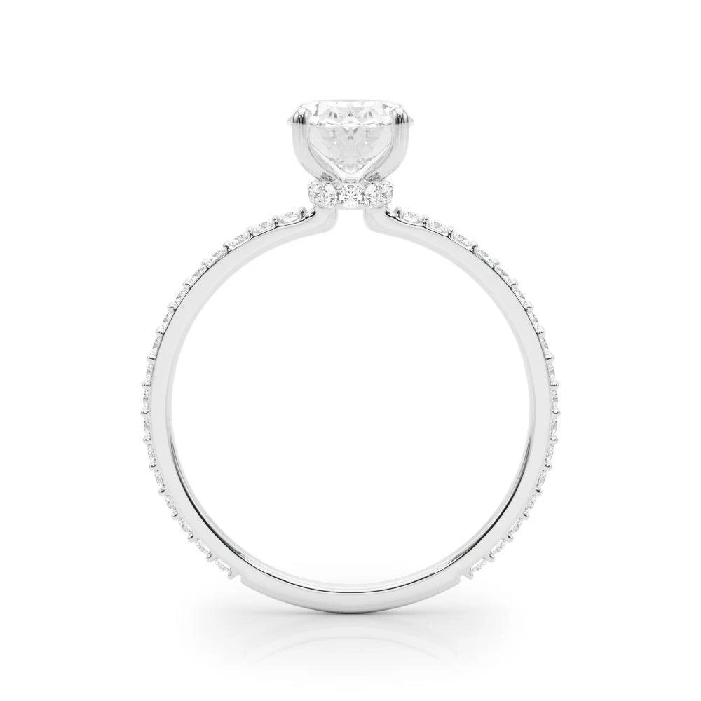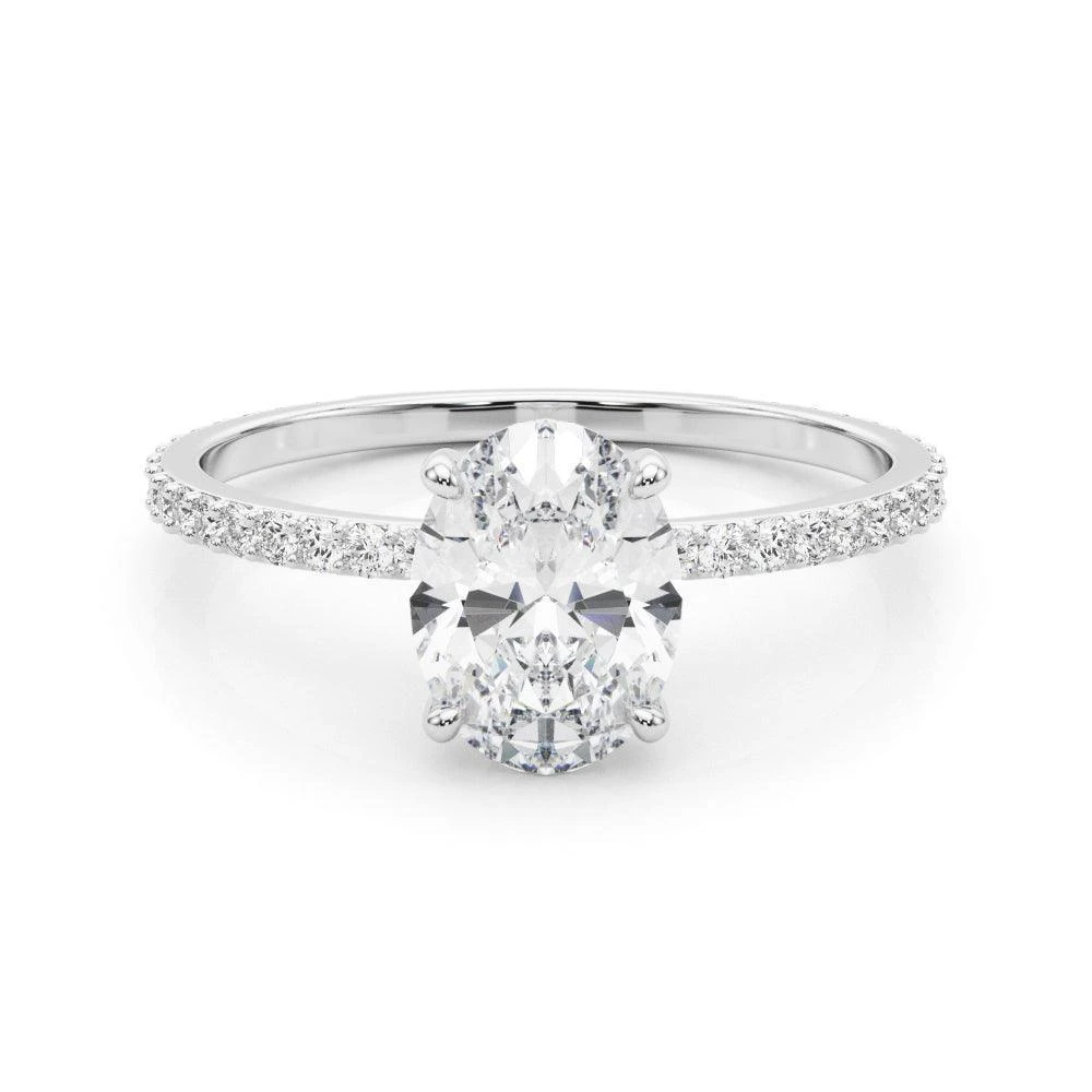 The Jade Hidden Halo Setting is a timeless classic. Its 4-prong claw setting and 1/3Ct. T.W. lab-grown diamond accents provide a beautiful contrast, amplifying the brilliance and sparkle of the oval center lab created diamond you chose. Perfect for lovers of traditional design, this setting is guaranteed to make a lasting impression.