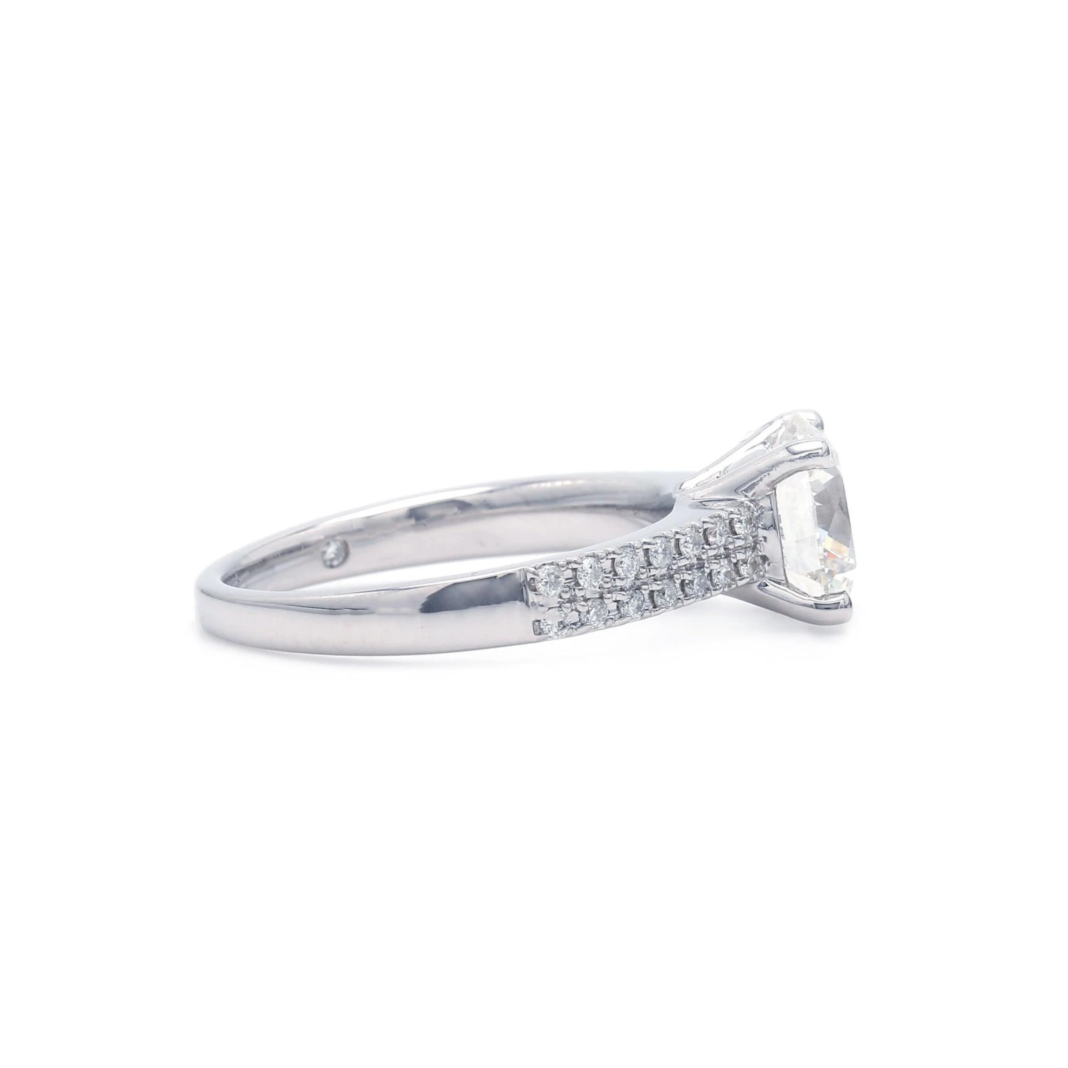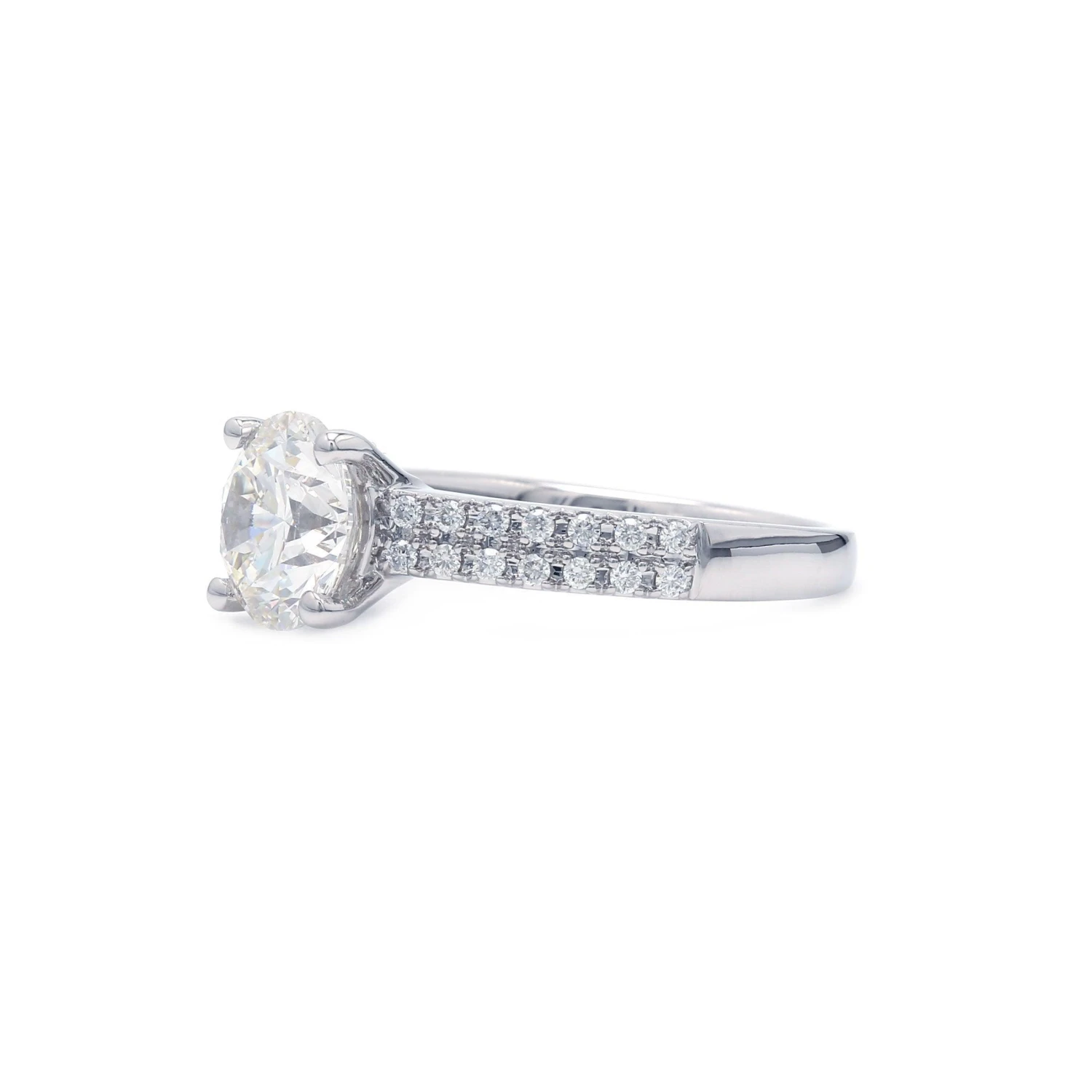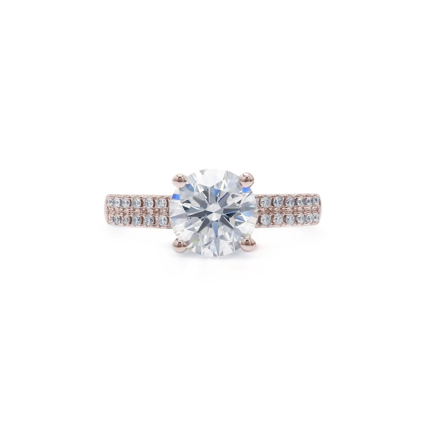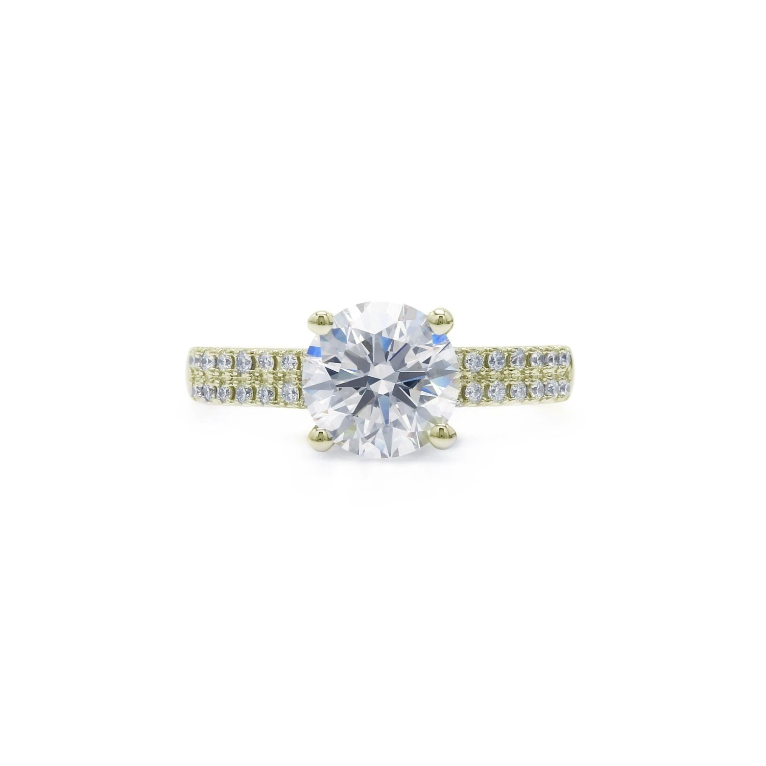 Bold, bright and exceptionally beautiful lab grown diamond engagement ring. Fashioned in fine gold or platinum, the setting has a durable four-prong setting for the lab grown diamond of your choice. Additional 1/5 carat total weight of lab grown F-G, VS-SI diamonds double row line the ring’s shank, creating an eye-catching look. A meaningful gift, this ring captivates.