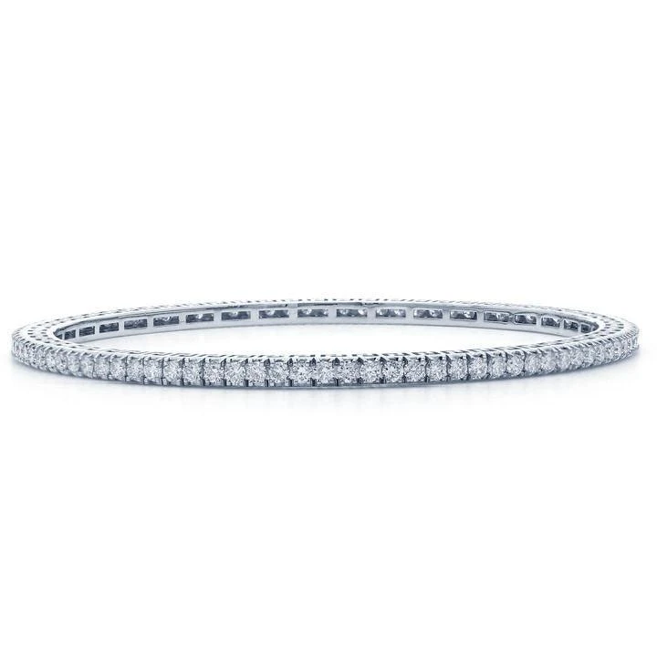 Basic yet brilliant, this tennis bracelet design bangle elevates any attire from casual to business to formal. Crafted in 18K white gold, this slender slip-on design looks great on its own or stacked with others. Buffed to a bright luster, this 3 1/4 carat total weight white lab grown diamond lined circumference reflects the light with every turn of the wrist.