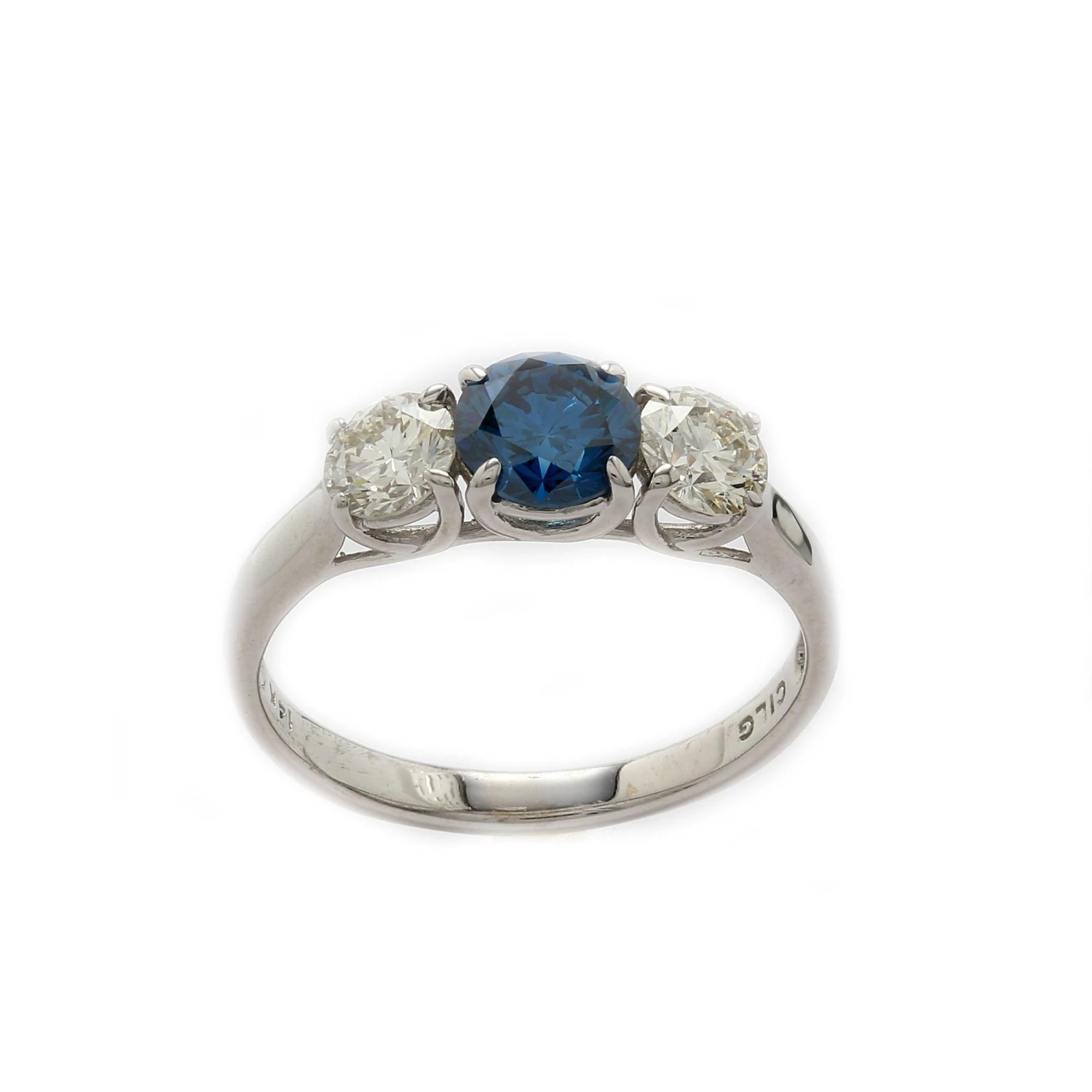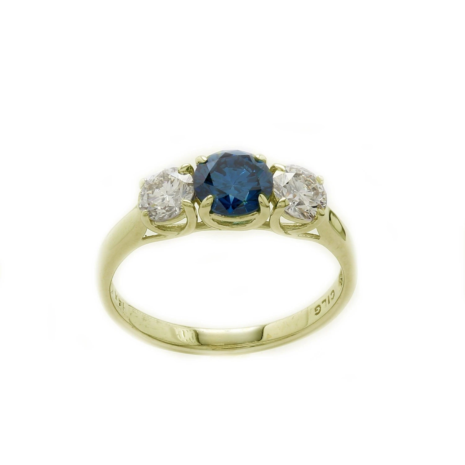 Fashioned in precious 14K yellow or white gold, this Classic three stone design highlights 1 1/2 carats total weight with the 0.80 blue diamond center and two side diamonds of I-J color VS ranking lab grown diamonds. This petite style ring is destined to delight and comes complete with certificate, it’s the perfect style for coordinating with different band rings for a creative look.