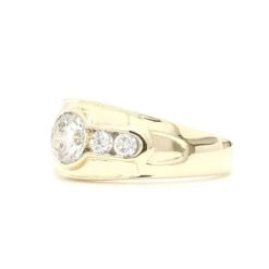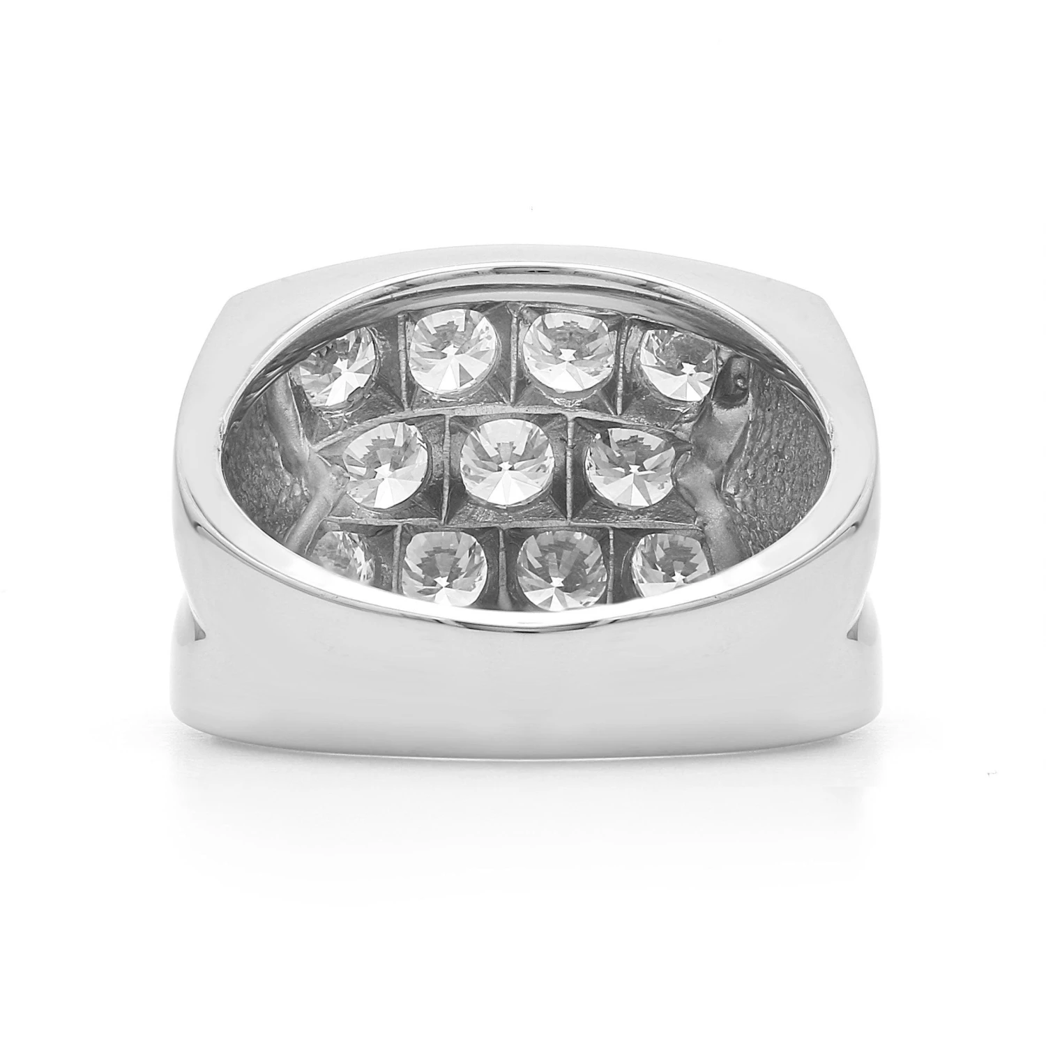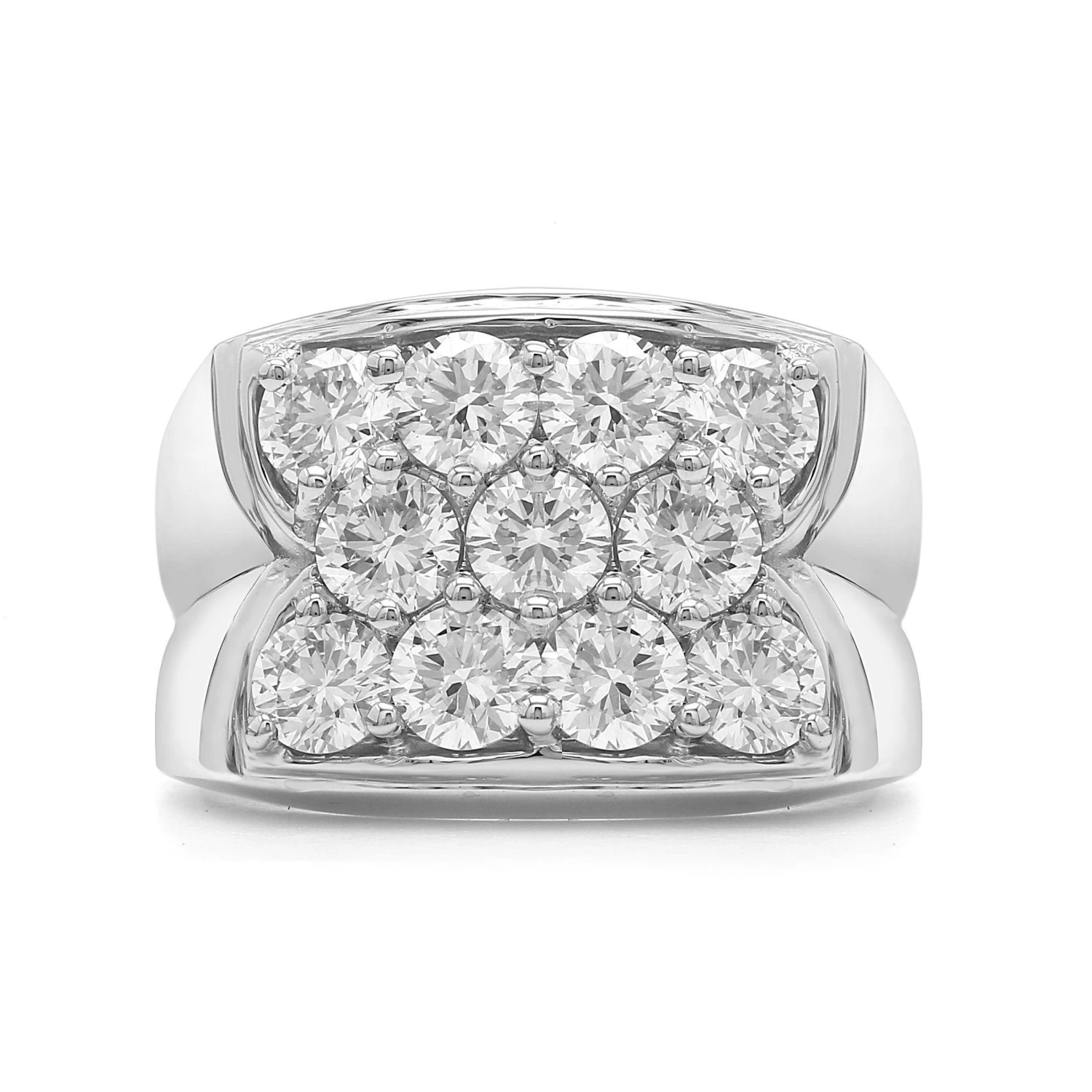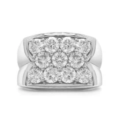 A masculine look, this lab grown diamond ring is for his contemporary style. Expertly crafted in 14K white or yellow gold, the eye is drawn to the 3.00 carat total weight cluster of shimmering round lab grown diamonds at the center of the ring. Curved in arches and high polished finish adds depth and dimension to the wide shank. Each round lab grown diamond has a I-J color and VS-SI clarity ranking.