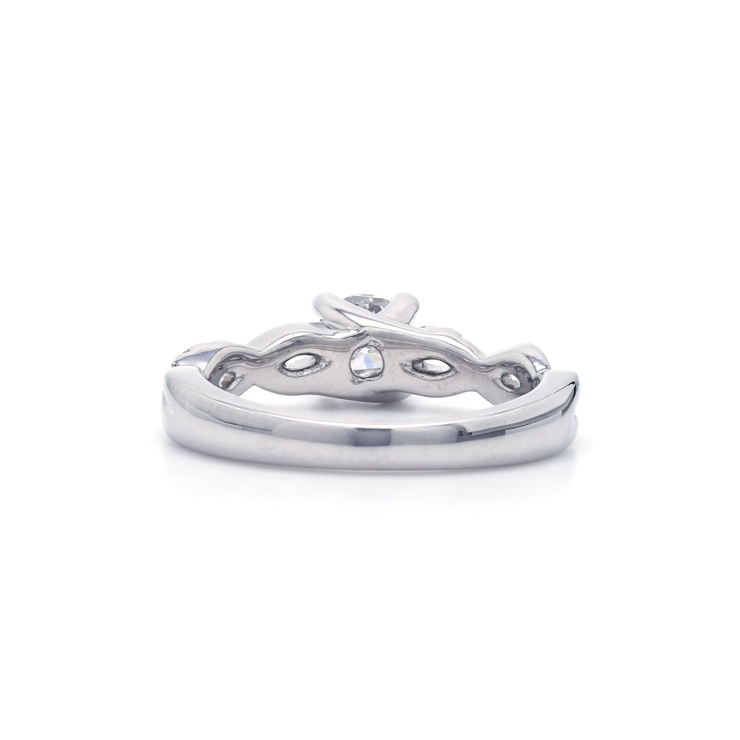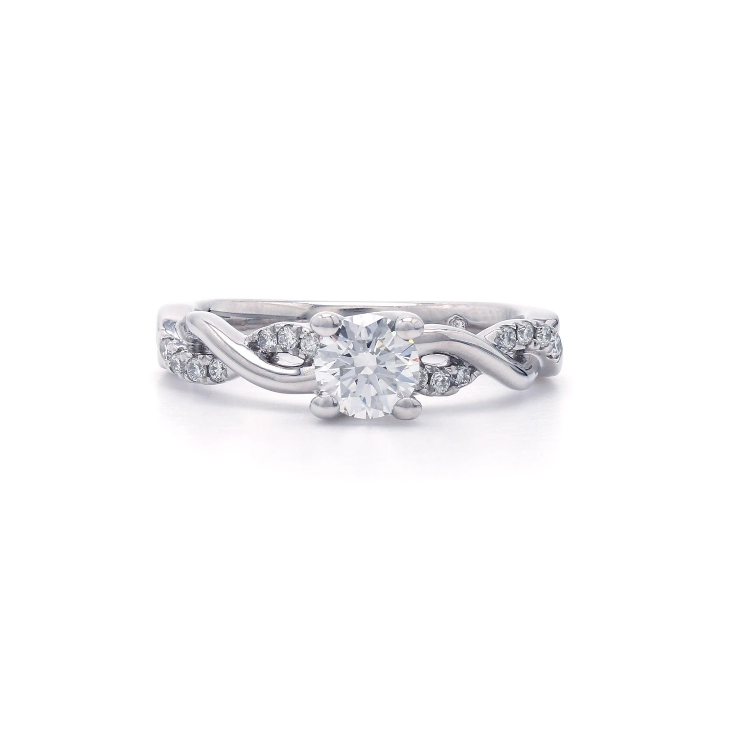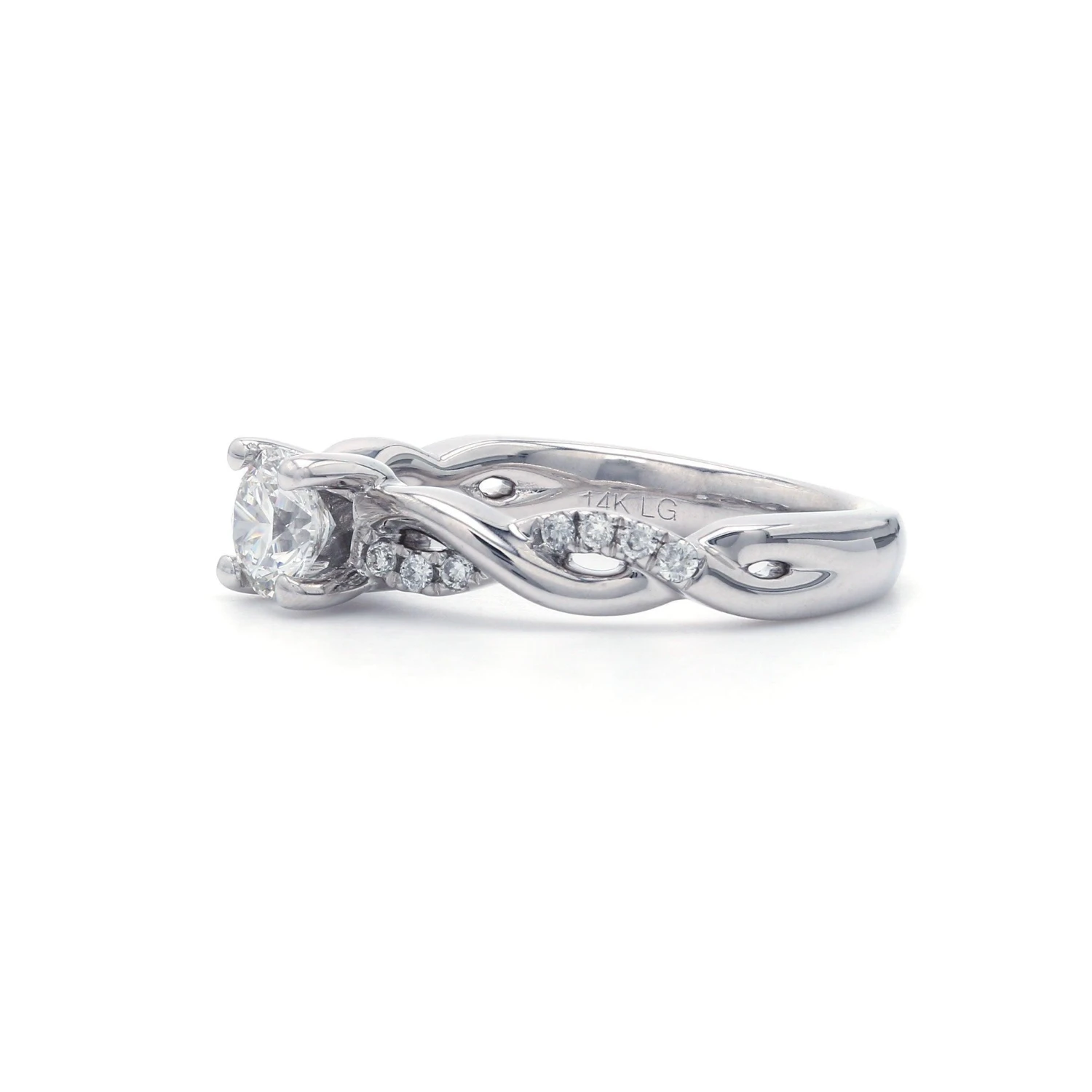This beautiful vintage inspired lab grown diamond engagement ring is crafted in 14K white gold. A ribbon design featuring a 1.00 carat round K, SI1 lab grown diamond artfully set center. The dazzling shank shines with F-G, VS-SI 1/7 carats of lab grown diamonds and a high polished ribbon intertwining open work. Radiant and a brilliant buffed luster, this IGL certified engagement ring is certain to become a treasured keepsake.