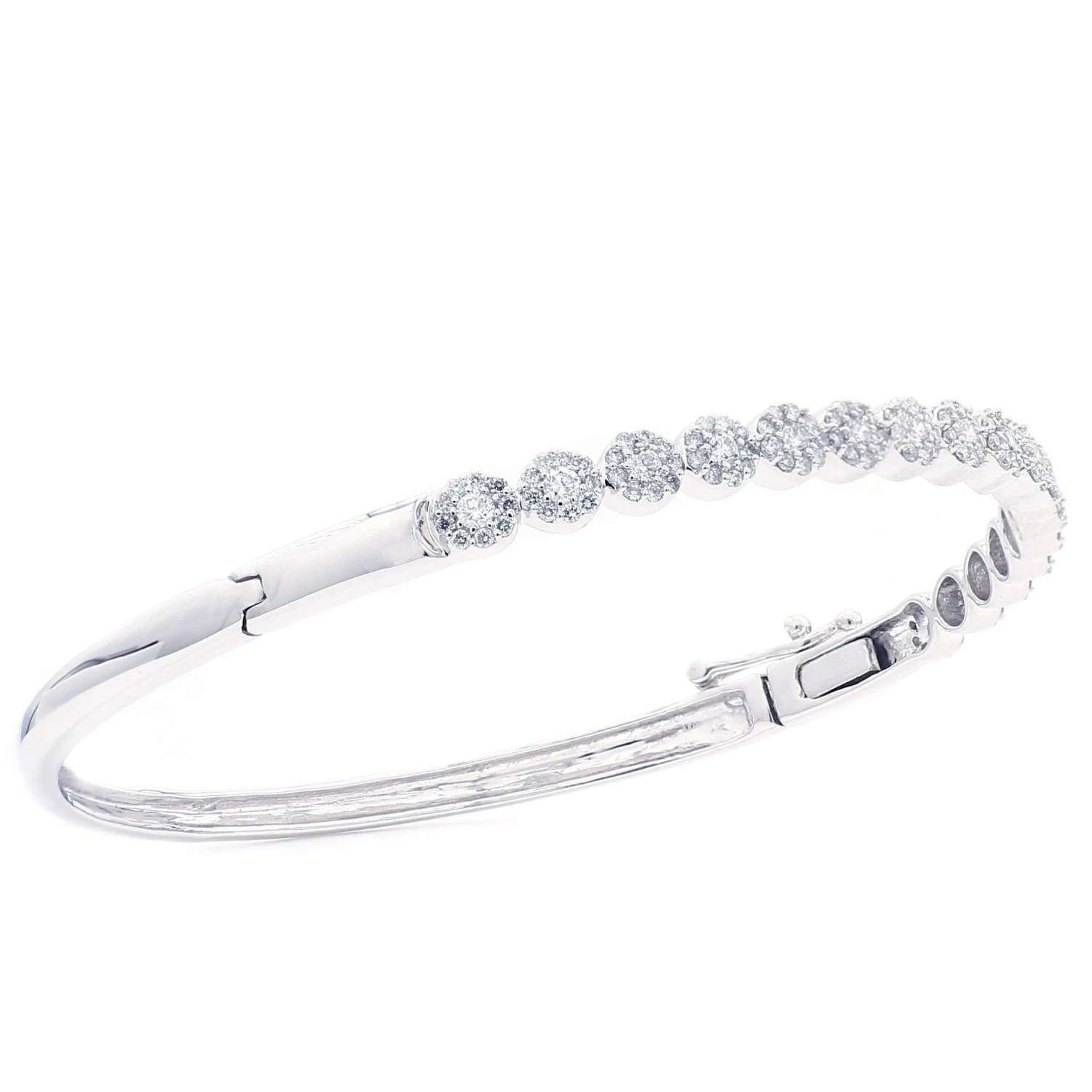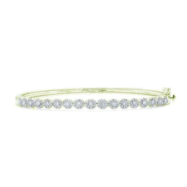 The bangle is set with a row of round lab created diamonds with a color ranking of F-G