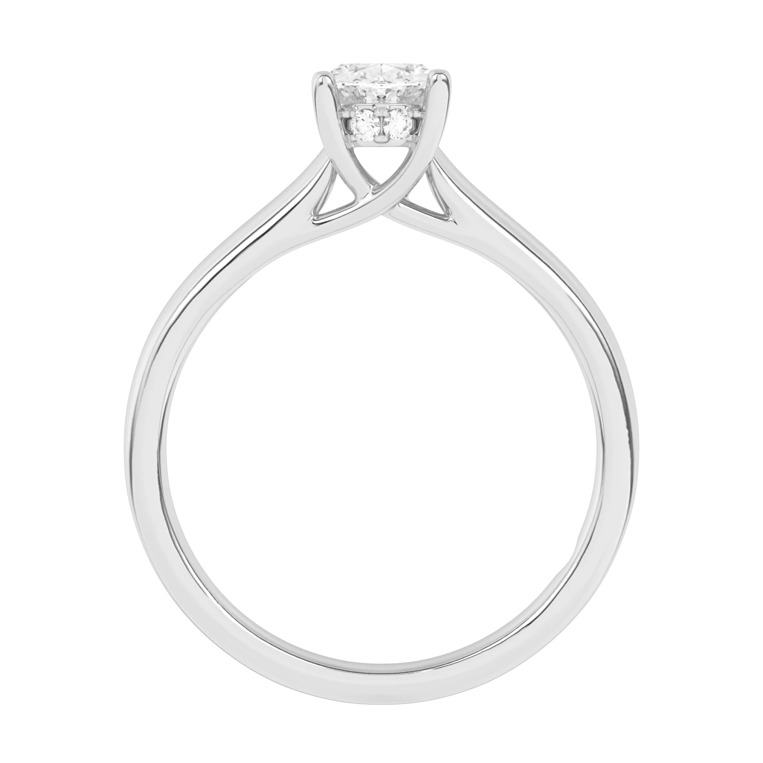 Classic and elegant, this diamond engagement setting suits traditional tastes. Fashioned in gold or platinum, this piece showcases the lab grown diamond of your choice in a 4-prong setting. Beneath the stone is a halo of lab grown diamonds for additional radiance.
