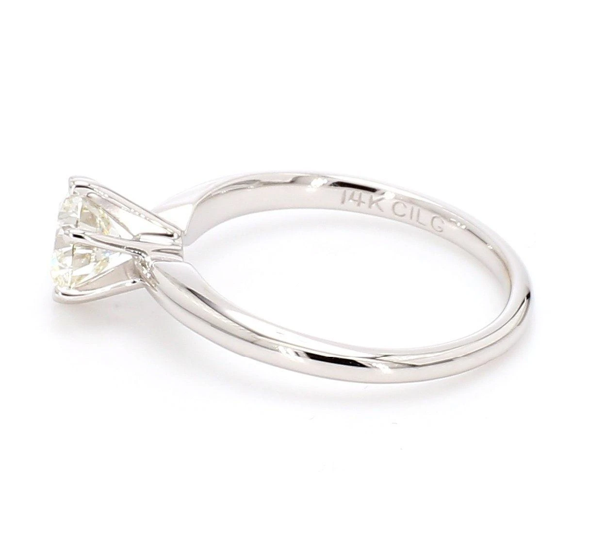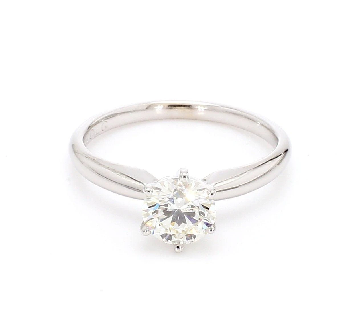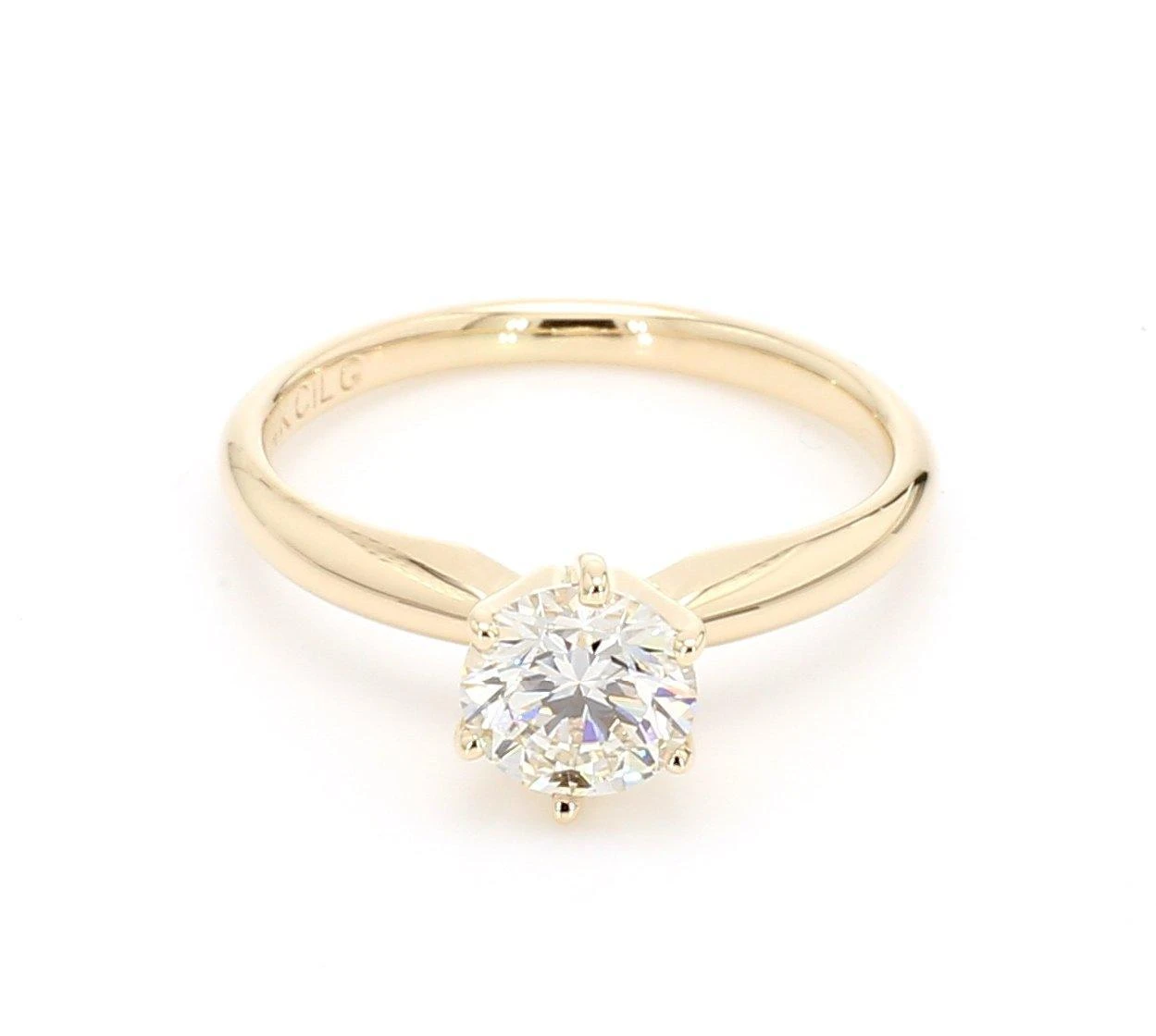 This classic solitaire setting features an impressive six prong mounting in a band of gold with high polish finish.