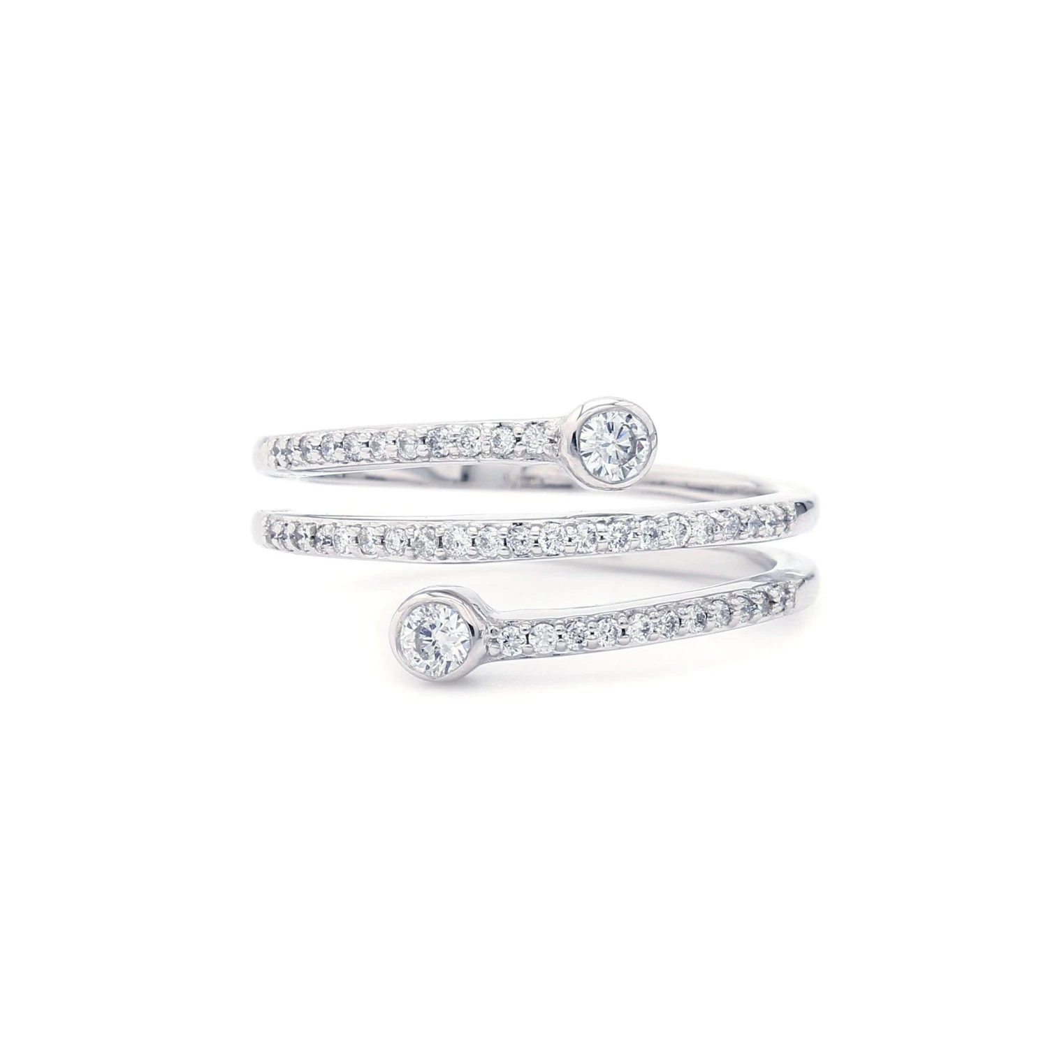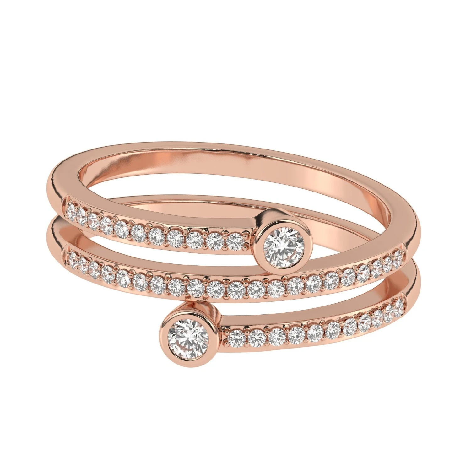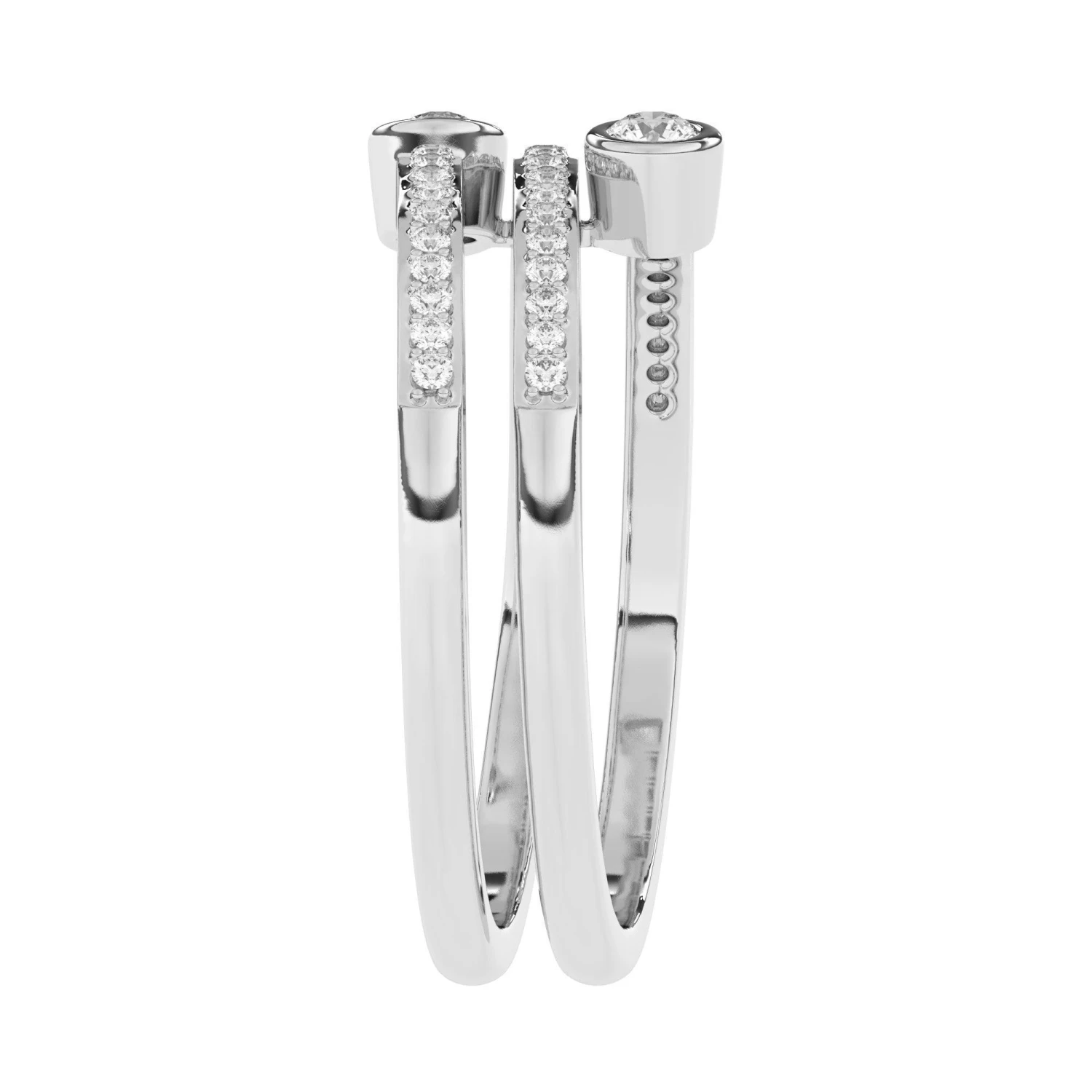 Perfect for a “just because I can” band. A dazzling look that features three rows of sparkling F-G, VS-SI lab grown diamonds totaling 1/3 carat. Trendy open fashioned rows with two ending in a larger bezel set lab diamond. Fun and flirty, this 14k white, yellow or rose gold ring is sure to be worn often.