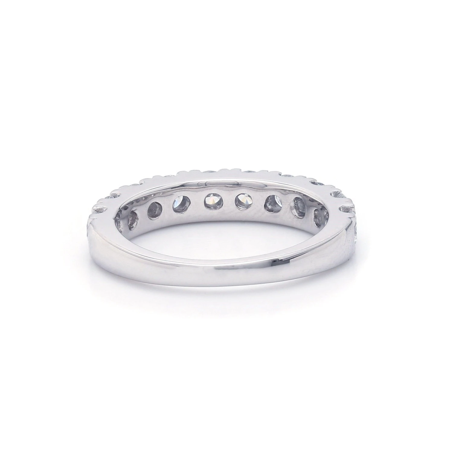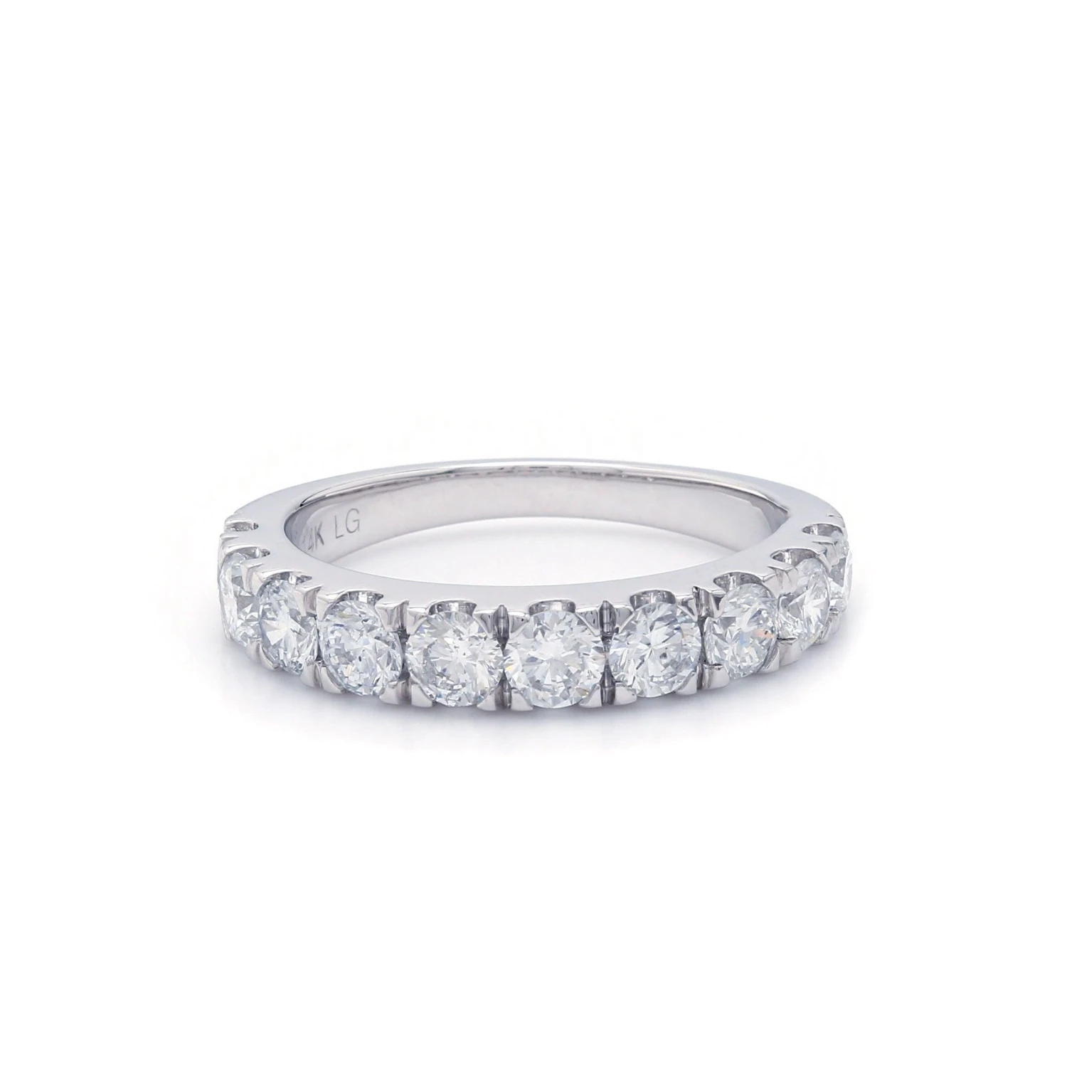 A brilliant celebration of your love, this lab grown diamond band is a memory in the making. Perfect for a wedding day, anniversary or “just because” band. A dazzling look that features a row of sparkling F-G, VS-SI lab grown diamonds totaling 1 1/2 carat. It’s slender style can stack nicely on the side or both sides of an engagement ring. It can also be paired with other smooth sided rings for a personalized touch. Available in white, yellow or rose 14K gold.