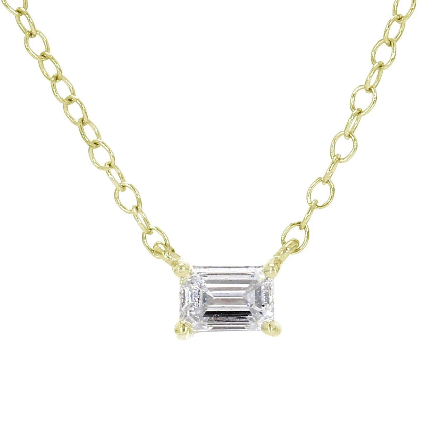 Simple, yet magnificent enough to stand alone, the beauty of a lab grown diamond solitaire needs no accompaniment. This 1/3 carat Emerald cut lab grown diamond Necklace in 14K gold glistens with a color ranking of I-J and a clarity ranking of VS-SI. A stunning accessory that suspends along an 16 inch chain that has a two inch extension for a possible 18 inch fit. Giving it the a little diversity for occasion worn and secures with a lobster clasp for ease of wear. Â