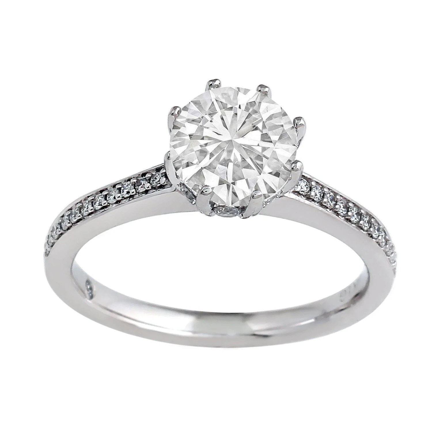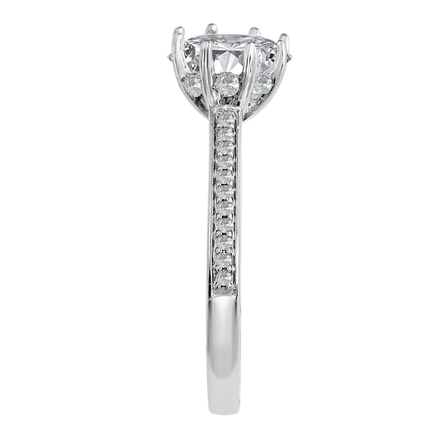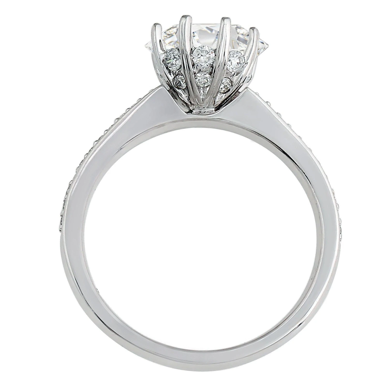 This glistening lab grown diamond engagement setting is crafted in polished platinum or gold. Eight prongs will display the lab diamond of your choosing. Hidden between the prongs are more diamonds that help to transform this traditional 1/3 Ct. T.W. setting into something truly unique.Â