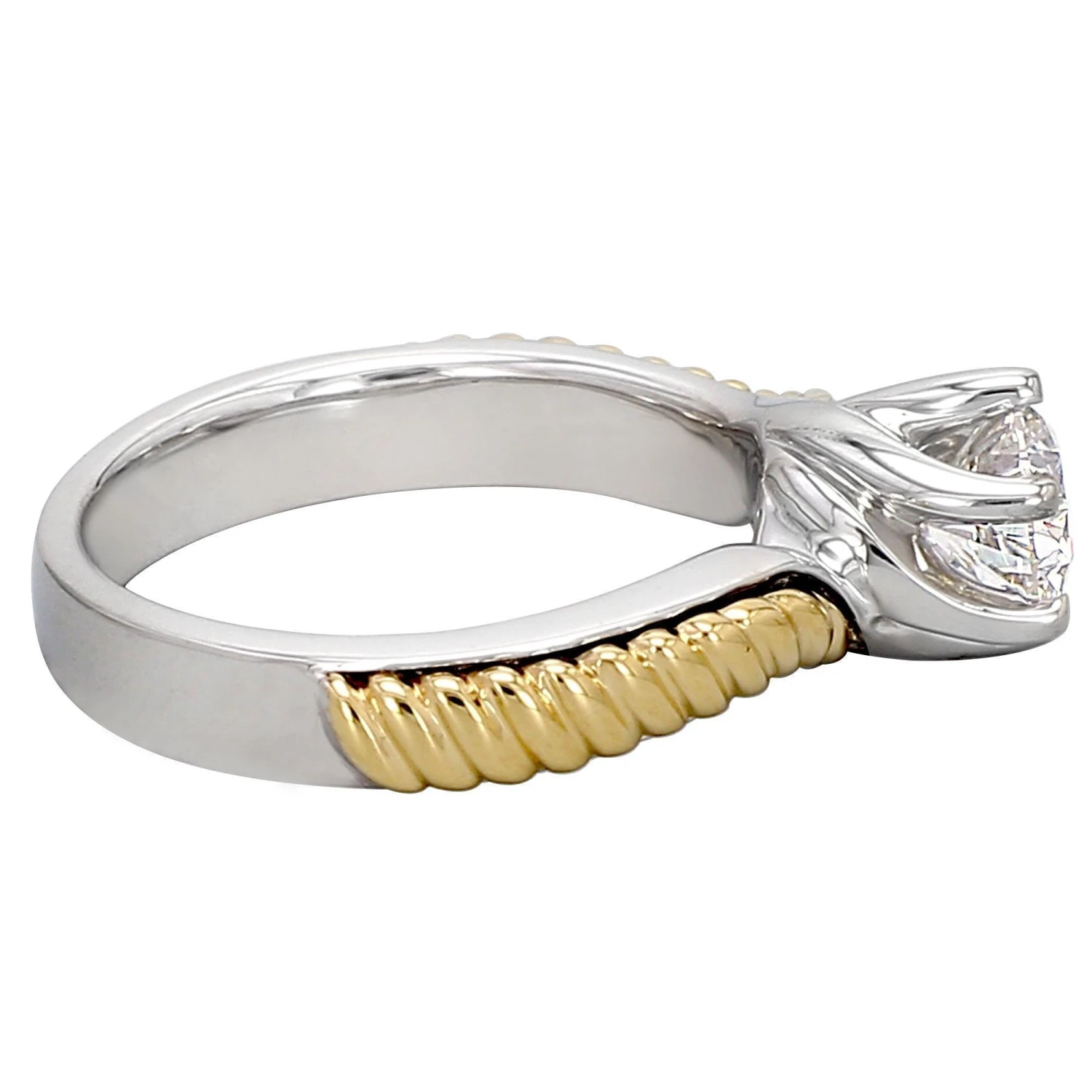 An exquisite choice that showcases a sparkling 1.00 carat round lab grown diamond solitaire in a timeless six prong solid setting merged into a polished sterling silver ring with an added flare of 18K yellow gold twist accent. The color is I-J with a clarity of VS-SI ranking. This ring is a simple yet versatile choice and one you can build upon. Traditional wedding bands on either side or other style, even custom made accompanying rings for a personal touch.