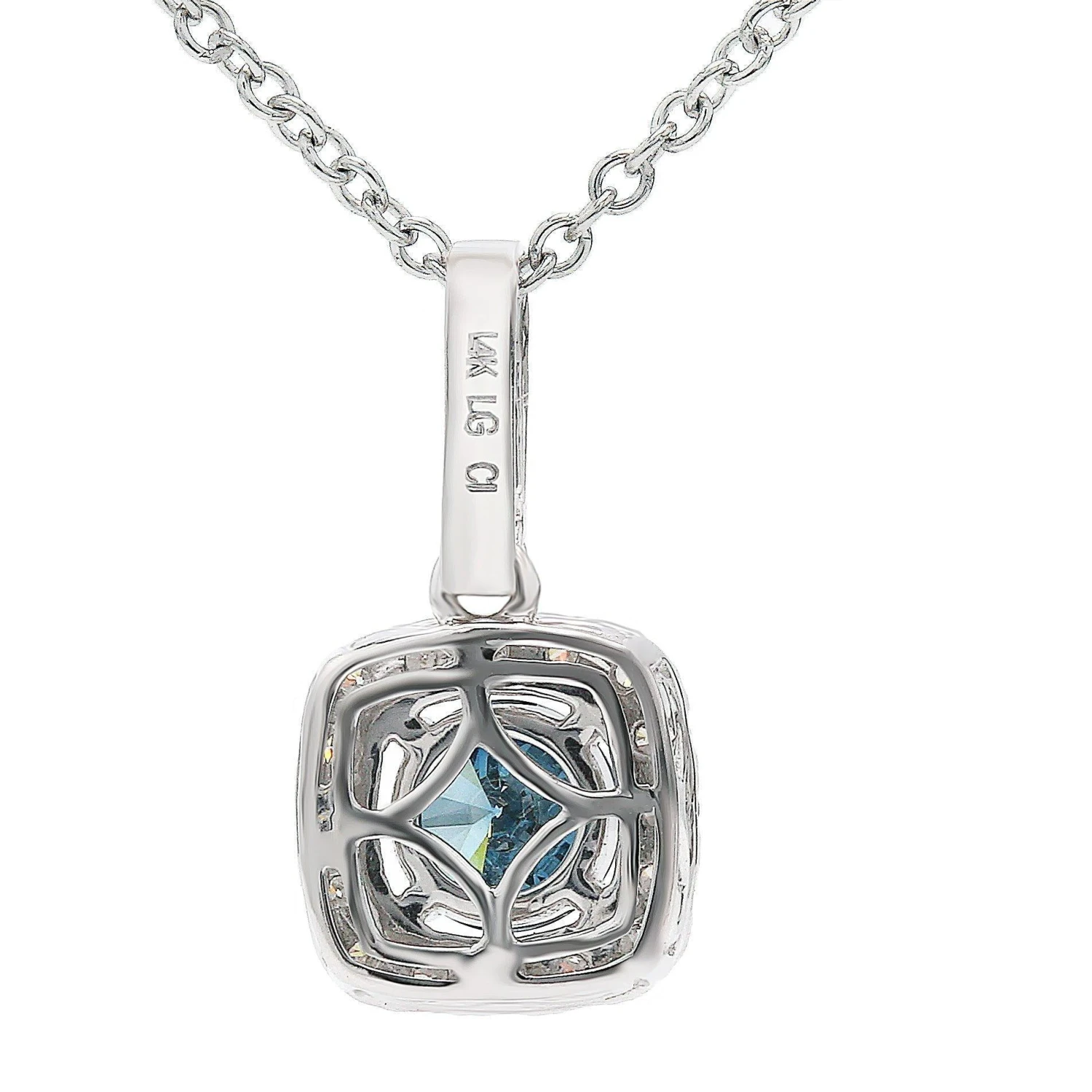 Something blue for your jewelry collection. The blue and white lab grown diamond pendant is crafted in 14K gold, This eye catching pendant features a 1 carat blue color lab diamond encased in a halo frame of shimmering F-G, VS-SI white lab diamonds totaling 1/2 carats, Dangling from a 16 inch chain with a two inch extension the 1 1/2 carat halo pendant will be a treasured piece in your jewelry collection.