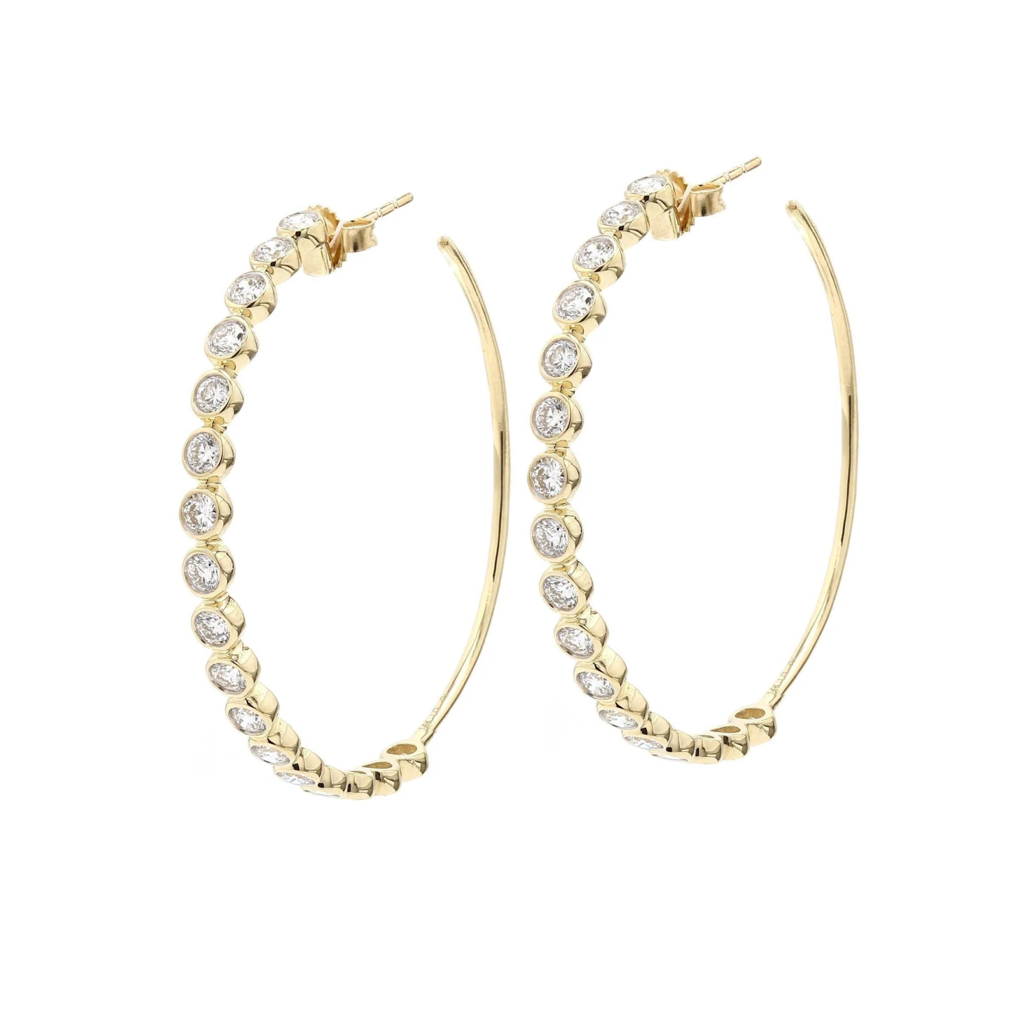 A bit of dazzle, these 14K yellow gold bezel set hoops are perfectly charming. 2.00 carat total weight of lab grown diamonds accent each earring along the front curve. The brilliant round cut lab grown diamonds have a F-G color and VS-SI clarity. These hoops have a bright polished shine and secure with butterfly backs.