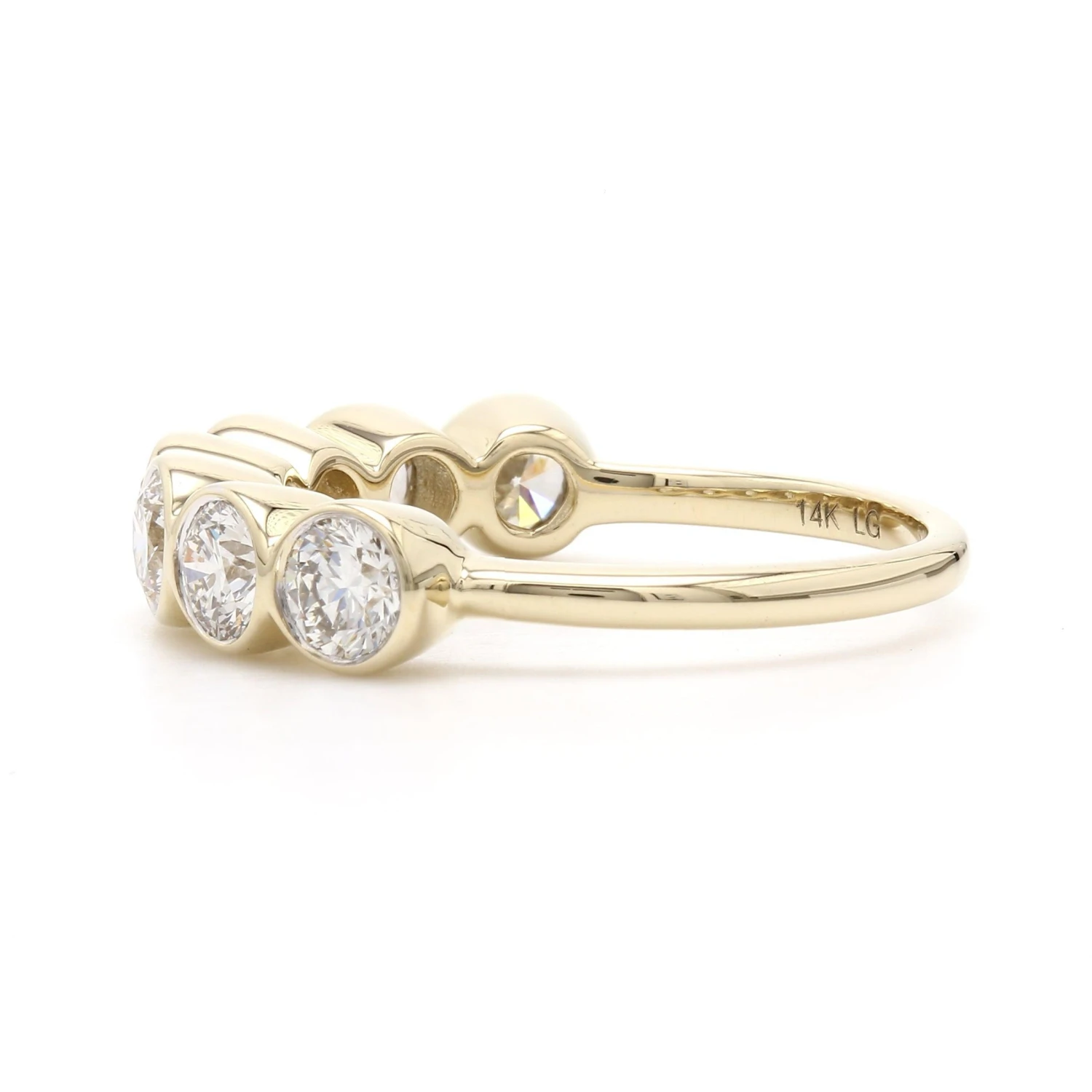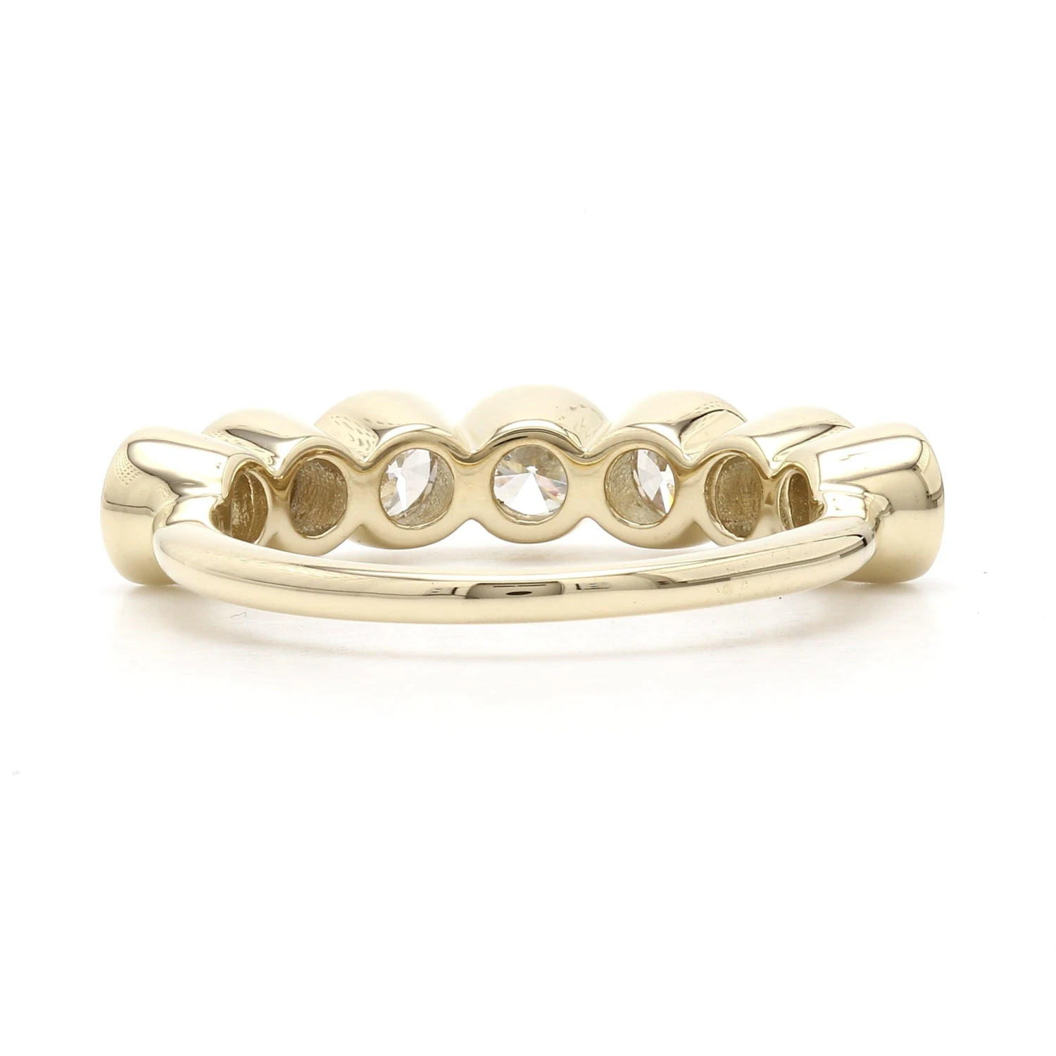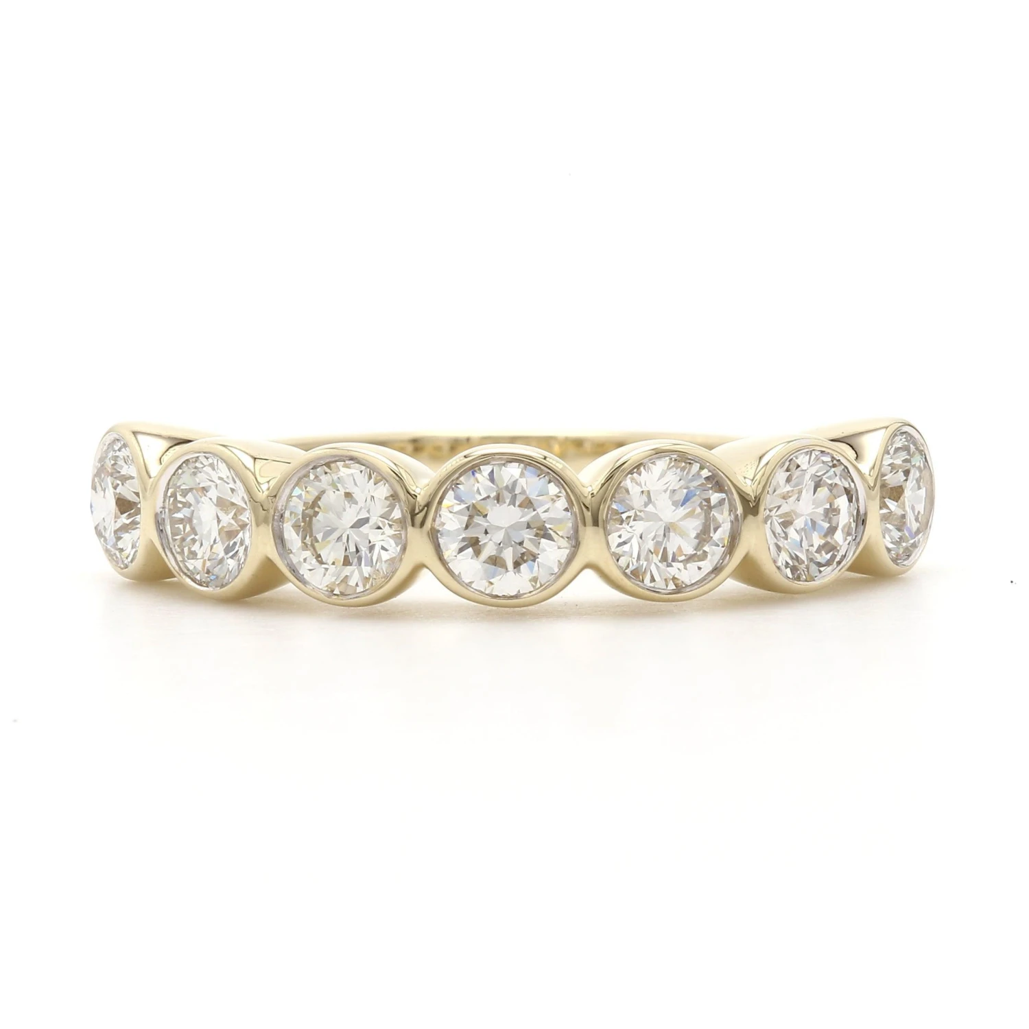 A simple and stylish ring that can be worn alone or stacked together to express your style, your family and your personality. Seven bezel set 1 1/2 carat total weight of lab-grown I-J VS-SI white diamonds, sculpted in 14K yellow gold.