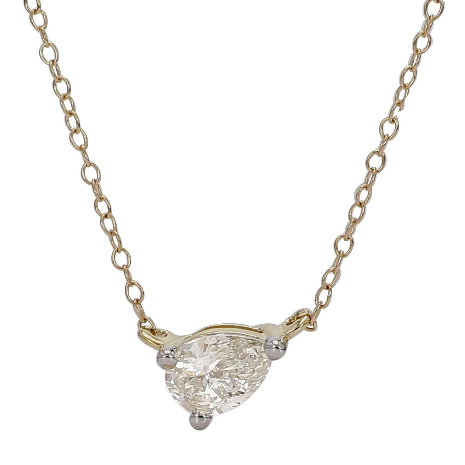 Simple enough to stand alone, the beauty of a lab grown diamond solitaire needs no accompaniment. This 3/4 carat pear shaped lab grown diamond necklace in 14K gold glistens with a color ranking of I-J and a clarity ranking of VS-SI. A stunning accessory that suspends along a 16-inch chain that has a two-inch extension. Giving it a little diversity for occasion worn and secures with a lobster clasp for ease of wear. Â