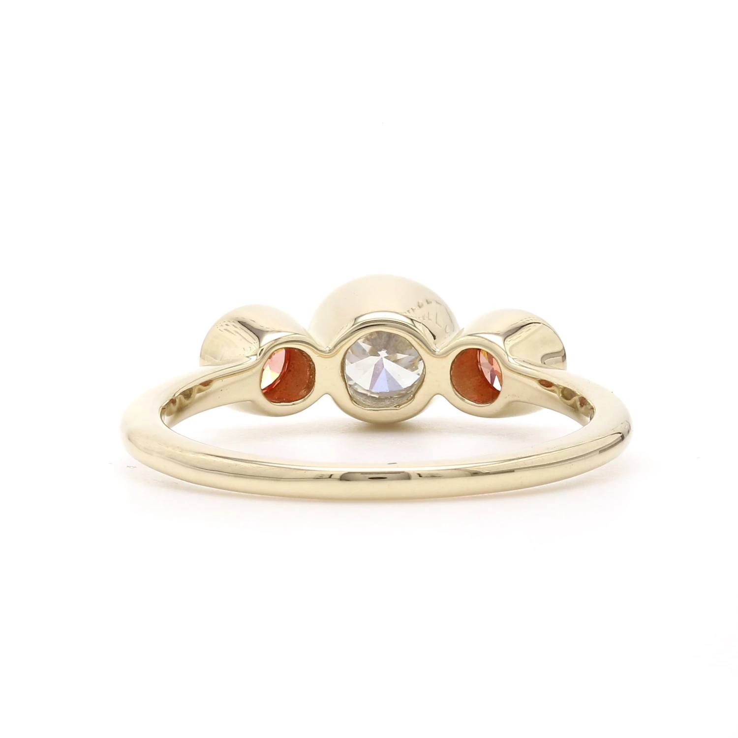 A contemporary choice for a beautiful three stone bezel ring. Sculpted in 14K yellow gold, this design features a trio of bezel set of two lab grown orange colored diamonds and one I-J VS-SI white lab grown diamond. Buffed to a brilliant luster, this artful look is a dazzling anytime choice.