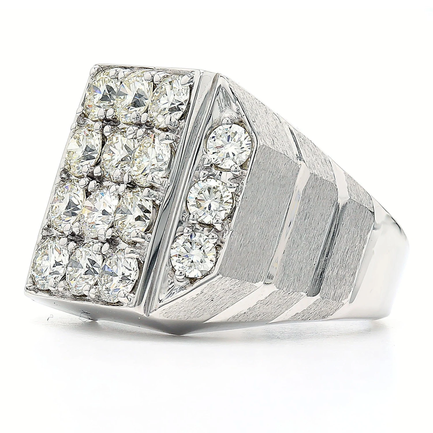A classic men’s lab grown diamond ring makes a great choice. Crafted in 14K gold, this stunning design features a satin finished channel design that showcases a 4.00 carat total weight of round I-J VS-SI lab grown diamonds.