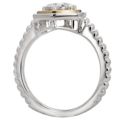 An exquisite choice that showcases a sparkling 1.00 carat round lab grown diamond solitaire set in a timeless bezel 18K yellow gold center that is elevated above an open polished sterling silver ring. The lab created diamond color is I-J with a clarity of VS-SI ranking. This ring is a simple yet versatile choice.Â