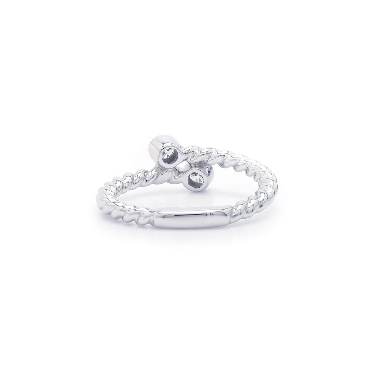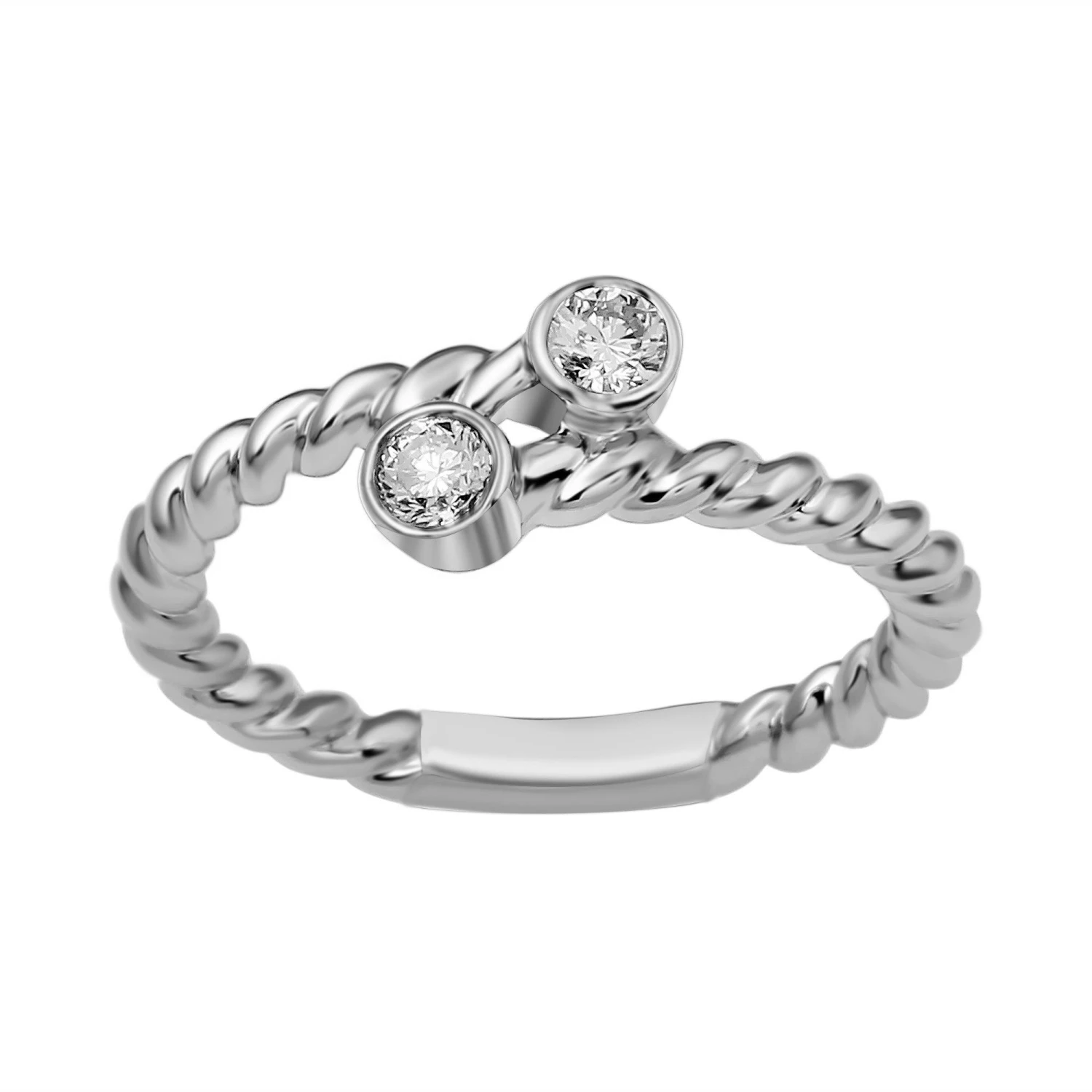 This sweet promise ring is a look of beauty. Gracefully swirling around two lab grown diamonds, this playful design sparkles with a bezel set F-G, VS-SI 1/5 carat total weight. A delightful look is certain to be treasured and with it’s rope swirl and stack-able design; it’s perfect for a “just because” band.