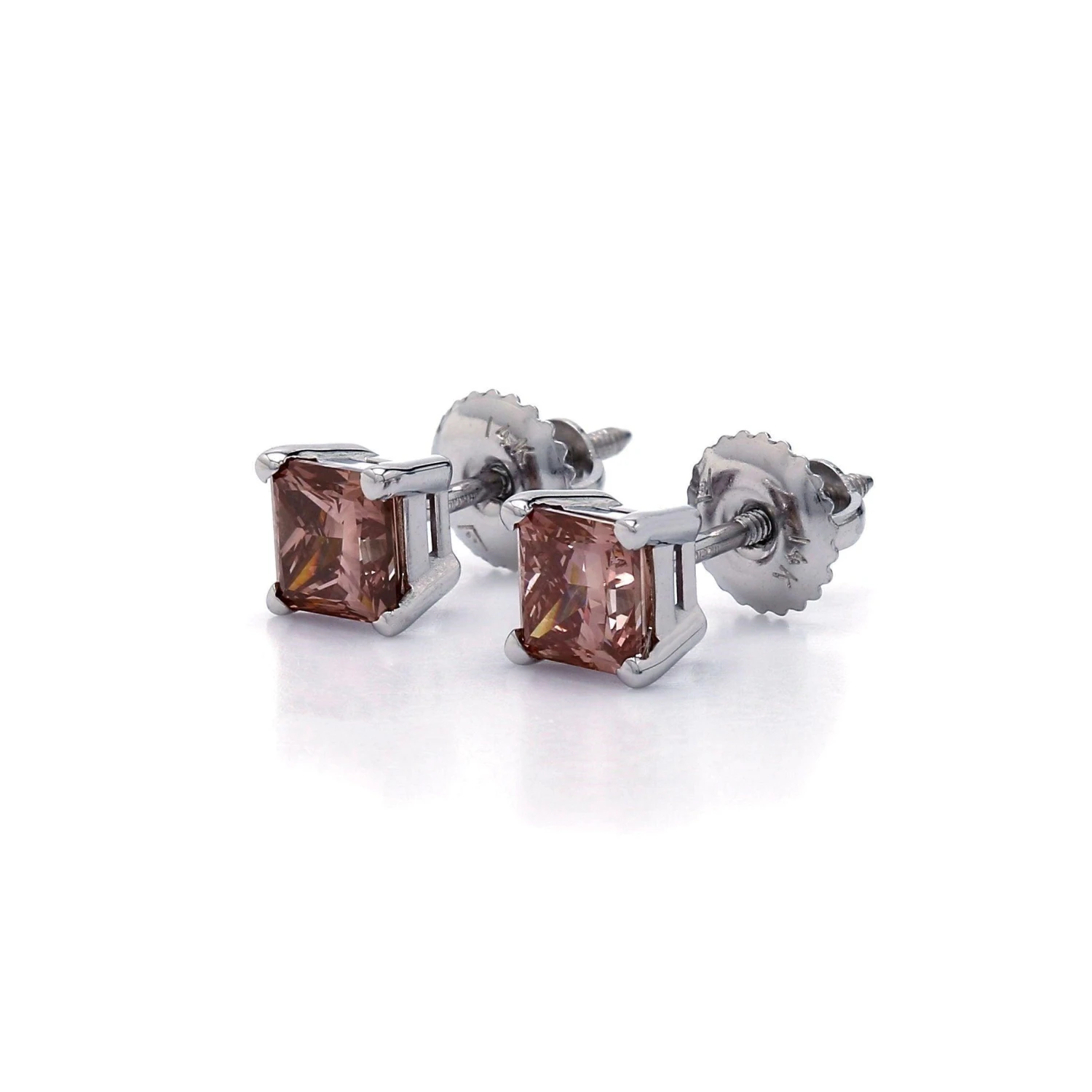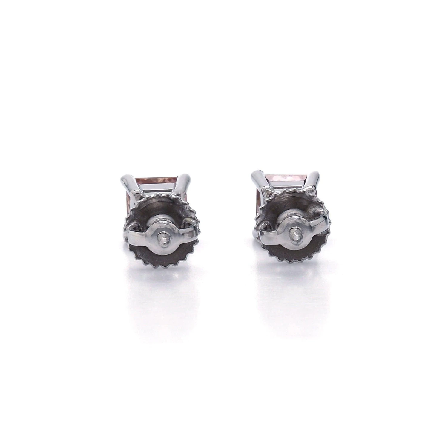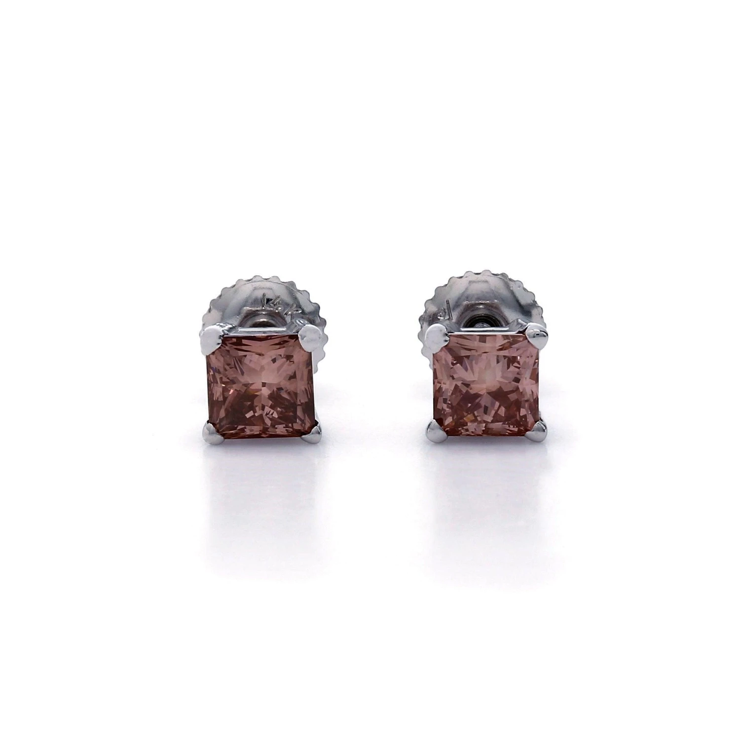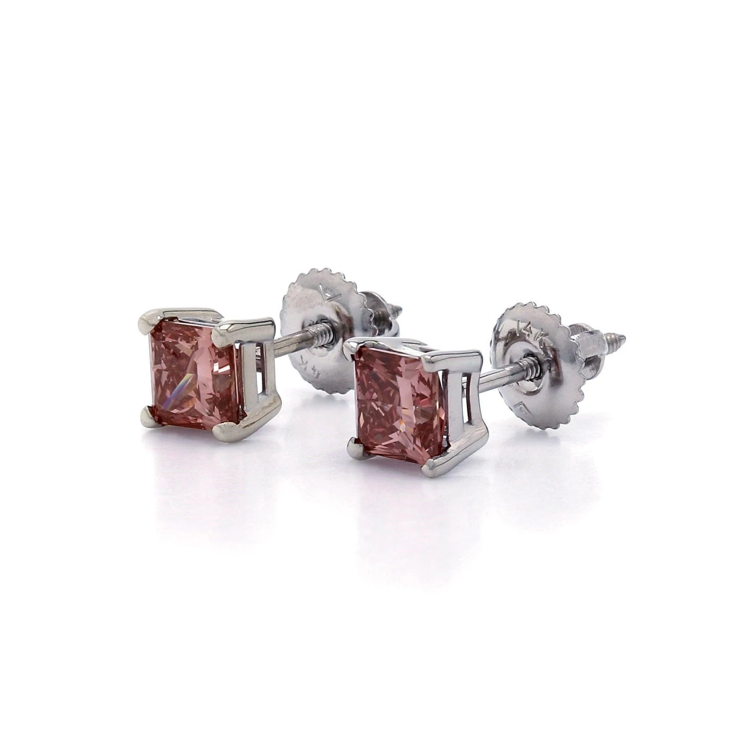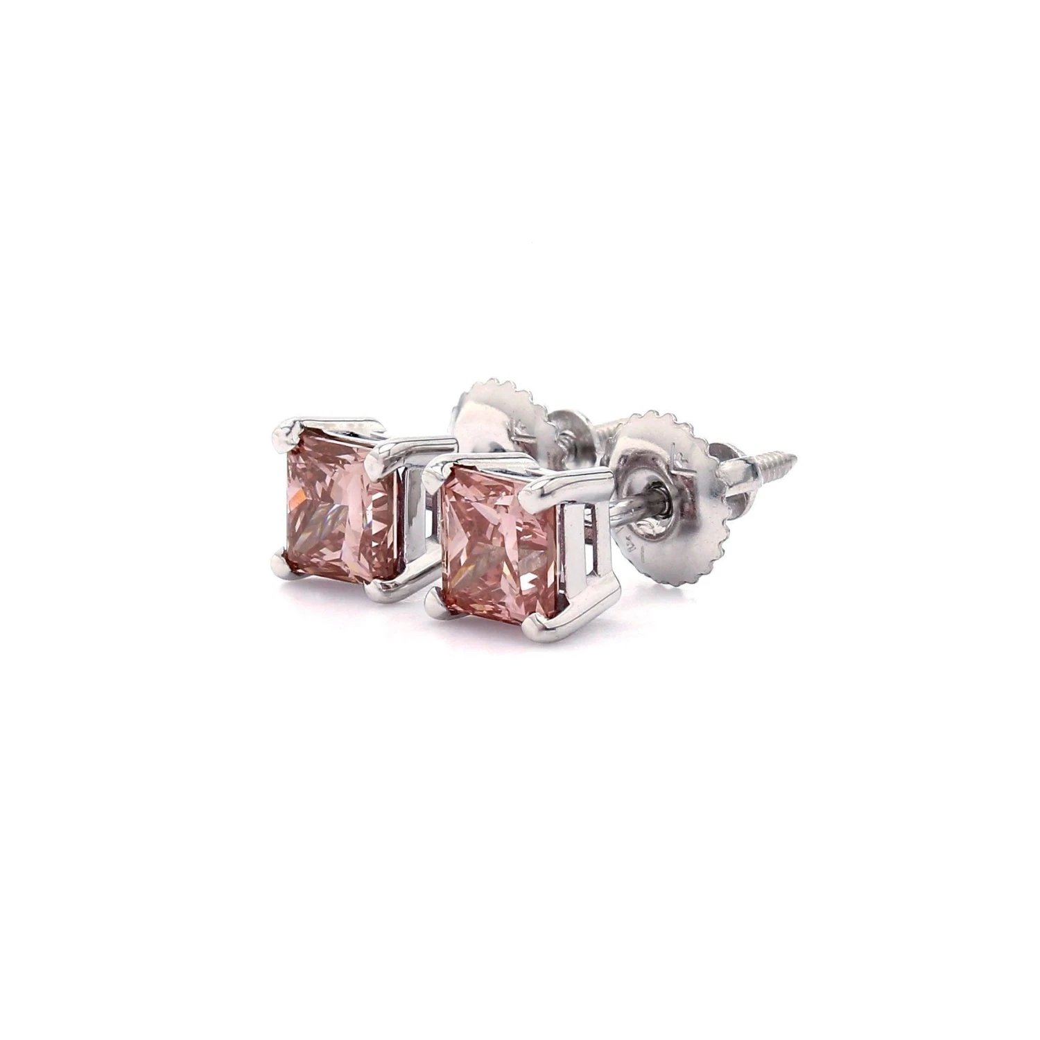Simple and classic this 1 1/2 carat total weight lab grown purple color diamond solitaire stud earrings are perfect for everyday wear. The solitaires are set in a four prong basket style 14K white gold post setting with screw back closures. These beautiful earrings can stand alone or have an earring jacket to dress them up, extremely versatile and fit into any wardrobe and complement any occasion.Â