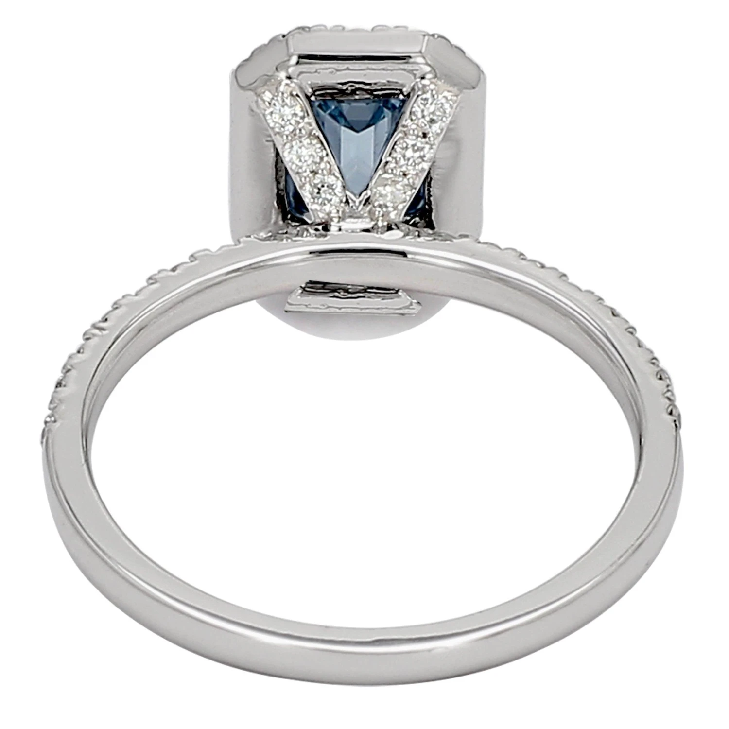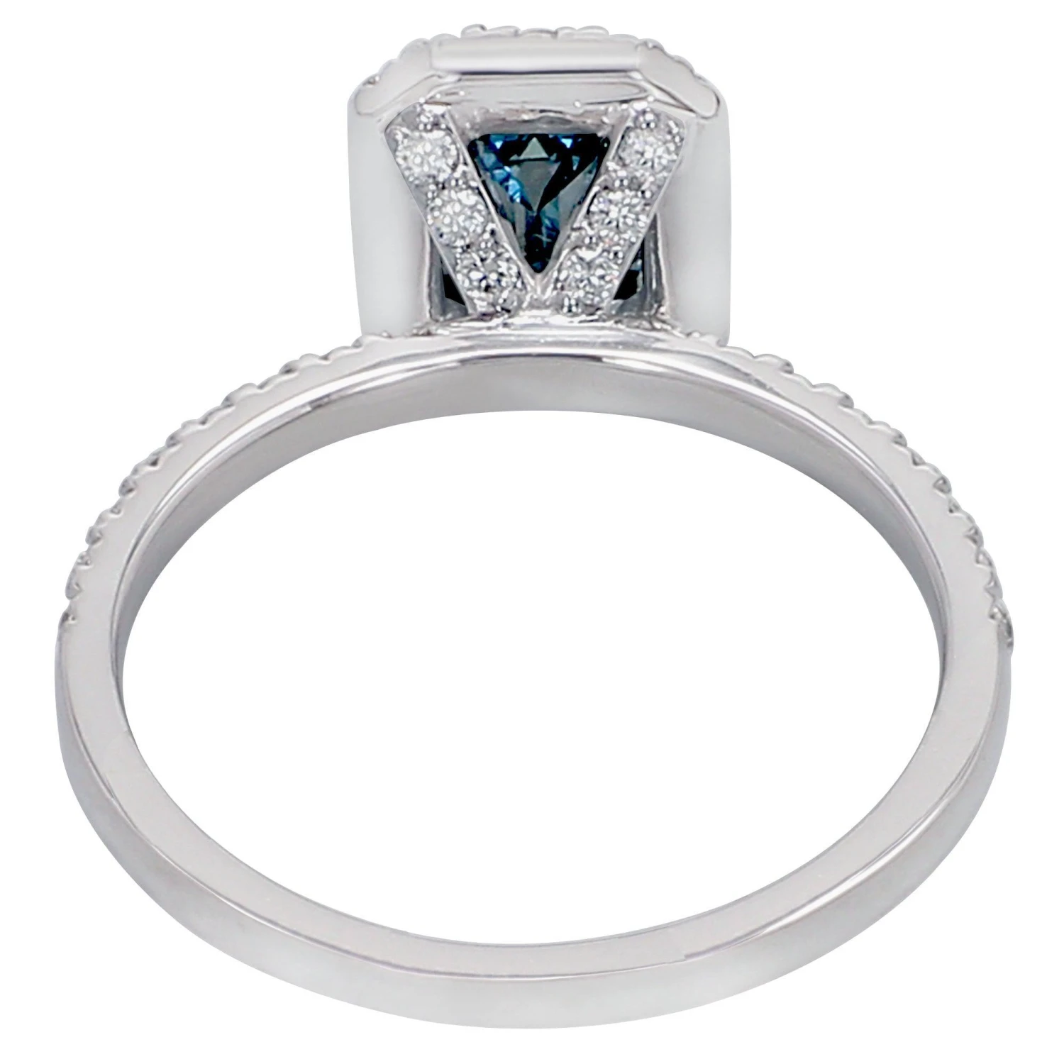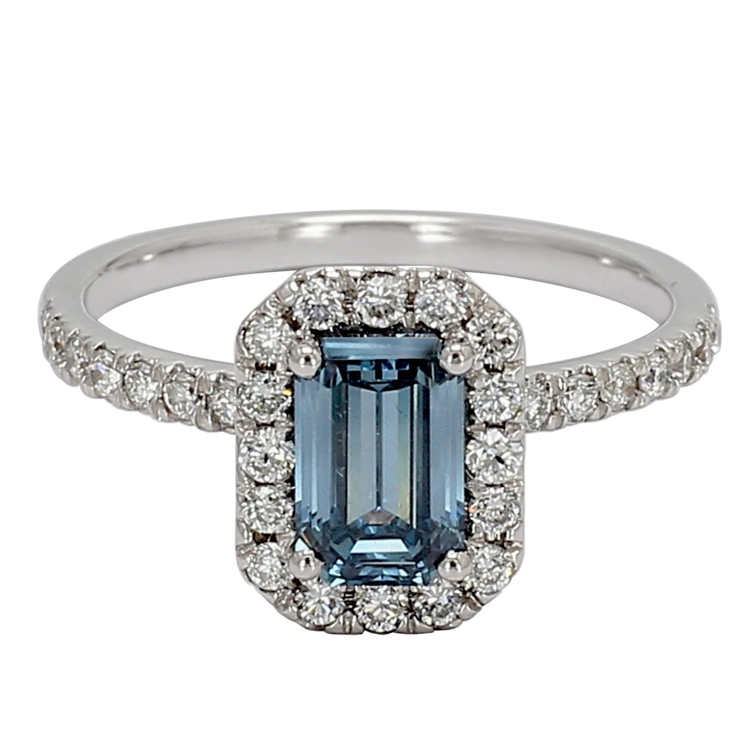 The Suzanne Ring is a beautiful statement of your love and commitment. Combined with a minimum 1.10 carat lab-created blue diamond center stone in an emerald cut, complemented by F-G VS-SI white diamonds flowing around the halo and down the shank give this ring its 1.70 Ct. T.W. The diamond accents create a luxurious and timeless look, perfect for a memorable engagement.
