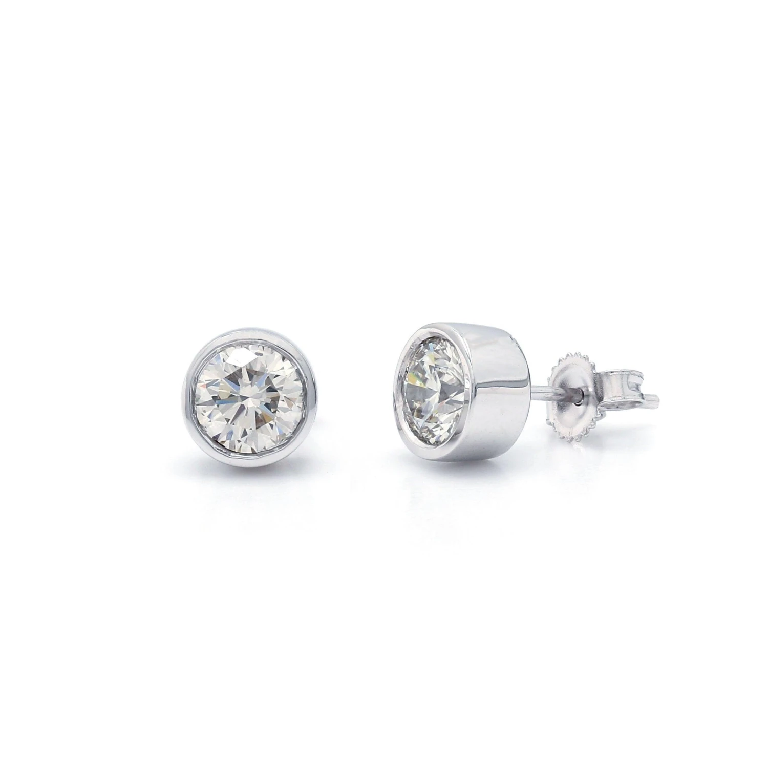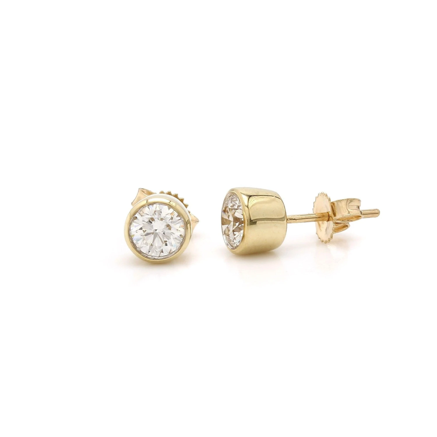 Make a wonderful impression with these beautiful bezel set stud earrings. Crafted in 14K gold, each breathtaking earring features lustrous I-J, VS-SI center lab grown diamond for a 1 1/4 carat total weight combined, Polished to a bright shine, these post earrings secure comfortably with friction backs.These beautiful earrings can stand alone or have an earring jacket to dress them up, extremely versatile and fit into any wardrobe and complement any occasion.