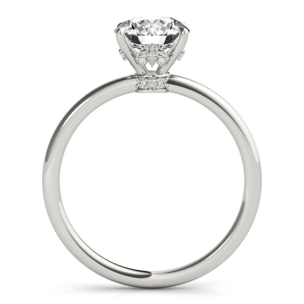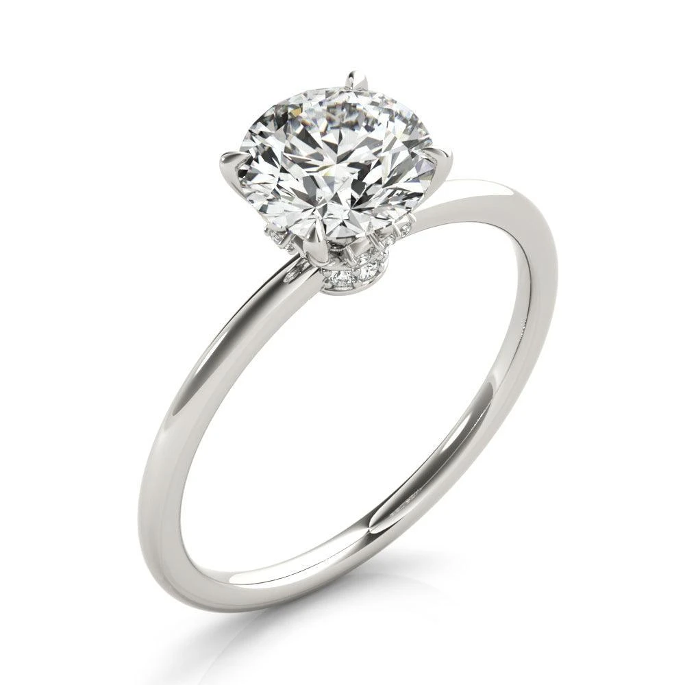 This stunning Vintage Sadie 1/2 carat lab grown round diamond in K VS color/clarity features 1/15Ct. T.W lab-grown diamond accents in a hidden halo for a beautiful, timeless brilliance and sparkle. Expertly crafted to last for generations, this engagement ring is the perfect way to add a vintage flare to this special occasion. This warm K color center diamond comes in faint yellow and light brown earth tones. It’s off white tone gives it that vintage look.